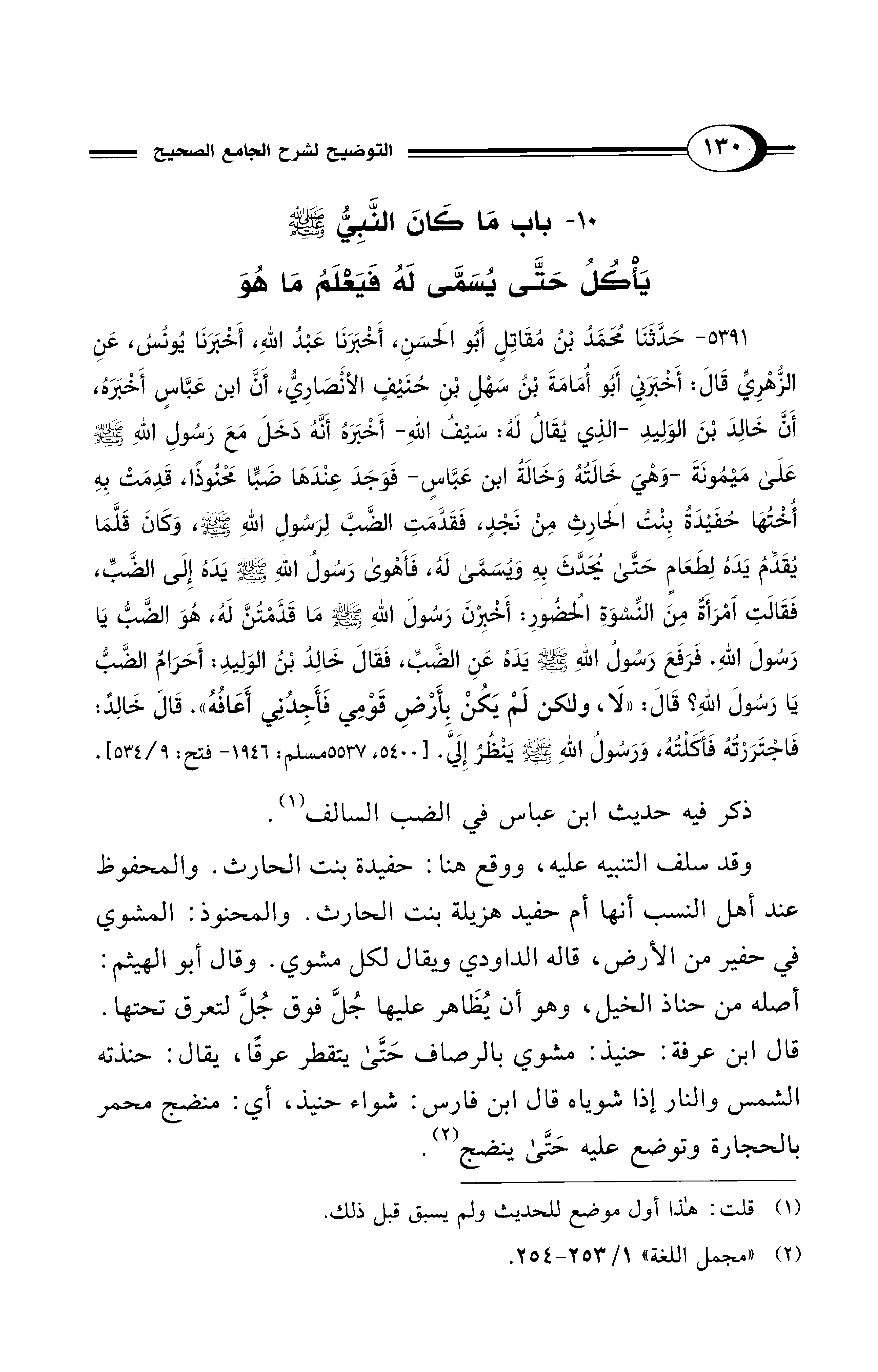 5391 - حَدَّثَنَا مُحَمَّدُ بْنُ مُقَاتِلٍ أَبُو الْحَسَنِ، أَخْبَرَنَا عَبْدُ اللهِ، أَخْبَرَنَا يُونُسُ، عَنِ الزُّهْرِيِّ قَالَ: أَخْبَرَنِي أَبُو أُمَامَةَ بْنُ سَهْلِ بْنِ حُنَيْفٍ الأَنْصَاريُّ، أَنَّ ابْنَ عَبَّاسٍ أَخْبَرَهُ، أَنَّ خَالِدَ بْنَ الْوَلِيدِ -الَّذِي يُقَالُ لَهُ: سَيْفُ اللهِ- أَخْبَرَهُ أَنَّهُ دَخَلَ مَعَ رَسُولِ اللهِ - صلى الله عليه وسلم - عَلَى مَيْمُونَةَ -وَهْيَ خَالَتُهُ وَخَالَةُ ابْنِ عَبَّاسٍ- فَوَجَدَ عِنْدَهَا ضَبًّا مَحْنُوذًا، قَدِمَتْ بِهِ أُخْتُهَا حُفَيْدَةُ بِنْتُ الْحَارِثِ مِنْ نَجْدٍ، فَقَدَّمَتِ الضَّبَّ لِرَسُولِ اللهِ - صلى الله عليه وسلم -، وَكَانَ قَلَّمَا يُقَدِّمُ يَدَهُ لِطَعَامٍ حَتَّى يُحَدَّثَ بِهِ وَيُسَمَّى لَهُ، فَأَهْوَى رَسُولُ اللهِ - صلى الله عليه وسلم - يَدَهُ إِلَى الضَّبِّ، فَقَالَتِ امْرَأَةٌ مِنَ النِّسْوَةِ الْحُضُورِ: أَخْبِرْنَ رَسُولَ اللهِ - صلى الله عليه وسلم - مَا قَدَّمْتُنَّ لَهُ، هُوَ الضَّبُّ يَا رَسُولَ اللهِ. فَرَفَعَ رَسُولُ اللهِ - صلى الله عليه وسلم - يَدَهُ عَنِ الضَّبِّ، فَقَالَ خَالِدُ بْنُ الْوَلِيدِ: أَحَرَامٌ الضَّبُّ يَا رَسُولَ اللهِ؟ قَالَ: «لاَ، وَلَكِنْ لَمْ يَكُنْ بِأَرْضِ قَوْمِي فَأَجِدُنِي أَعَافُهُ». قَالَ خَالِدٌ: فَاجْتَرَرْتُهُ فَأَكَلْتُهُ وَرَسُولُ اللهِ - صلى الله عليه وسلم - يَنْظُرُ إِلَيَّ. [5400، 5537 - مسلم: 1946 - فتح: 9/ 534].