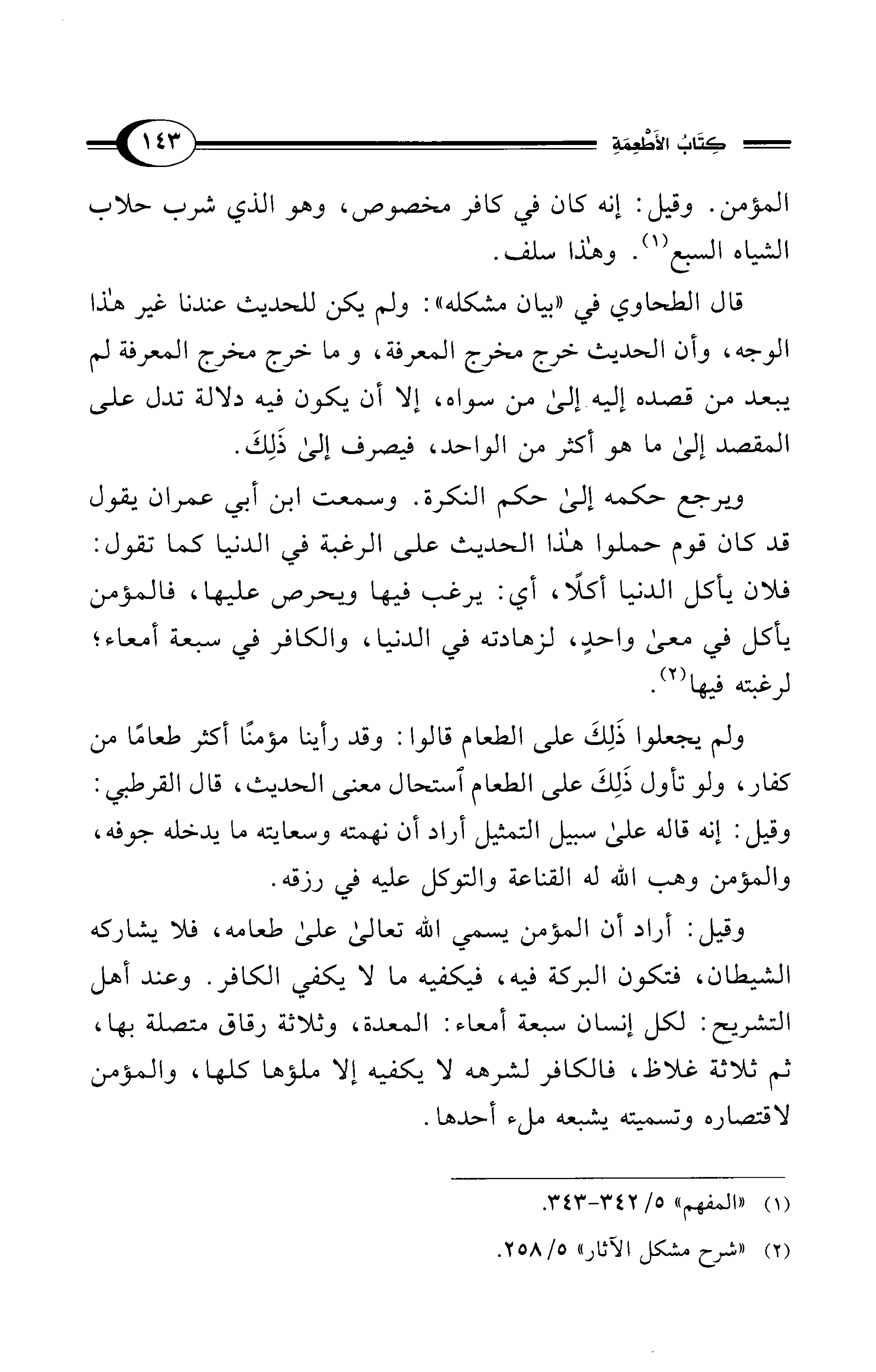 ولم يجعلوا ذَلِكَ على الطعام قالوا: وقد رأينا مؤمنًا أكثر طعامًا من كفار، ولو تأول ذَلِكَ على الطعام استحال معنى الحديث، قال القرطبي: وقيل: إنه قاله على سبيل التمثيل أراد أن نهمته وسعايته ما يدخله جوفه، والمؤمن وهب الله له القناعة والتوكل عليه في رزقه.