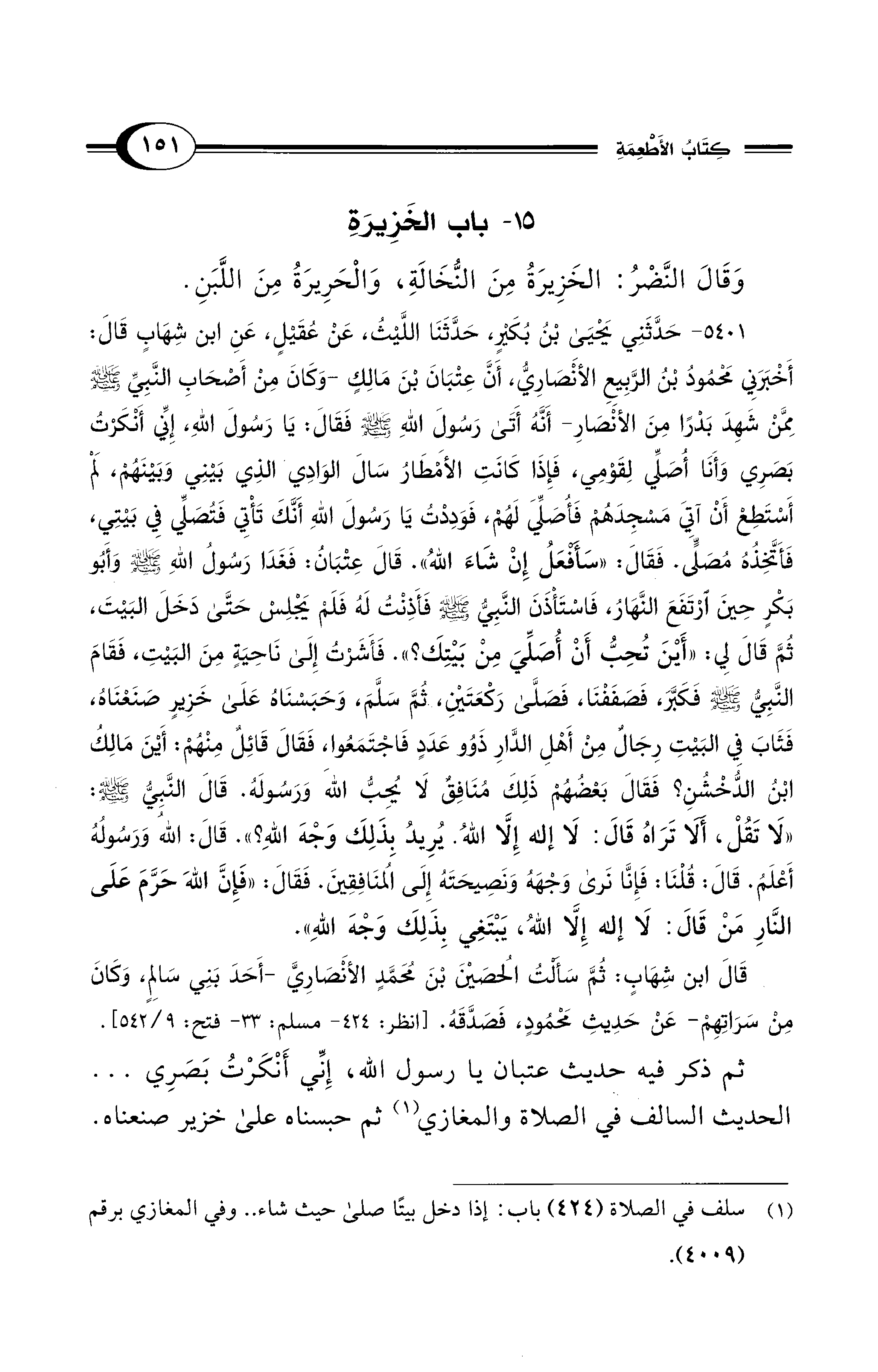 5401 - حَدَّثَنِي يَحْيَى بْنُ بُكَيْرٍ، حَدَّثَنَا اللَّيْثُ، عَنْ عُقَيْلٍ، عَنِ ابْنِ شِهَابٍ قَالَ: أَخْبَرَنِي مَحْمُودُ بْنُ الرَّبِيعِ الأَنْصَاريُّ، أَنَّ عِتْبَانَ بْنَ مَالِكٍ -وَكَانَ مِنْ أَصْحَابِ النَّبِيِّ - صلى الله عليه وسلم - مِمَّنْ شَهِدَ بَدْرًا مِنَ الأَنْصَارِ- أَنَّهُ أَتَى رَسُولَ اللهِ - صلى الله عليه وسلم - فَقَالَ: يَا رَسُولَ اللهِ، إِنِّي أَنْكَرْتُ بَصَرِي وَأَنَا أُصَلِّي لِقَوْمِي، فَإِذَا كَانَتِ الأَمْطَارُ سَالَ الْوَادِي الَّذِي بَيْنِي وَبَيْنَهُمْ، لَمْ أَسْتَطِعْ أَنْ آتِيَ مَسْجِدَهُمْ فَأُصَلِّيَ لَهُمْ، فَوَدِدْتُ يَا رَسُولَ اللهِ أَنَّكَ تَأْتِي فَتُصَلِّي فِي بَيْتِي، فَأَتَّخِذُهُ مُصَلًّى. فَقَالَ: «سَأَفْعَلُ إِنْ شَاءَ اللهُ». قَالَ عِتْبَانُ: فَغَدَا رَسُولُ اللهِ - صلى الله عليه وسلم - وَأَبُو بَكْرٍ حِينَ ارْتَفَعَ النَّهَارُ، فَاسْتَأْذَنَ النَّبِيُّ - صلى الله عليه وسلم - فَأَذِنْتُ لَهُ فَلَمْ يَجْلِسْ حَتَّى دَخَلَ الْبَيْتَ، ثُمَّ قَالَ لِي: «أَيْنَ تُحِبُّ أَنْ أُصَلِّيَ مِنْ بَيْتِكَ؟». فَأَشَرْتُ إِلَى نَاحِيَةٍ مِنَ الْبَيْتِ، فَقَامَ النَّبِيُّ - صلى الله عليه وسلم - فَكَبَّرَ، فَصَفَفْنَا، فَصَلَّى رَكْعَتَيْنِ، ثُمَّ سَلَّمَ، وَحَبَسْنَاهُ على خَزِيرٍ صَنَعْنَاهُ، فَثَابَ فِي الْبَيْتِ رِجَالٌ مِنْ أَهْلِ الدَّارِ ذَوُو عَدَدٍ فَاجْتَمَعُوا، فَقَالَ قَائِلٌ مِنْهُمْ: أَيْنَ مَالِكُ بْنُ الدُّخْشُنِ؟ فَقَالَ بَعْضُهُمْ ذَلِكَ مُنَافِقٌ لاَ يُحِبُّ اللهَ وَرَسُولَهُ. قَالَ النَّبِيُّ - صلى الله عليه وسلم -: «لاَ تَقُلْ، أَلاَ تَرَاهُ قَالَ: لاَ إِلَهَ إِلاَّ اللهُ. يُرِيدُ بِذَلِكَ وَجْهَ اللهِ؟». قَالَ: اللهُ وَرَسُولُهُ أَعْلَمُ. قَالَ: قُلْنَا: فَإِنَّا نَرَى وَجْهَهُ وَنَصِيحَتَهُ إِلَى الْمُنَافِقِينَ. فَقَالَ: «فَإِنَّ اللهَ حَرَّمَ على النَّارِ مَنْ قَالَ: لاَ إِلَهَ إِلاَّ اللهُ، يَبْتَغِى بِذَلِكَ وَجْهَ اللهِ».