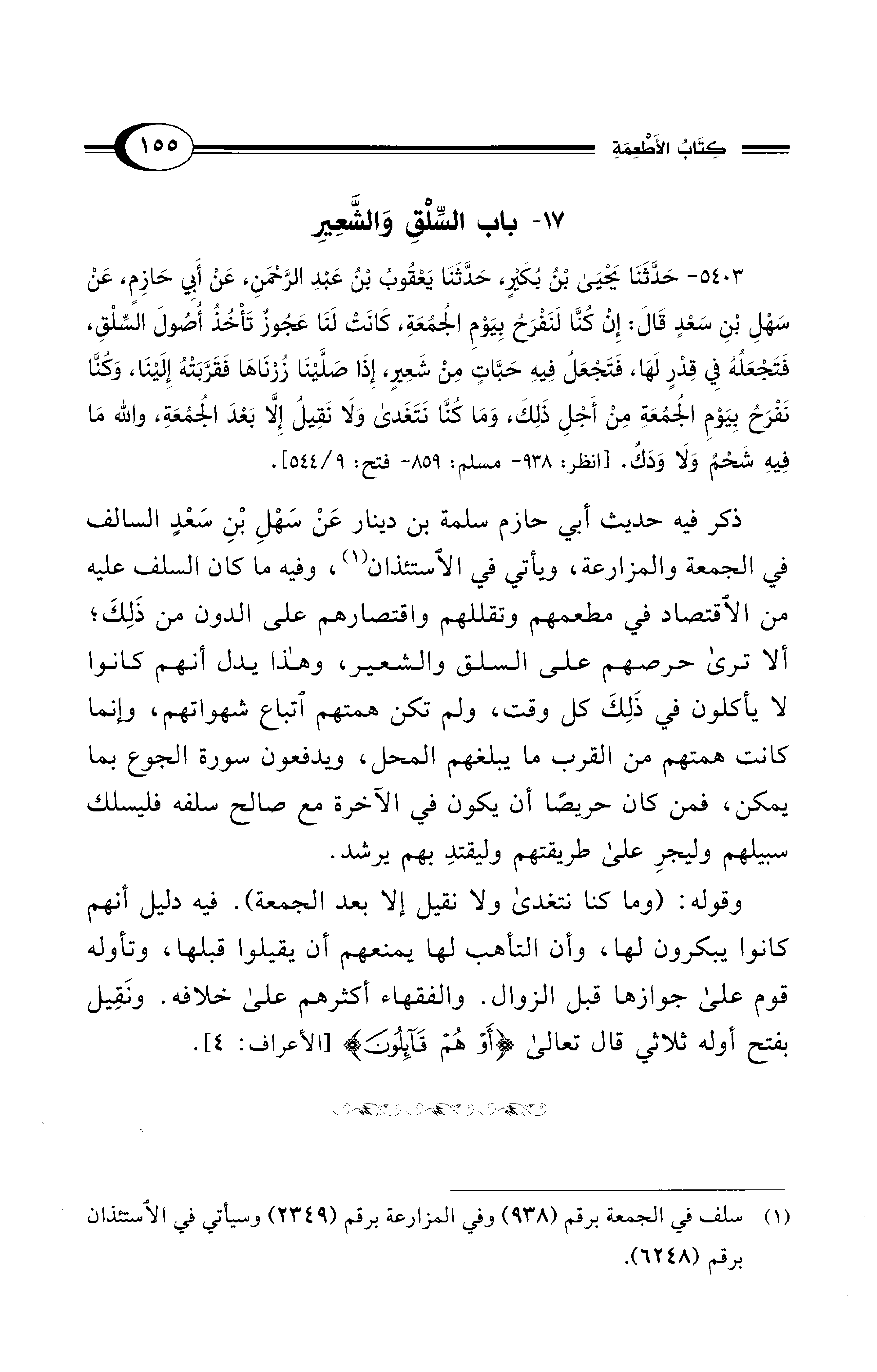 5403 - حَدَّثَنَا يَحْيَى بْنُ بُكَيْرٍ، حَدَّثَنَا يَعْقُوبُ بْنُ عَبْدِ الرَّحْمَنِ، عَنْ أَبِي حَازِمٍ، عَنْ سَهْلِ بْنِ سَعْدٍ قَالَ: إِنْ كُنَّا لَنَفْرَحُ بِيَوْمِ الْجُمُعَةِ، كَانَتْ لَنَا عَجُوزٌ تَأْخُذُ أُصُولَ السِّلْقِ، فَتَجْعَلُهُ فِي قِدْرٍ لَهَا، فَتَجْعَلُ فِيهِ حَبَّاتٍ مِنْ شَعِيرٍ، إِذَا صَلَّيْنَا زُرْنَاهَا فَقَرَّبَتْهُ إِلَيْنَا، وَكُنَّا نَفْرَحُ بِيَوْمِ الْجُمُعَةِ مِنْ أَجْلِ ذَلِكَ، وَمَا كُنَّا نَتَغَدَّى وَلاَ نَقِيلُ إِلاَّ بَعْدَ الْجُمُعَةِ، وَاللهِ مَا فِيهِ شَحْمٌ وَلاَ وَدَكٌ. [انظر: 938 - مسلم: 859 - فتح: 9/ 544].