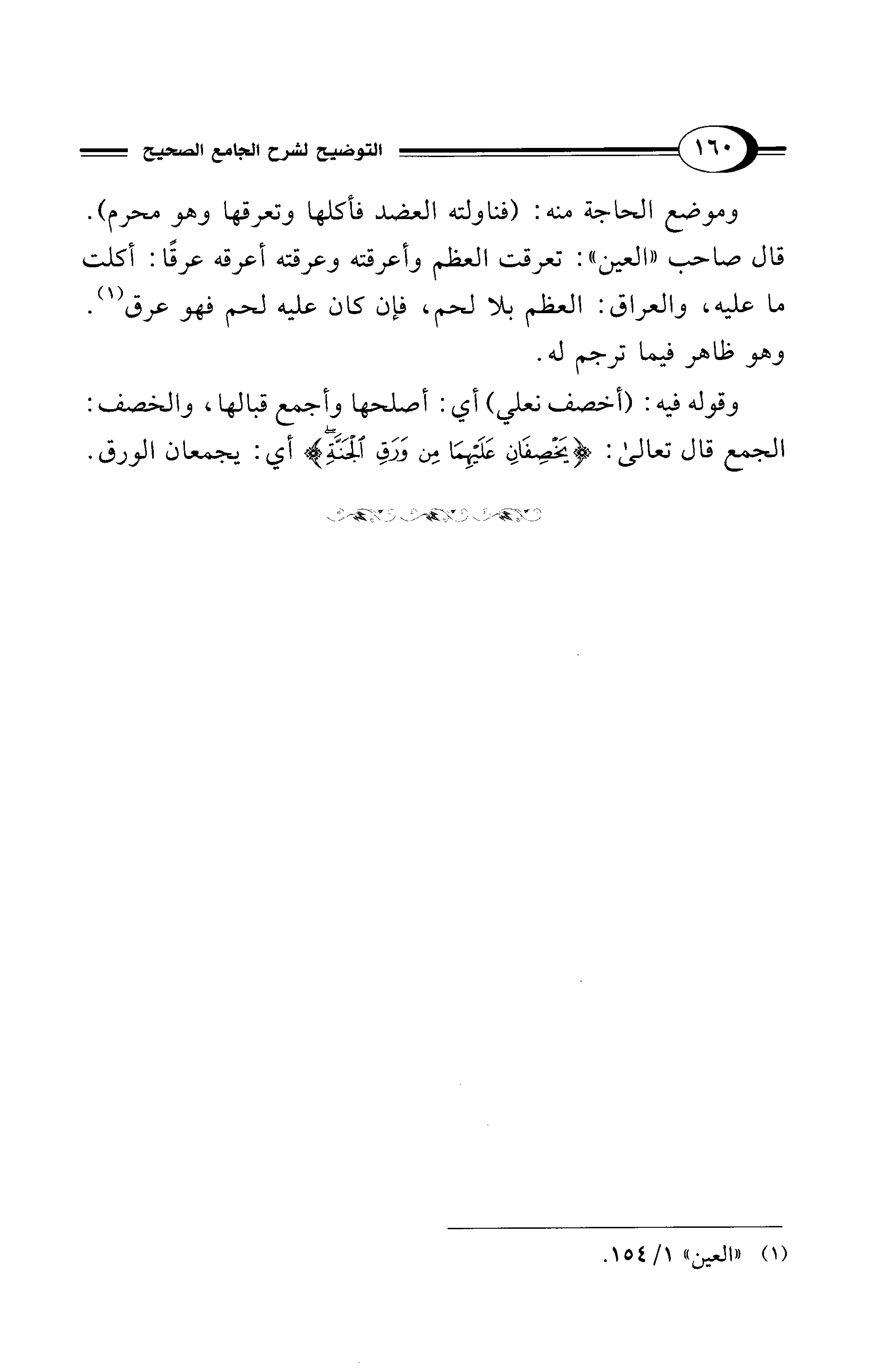 قال صاحب "العين": تعرقت العظم وأعرقته وعرقته أعرقه عرقًا: أكلت ما عليه، والعراق: العظم بلا لحم، فإن كان عليه لحم فهو عرق (¬1). وهو ظاهر فيما ترجم له.