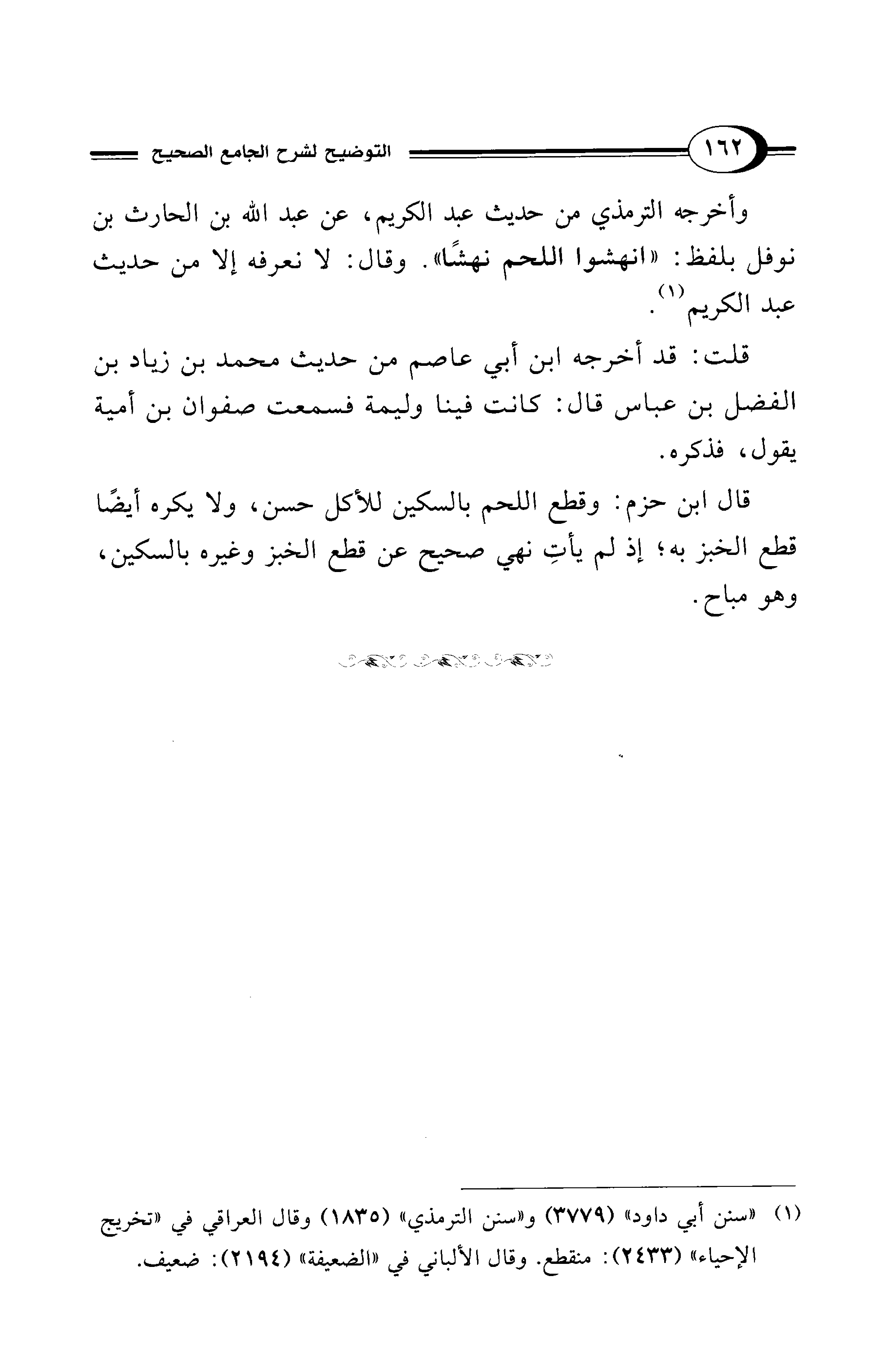 وأخرجه الترمذي من حديث عبد الكريم، عن عبد الله بن الحارث بن نوفل بلفظ: "انهشوا اللحم نهشًا". وقال: لا نعرفه إلا من حديث عبد الكريم (¬1).