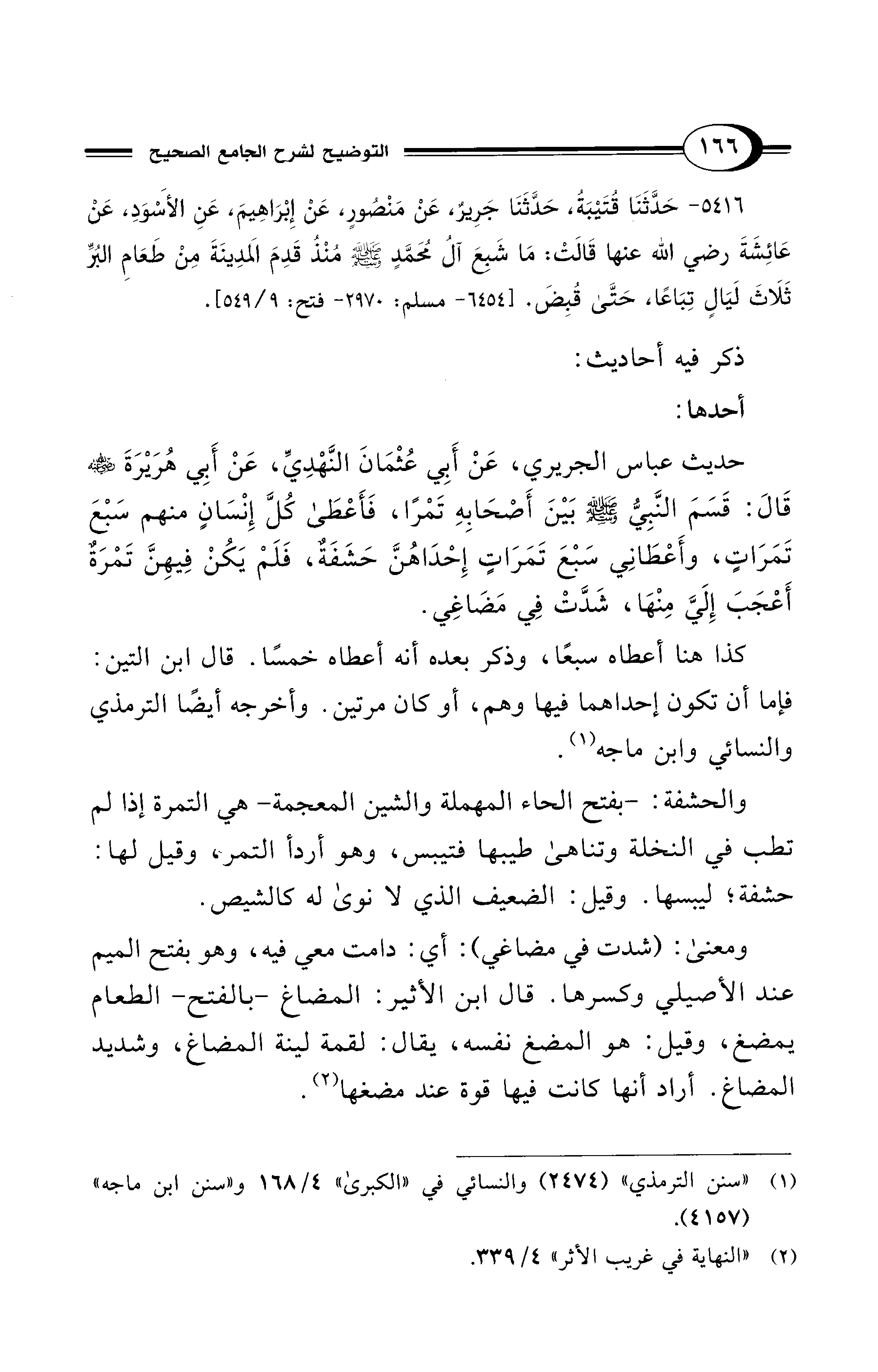 حديث عباس الجريري، عَنْ أَبِي عُثْمَانَ النَّهْدِيِّ، عَنْ أَبِي هُرَيْرَةَ - رضي الله عنه - قَالَ: قَسَمَ النَّبِيُّ - صلى الله عليه وسلم - بَيْنَ أَصْحَابِهِ تَمْرًا، فَأَعْطَى كُلَّ إِنْسَانٍ منهم سَبْعَ تَمَرَاتٍ، وأَعْطَانِي سَبْعَ تَمَرَاتٍ إِحْدَاهُنَّ حَشَفَةٌ، فَلَمْ يَكُنْ فِيهِنَّ تَمْرَةٌ أَعْجَبَ إِلَيَّ مِنْهَا، شَدَّتْ فِي مَضَاغِي.