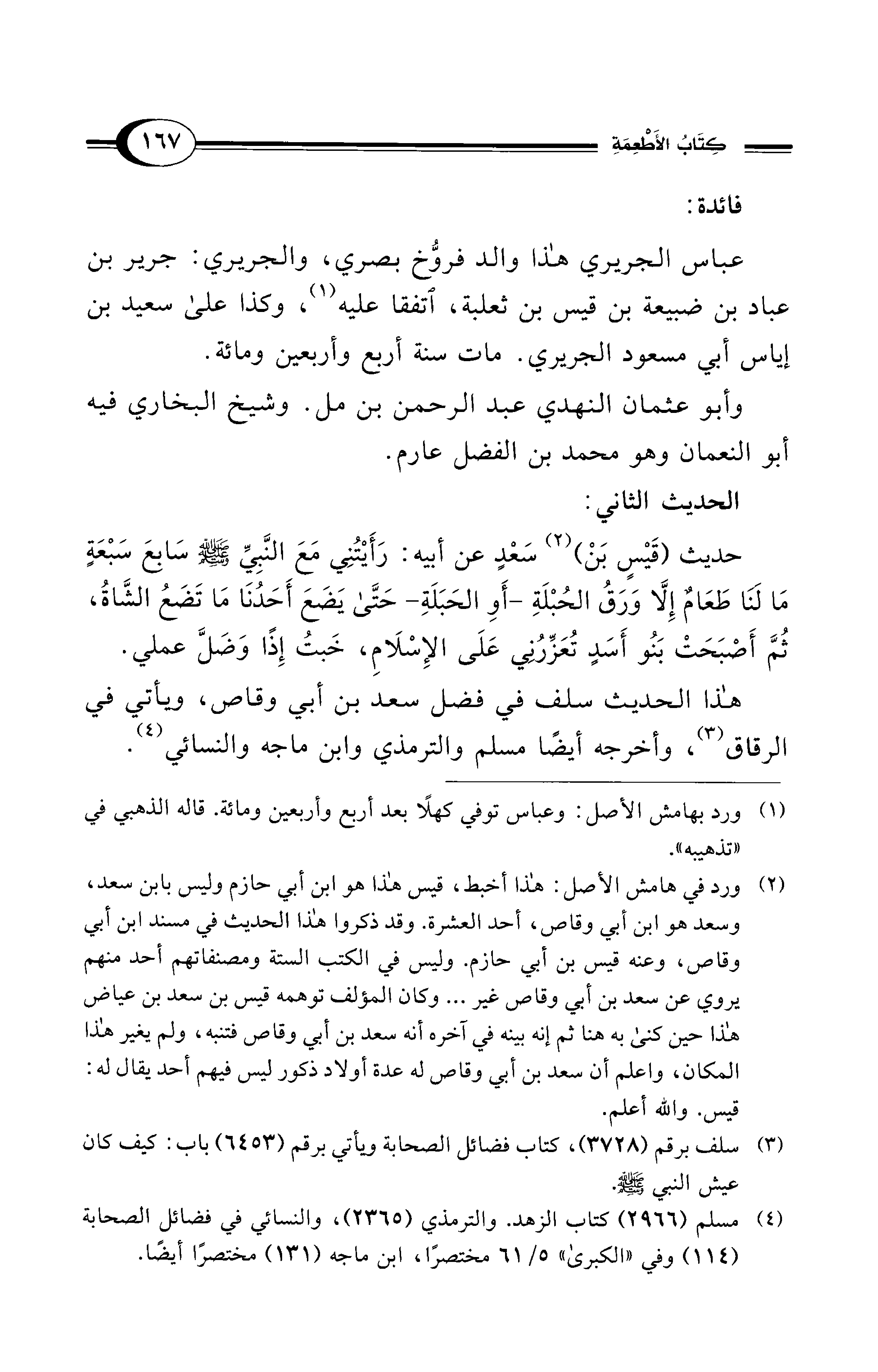 (¬2) ورد في هامش الأصل: هذا أخبط، قيس هذا هو ابن أبي حازم وليس بابن سعد، وسعد هو ابن أبي وقاص، أحد العشرة. وقد ذكروا هذا الحديث في مسند ابن أبي وقاص، وعنه قيس بن أبي حازم. وليس في الكتب الستة ومصنفاتهم أحد منهم يروي عن سعد بن أبي وقاص غير ... وكان المؤلف توهمه قيس بن سعد بن عياض هذا حين كنى به هنا ثم إنه بينه في آخره أنه سعد بن أبي وقاص فتنبه، ولم يغير هذا المكان، واعلم أن سعد بن أبي وقاص له عدة أولاد ذكور ليس فيهم أحد يقال له: قيس. والله أعلم.