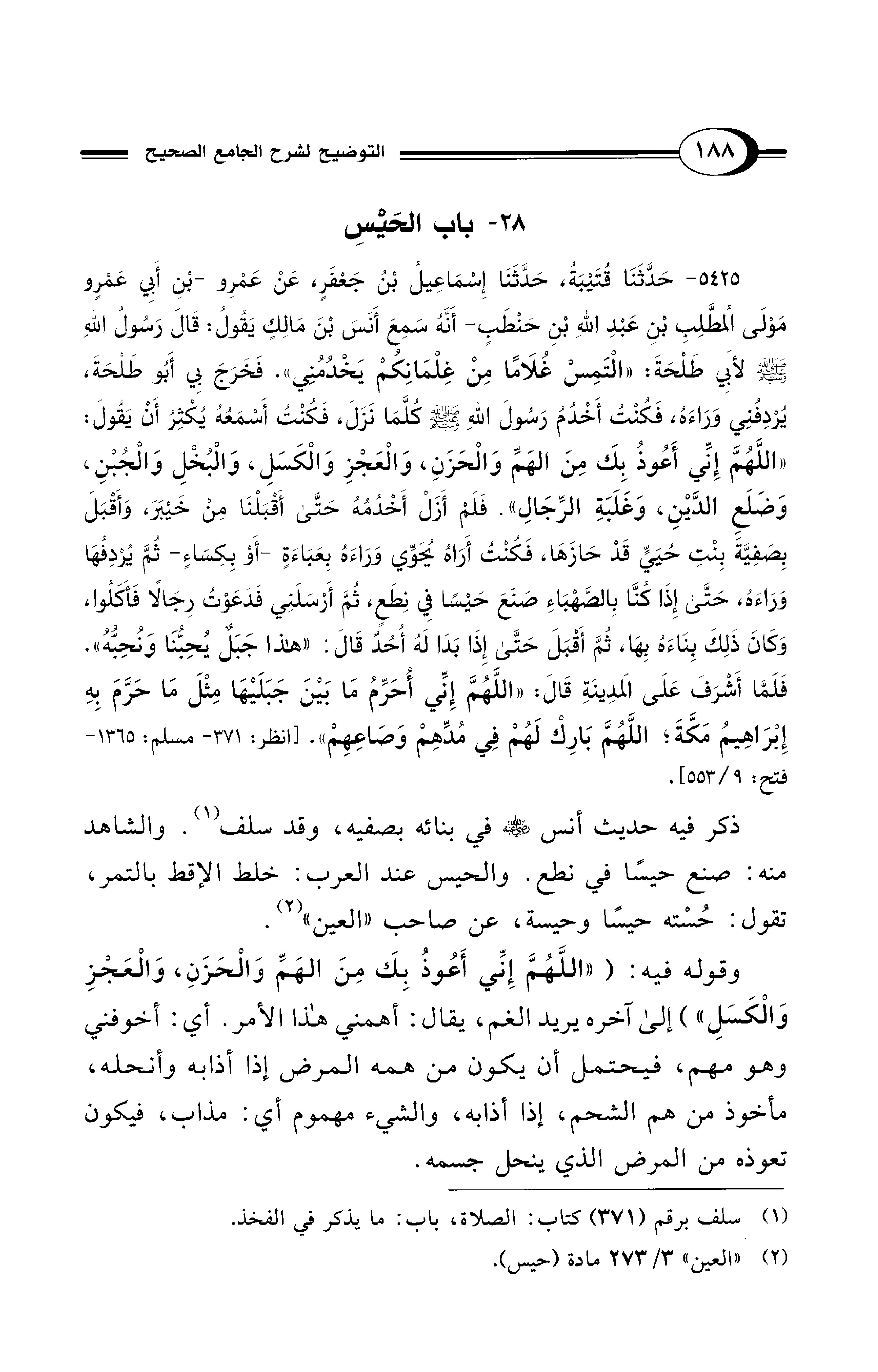 5425 - حَدَّثَنَا قُتَيْبَةُ، حَدَّثَنَا إِسْمَاعِيلُ بْنُ جَعْفَرٍ، عَنْ عَمْرِو -بْنِ أَبِي عَمْرٍو مَوْلَى الْمُطَّلِبِ بْنِ عَبْدِ اللهِ بْنِ حَنْطَبٍ- أَنَّهُ سَمِعَ أَنَسَ بْنَ مَالِكٍ يَقُولُ: قَالَ رَسُولُ اللهِ - صلى الله عليه وسلم - لأَبِي طَلْحَةَ: «الْتَمِسْ غُلاَمًا مِنْ غِلْمَانِكُمْ يَخْدُمُنِي». فَخَرَجَ بِي أَبُو طَلْحَةَ، يُرْدِفُنِي وَرَاءَهُ، فَكُنْتُ أَخْدُمُ رَسُولَ اللهِ - صلى الله عليه وسلم - كُلَّمَا نَزَلَ، فَكُنْتُ أَسْمَعُهُ يُكْثِرُ أَنْ يَقُولَ: «اللَّهُمَّ إِنِّي أَعُوذُ بِكَ مِنَ الْهَمِّ وَالْحَزَنِ، وَالْعَجْزِ وَالْكَسَلِ، وَالْبُخْلِ وَالْجُبْنِ، وَضَلَعِ الدَّيْنِ، وَغَلَبَةِ الرِّجَالِ». فَلَمْ أَزَلْ أَخْدُمُهُ حَتَّى أَقْبَلْنَا مِنْ خَيْبَرَ، وَأَقْبَلَ بِصَفِيَّةَ بِنْتِ حُيَيٍّ قَدْ حَازَهَا، فَكُنْتُ أَرَاهُ يُحَوِّي وَرَاءَهُ بِعَبَاءَةٍ -أَوْ بِكِسَاءٍ- ثُمَّ يُرْدِفُهَا وَرَاءَهُ، حَتَّى إِذَا كُنَّا بِالصَّهْبَاءِ صَنَعَ حَيْسًا فِي نِطَعٍ، ثُمَّ أَرْسَلَنِي فَدَعَوْتُ رِجَالاً فَأَكَلُوا، وَكَانَ ذَلِكَ بِنَاءَهُ بِهَا، ثُمَّ أَقْبَلَ حَتَّى إِذَا بَدَا لَهُ أُحُدٌ قَالَ: «هَذَا جَبَلٌ يُحِبُّنَا وَنُحِبُّهُ». فَلَمَّا أَشْرَفَ على الْمَدِينَةِ قَالَ: «اللَّهُمَّ إِنِّي أُحَرِّمُ مَا بَيْنَ جَبَلَيْهَا مِثْلَ مَا حَرَّمَ بِهِ إِبْرَاهِيمُ مَكَّةَ؛ اللَّهُمَّ بَارِكْ لَهُمْ فِي مُدِّهِمْ وَصَاعِهِمْ». [انظر: 371 - مسلم: 1365 - فتح: 9/ 553].