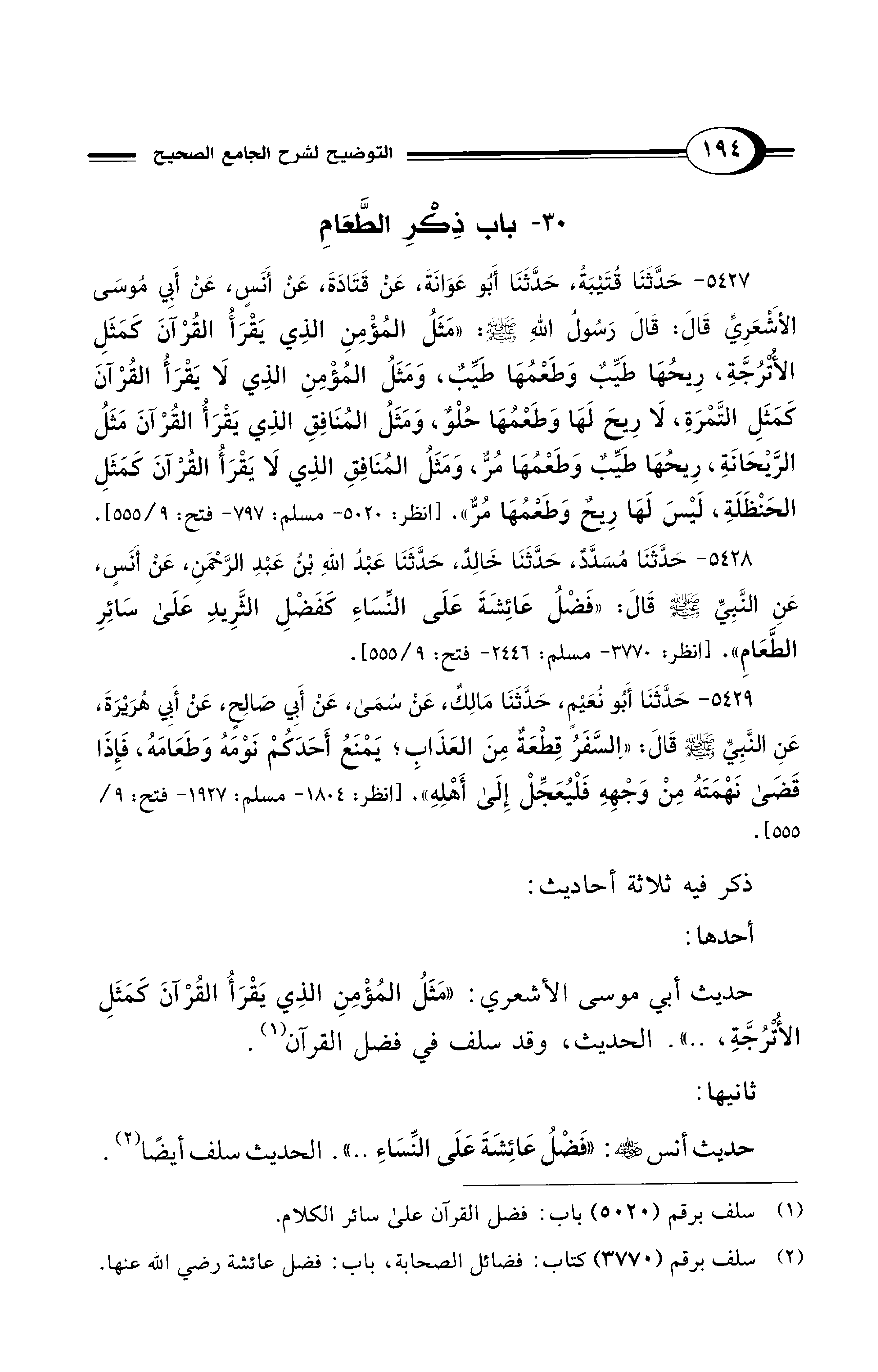 5428 - حَدَّثَنَا مُسَدَّدٌ، حَدَّثَنَا خَالِدٌ، حَدَّثَنَا عَبْدُ اللهِ بْنُ عَبْدِ الرَّحْمَنِ، عَنْ أَنَسٍ، عَنِ النَّبِيِّ - صلى الله عليه وسلم - قَالَ: «فَضْلُ عَائِشَةَ على النِّسَاءِ كَفَضْلِ الثَّرِيدِ على سَائِرِ الطَّعَامِ». [انظر: 3770 - مسلم: 2446 - فتح: 9/ 555].