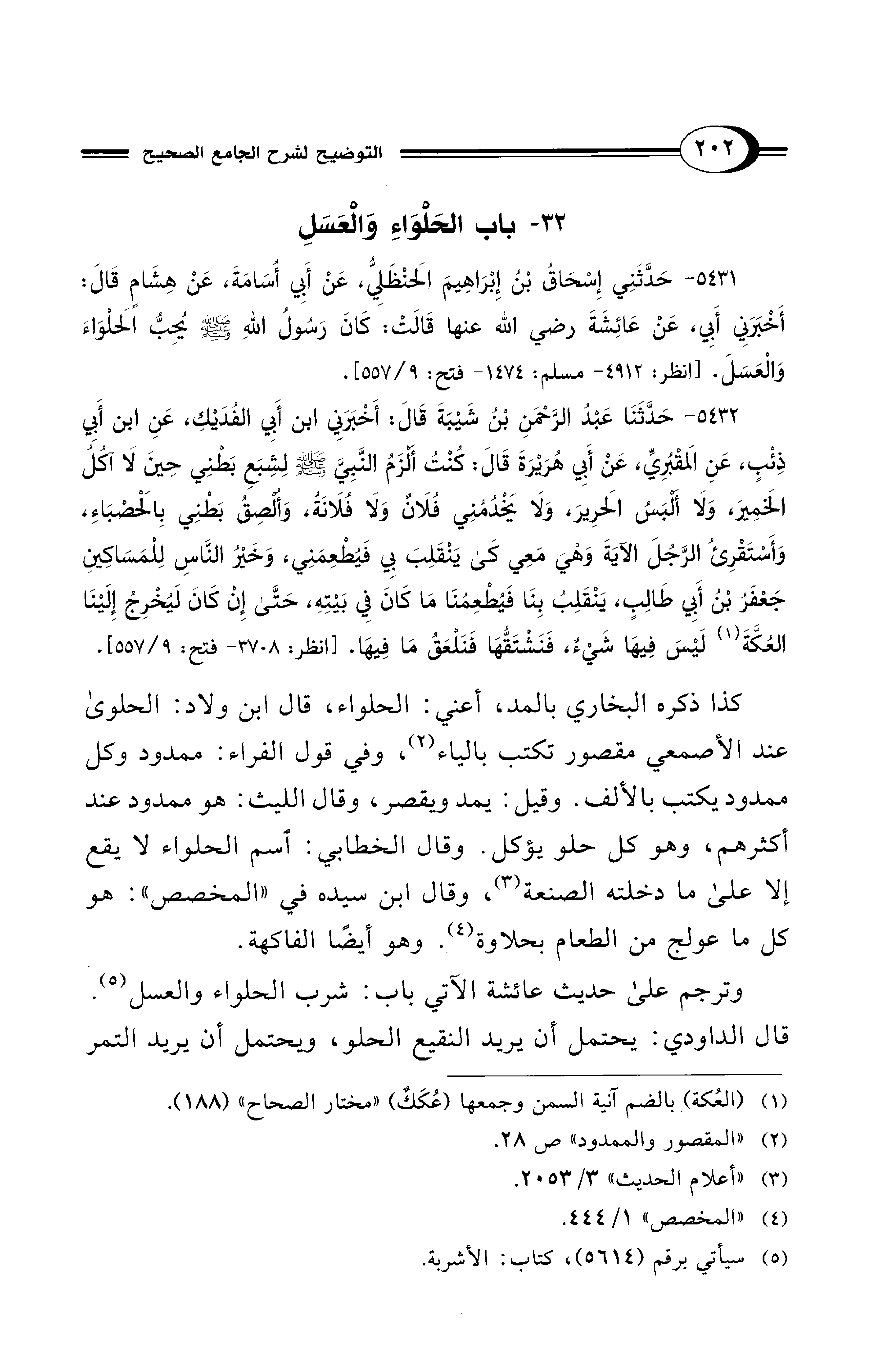 5431 - حَدَّثَنِي إِسْحَاقُ بْنُ إِبْرَاهِيمَ الْحَنْظَلِيُّ، عَنْ أَبِي أُسَامَةَ، عَنْ هِشَامٍ قَالَ: أَخْبَرَنِي أَبِي، عَنْ عَائِشَةَ - رضي الله عنها - قَالَتْ: كَانَ رَسُولُ اللهِ - صلى الله عليه وسلم - يُحِبُّ الْحَلْوَاءَ وَالْعَسَلَ. [انظر: 4912 - مسلم: 1474 - فتح: 9/ 557].