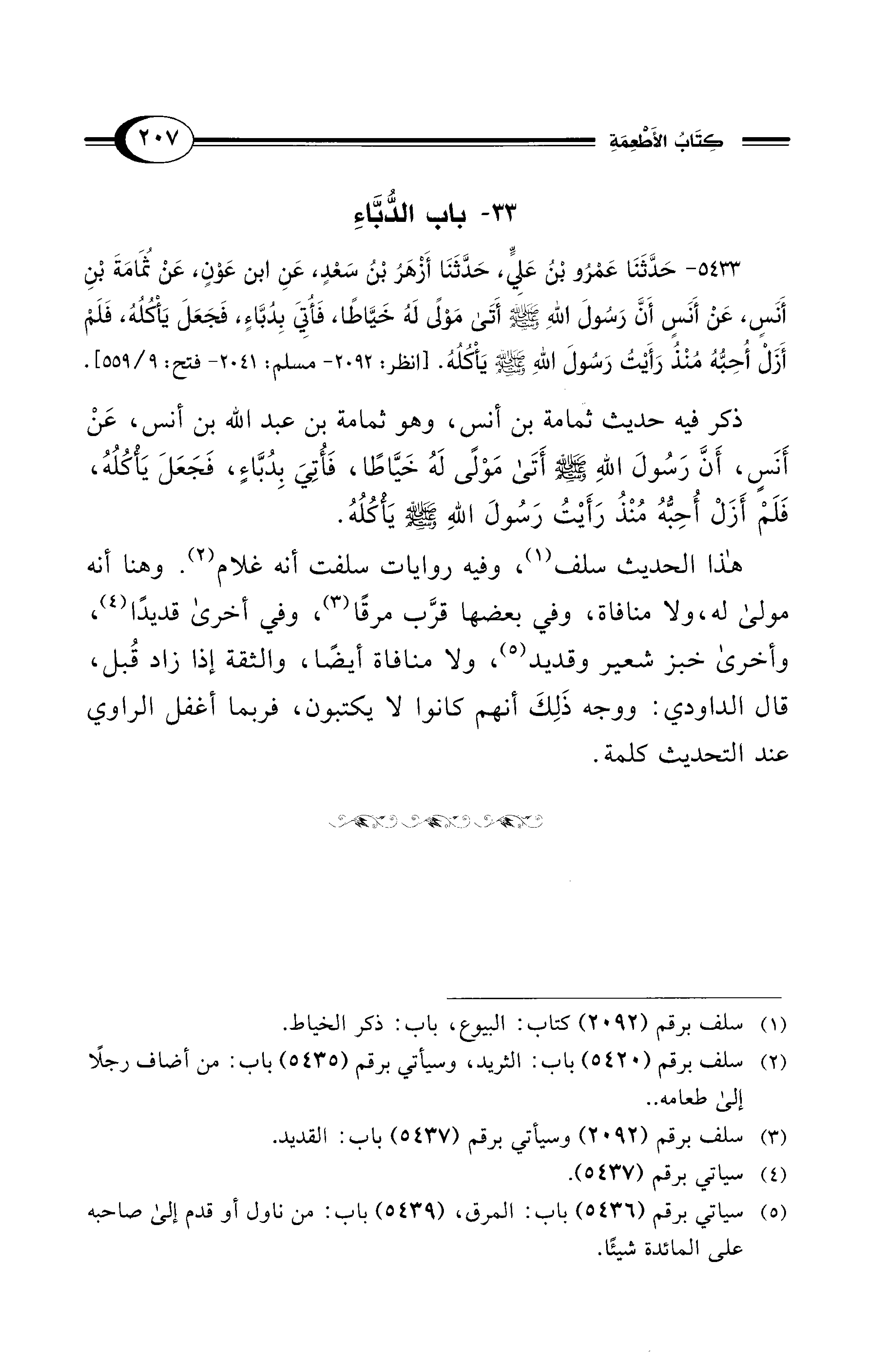 5433 - حَدَّثَنَا عَمْرُو بْنُ عَلِيٍّ، حَدَّثَنَا أَزْهَرُ بْنُ سَعْدٍ، عَنِ ابْنِ عَوْنٍ، عَنْ ثُمَامَةَ بْنِ أَنَسٍ، عَنْ أَنَسٍ أَنَّ رَسُولَ اللهِ - صلى الله عليه وسلم - أَتَى مَوْلًى لَهُ خَيَّاطًا، فَأُتِيَ بِدُبَّاءٍ، فَجَعَلَ يَأْكُلُهُ، فَلَمْ أَزَلْ أُحِبُّهُ مُنْذُ رَأَيْتُ رَسُولَ اللهِ - صلى الله عليه وسلم - يَأْكُلُهُ. [انظر: 2092 - مسلم: 2041 - فتح: 9/ 551].