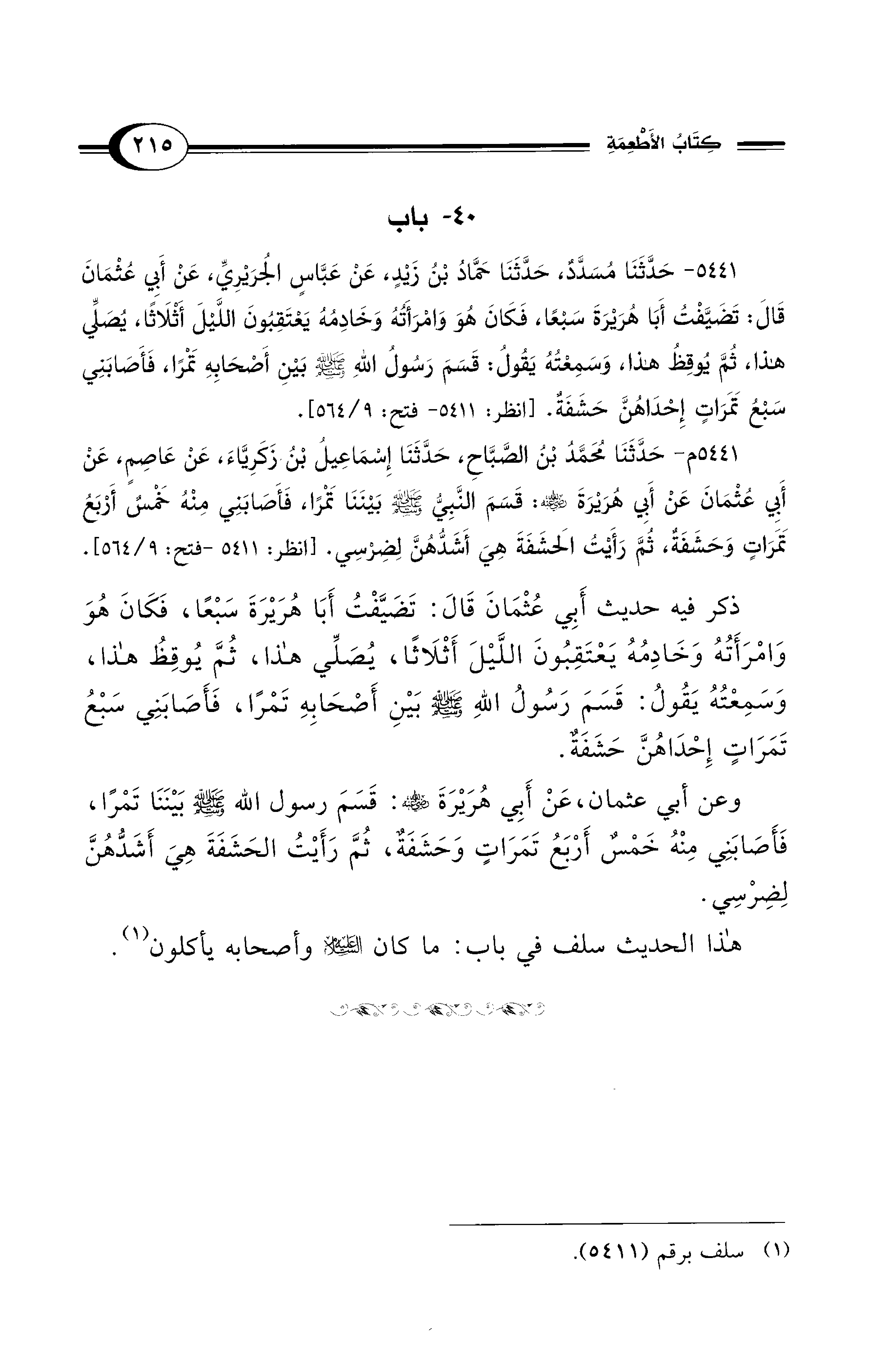 5441 م - حَدَّثَنَا مُحَمَّدُ بْنُ الصَّبَّاحِ، حَدَّثَنَا إِسْمَاعِيلُ بْنُ زَكَرِيَّاءَ، عَنْ عَاصِمٍ، عَنْ أَبِي عُثْمَانَ عَنْ أَبِي هُرَيْرَةَ - رضي الله عنه -: قَسَمَ النَّبِيُّ - صلى الله عليه وسلم - بَيْنَنَا تَمْرًا، فَأَصَابَنِي مِنْهُ خَمْسٌ أَرْبَعُ تَمَرَاتٍ وَحَشَفَةٌ، ثُمَّ رَأَيْتُ الْحَشَفَةَ هِيَ أَشَدُّهُنَّ لِضِرْسِي. [انظر: 5411 - فتح: 9/ 564].