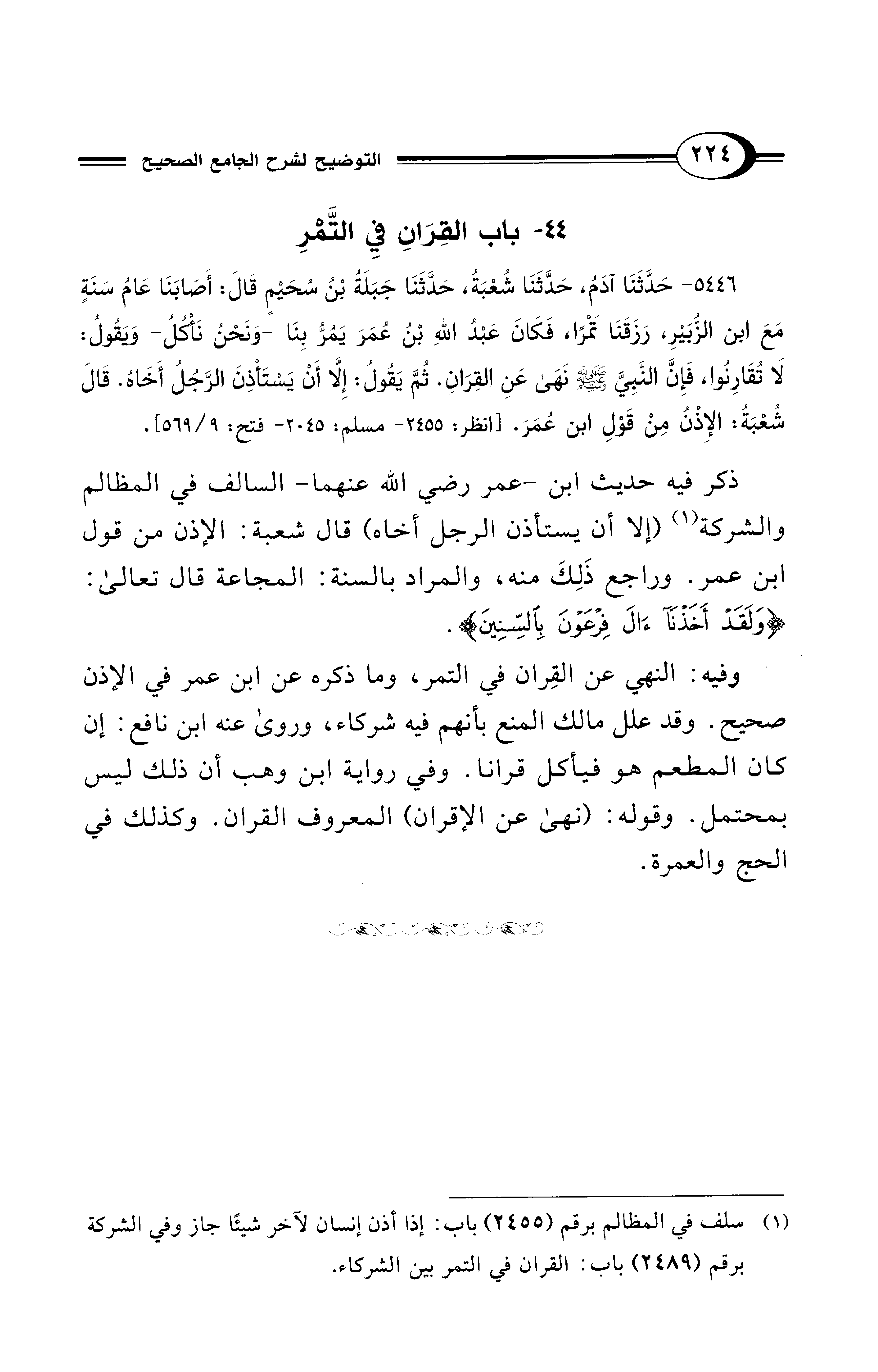 5446 - حَدَّثَنَا آدَمُ، حَدَّثَنَا شُعْبَةُ، حَدَّثَنَا جَبَلَةُ بْنُ سُحَيْمٍ قَالَ: أَصَابَنَا عَامُ سَنَةٍ مَعَ ابْنِ الزُّبَيْرِ، رَزَقَنَا تَمْرًا، فَكَانَ عَبْدُ اللهِ بْنُ عُمَرَ يَمُرُّ بِنَا -وَنَحْنُ نَأْكُلُ- وَيَقُولُ: لاَ تُقَارِنُوا، فَإِنَّ النَّبِيَّ - صلى الله عليه وسلم - نَهَى عَنِ الْقِرَانِ. ثُمَّ يَقُول: إِلاَّ أَنْ يَسْتَأْذِنَ الرَّجُلُ أَخَاهُ. قَالَ شُعْبَةُ: الإِذْنُ مِنْ قَوْلِ ابْنِ عُمَرَ. [انظر: 2455 - مسلم: 2045 - فتح: 9/ 569].