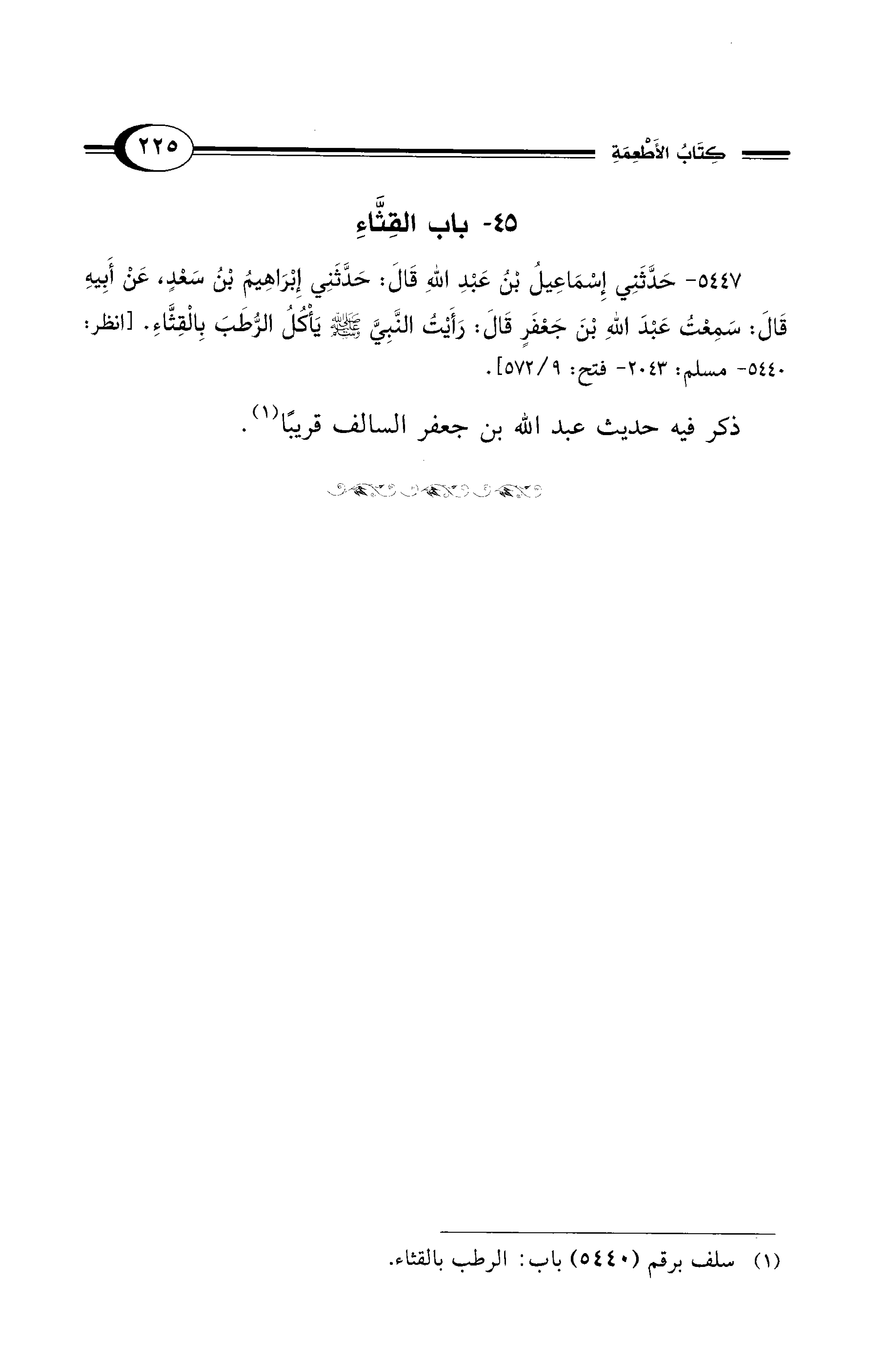 5447 - حَدَّثَنِي إِسْمَاعِيلُ بْنُ عَبْدِ اللهِ قَالَ: حَدَّثَنِي إِبْرَاهِيمُ بْنُ سَعْدٍ، عَنْ أَبِيهِ قَالَ: سَمِعْتُ عَبْدَ اللهِ بْنَ جَعْفَرٍ قَالَ: رَأَيْتُ النَّبِيَّ - صلى الله عليه وسلم - يَأْكُلُ الرُّطَبَ بِالْقِثَّاءِ. [انظر: 5440 - مسلم:2043 - فتح: 9/ 572].