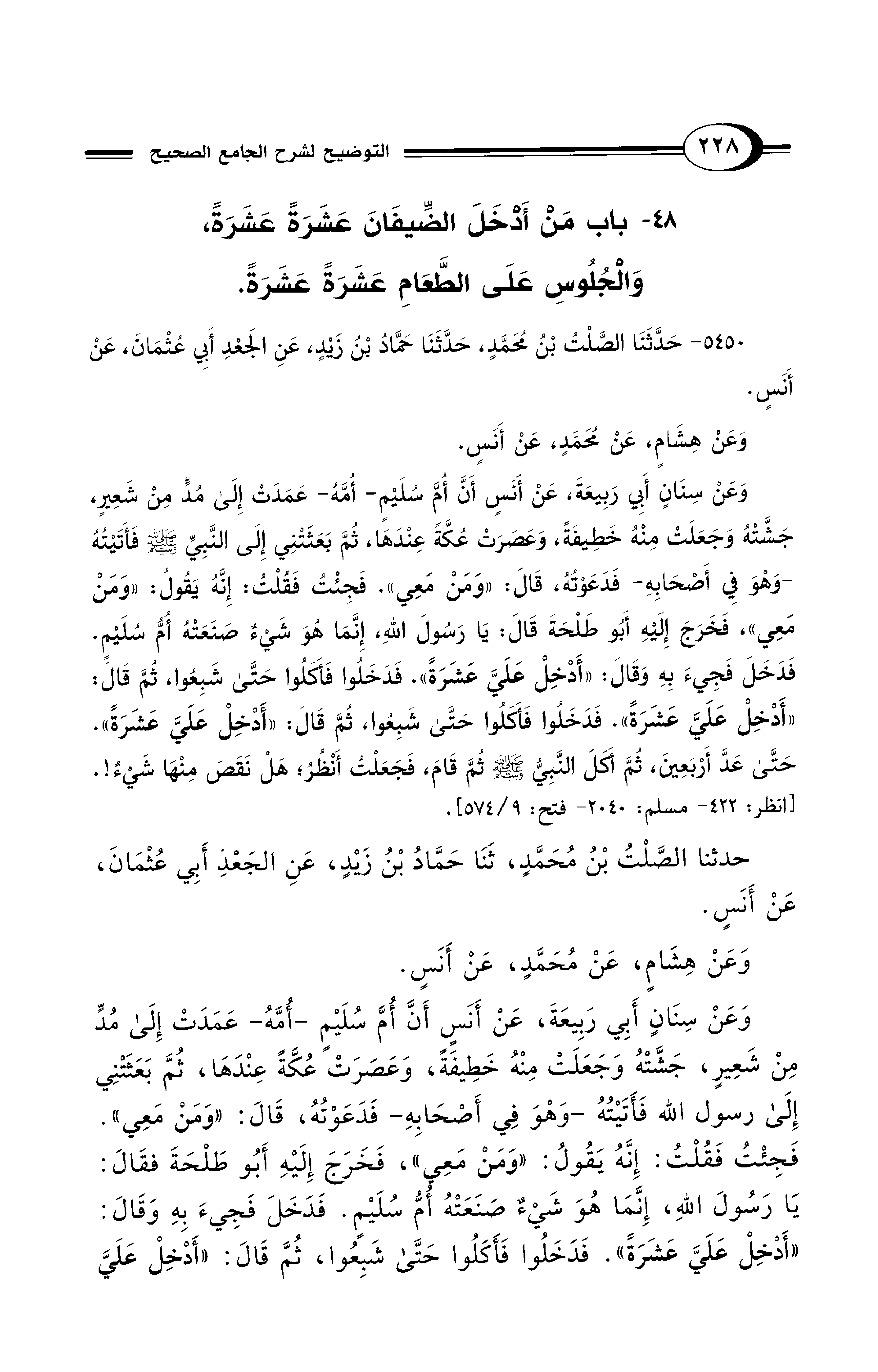 حدثنا الصَّلْتُ بْنُ مُحَمَّدٍ، ثَنَا حَمَّادُ بْنُ زيدٍ، عَنِ الجَعْدِ أَبِي عُثْمَانَ، عَنْ أَنَسٍ. وَعَنْ هِشَامٍ، عَنْ مُحَمَّدٍ، عَنْ أَنَسٍ. وَعَنْ سِنَانٍ أَبِي رَبِيعَةَ، عَنْ أَنَسٍ أَنَّ أُمَّ سُلَيْمٍ -أُمَّهُ- عَمَدَتْ إلى مُدٍّ مِنْ شَعِيرٍ، جَشَّتْهُ وَجَعَلَتْ مِنْهُ خَطِيفَةً، وَعَصَرَتْ عُكَّةً عِنْدَهَا، ثُمَّ بَعَثَتْنِي إلى رسول الله فَأَتَيْتُهُ -وَهْوَ في أَصْحَابِهِ- فَدَعَوْتُهُ، قَالَ: "وَمَن مَعِي". فَجِئْتُ فَقُلْتُ: إِنَّهُ يَقُولُ: "وَمَنْ مَعِي"، فَخَرَجَ إِلَيْهِ أَبُو طَلْحَةَ فقَالَ: يَا رَسُولَ اللهِ، إِنَّمَا هُوَ شَيْءٌ صنَعَتْهُ أُمُّ سُلَيْمٍ. فَدَخَلَ فَجِيءَ بِهِ وَقَالَ: "أَدْخِلْ عَلَيَّ عَشَرَةً". فَدَخَلُوا فَأَكَلُوا حَتَّى شَبِعُوا، ثُمَّ قَالَ: "أَدْخِلْ عَلَيَّ