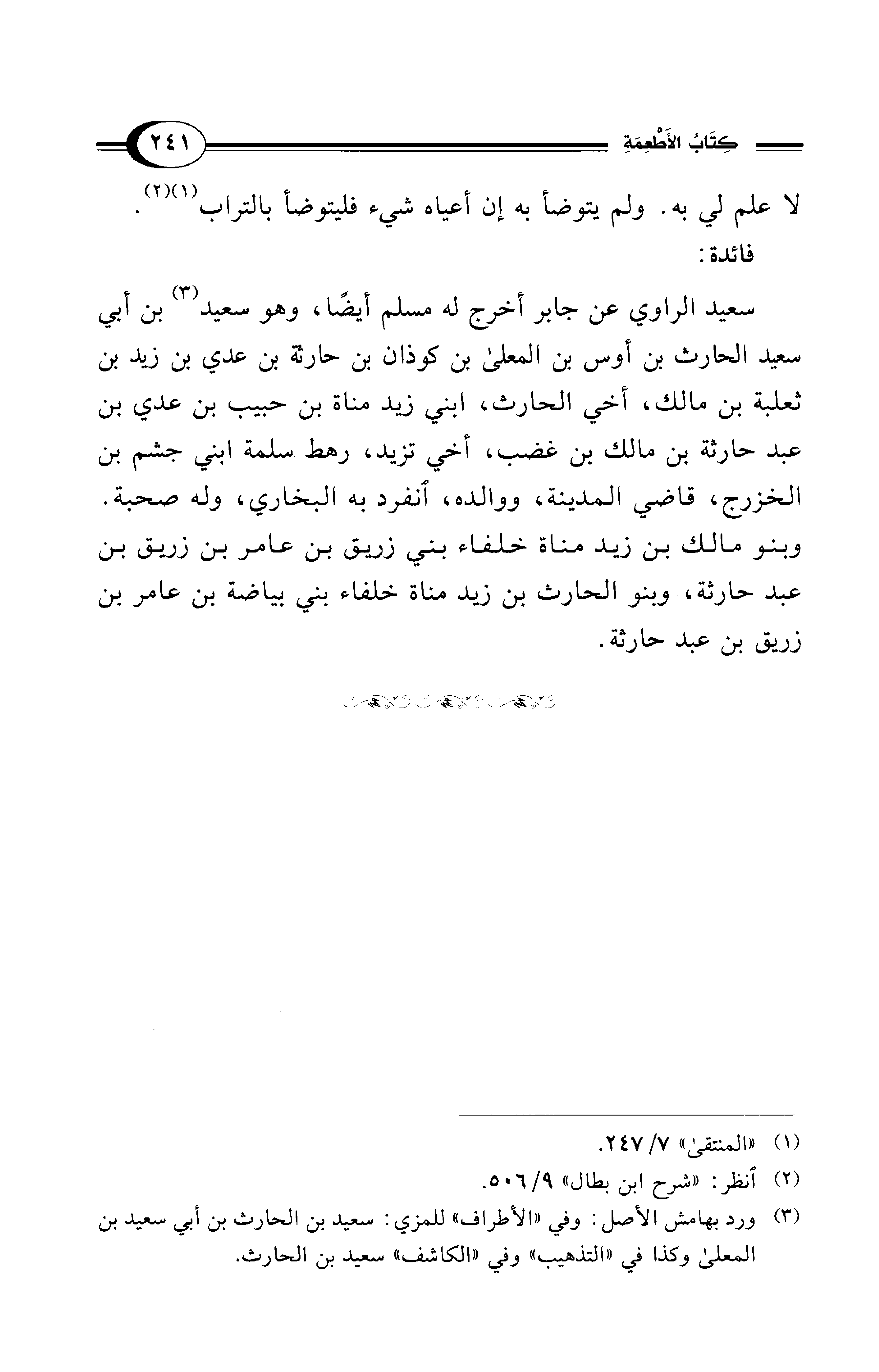 سعيد الراوي عن جابر أخرج له مسلم أيضًا، وهو سعيد (¬3) بن أبي سعيد الحارث بن أوس بن المعلى بن كوذان بن حارثة بن عدي بن زيد بن ثعلبة بن مالك، أخي الحارث، ابني زيد مناة بن حبيب بن عدي بن عبد حارثة بن مالك بن غضب، أخي تزيد، رهط سلمة ابني جشم بن الخزرج، قاضي المدينة، ووالده، انفرد به البخاري، وله صحبة. وبنو مالك بن زيد مناة خلفاء بني زريق بن عامر بن زريق بن عبد حارثة، وبنو الحارث بن زيد مناة خلفاء بني بياضة بن عامر بن زريق بن عبد حارثة.