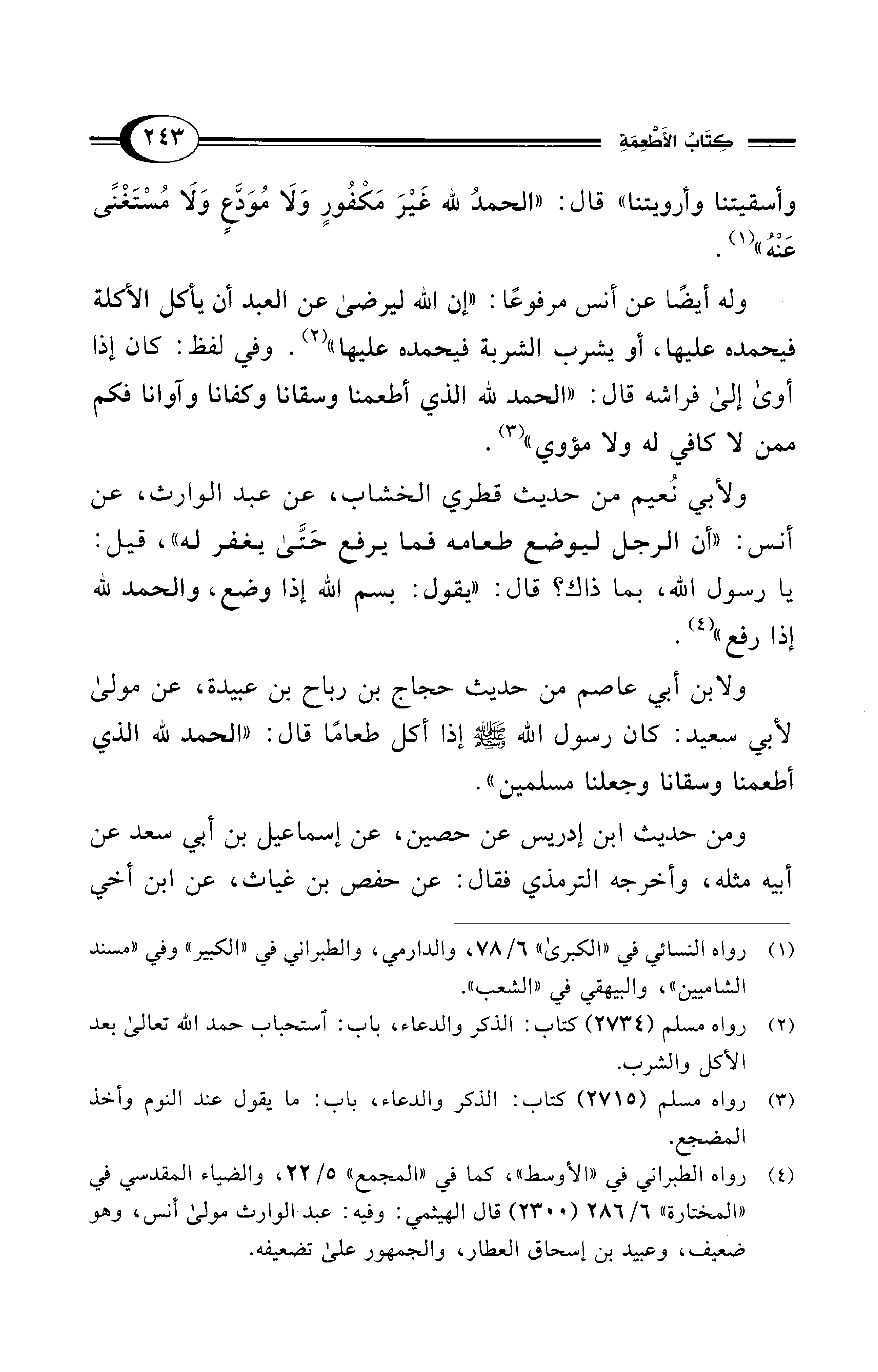 وله أيضًا عن أنس مرفوعًا: "إن الله ليرضى عن العبد أن يأكل الأكلة فيحمده عليها، أو يشرب الشربة فيحمده عليها" (¬2). وفي لفظ: كان إذا أوى إلى فراشه قال: "الحمد لله الذي أطعمنا وسقانا وكفانا وآوانا فكم ممن لا كافي له ولا مؤوي" (¬3).