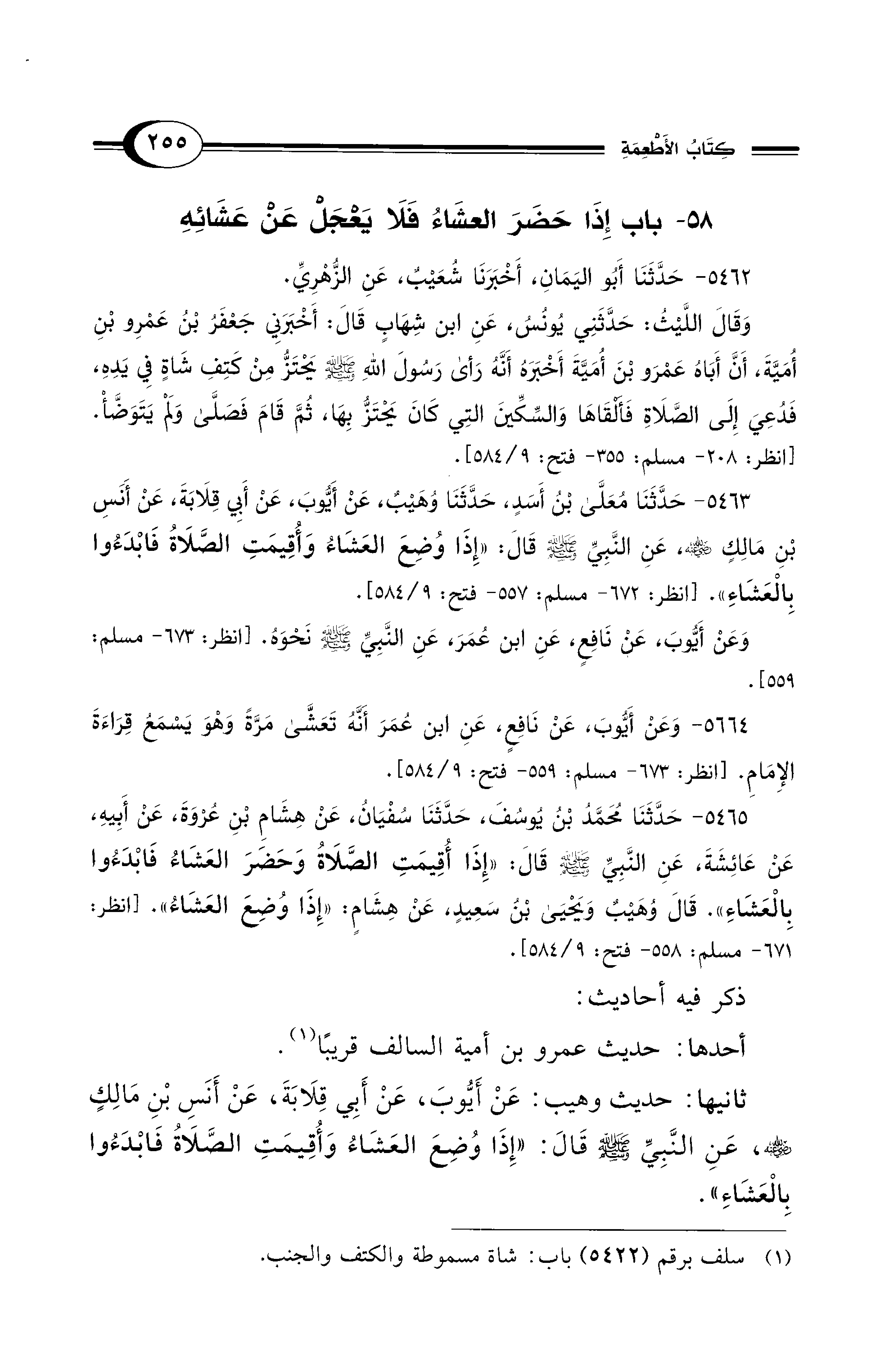 5463 - حَدَّثَنَا مُعَلَّى بْنُ أَسَدٍ، حَدَّثَنَا وُهَيْبٌ، عَنْ أَيُّوبَ، عَنْ أَبِي قِلاَبَةَ، عَنْ أَنَسِ بْنِ مَالِكٍ - رضي الله عنه -، عَنِ النَّبِيِّ - صلى الله عليه وسلم - قَالَ: «إِذَا وُضِعَ الْعَشَاءُ وَأُقِيمَتِ الصَّلاَةُ فَابْدَءُوا بِالْعَشَاءِ». [انظر: 672 - مسلم: 557 - فتح: 9/ 584].