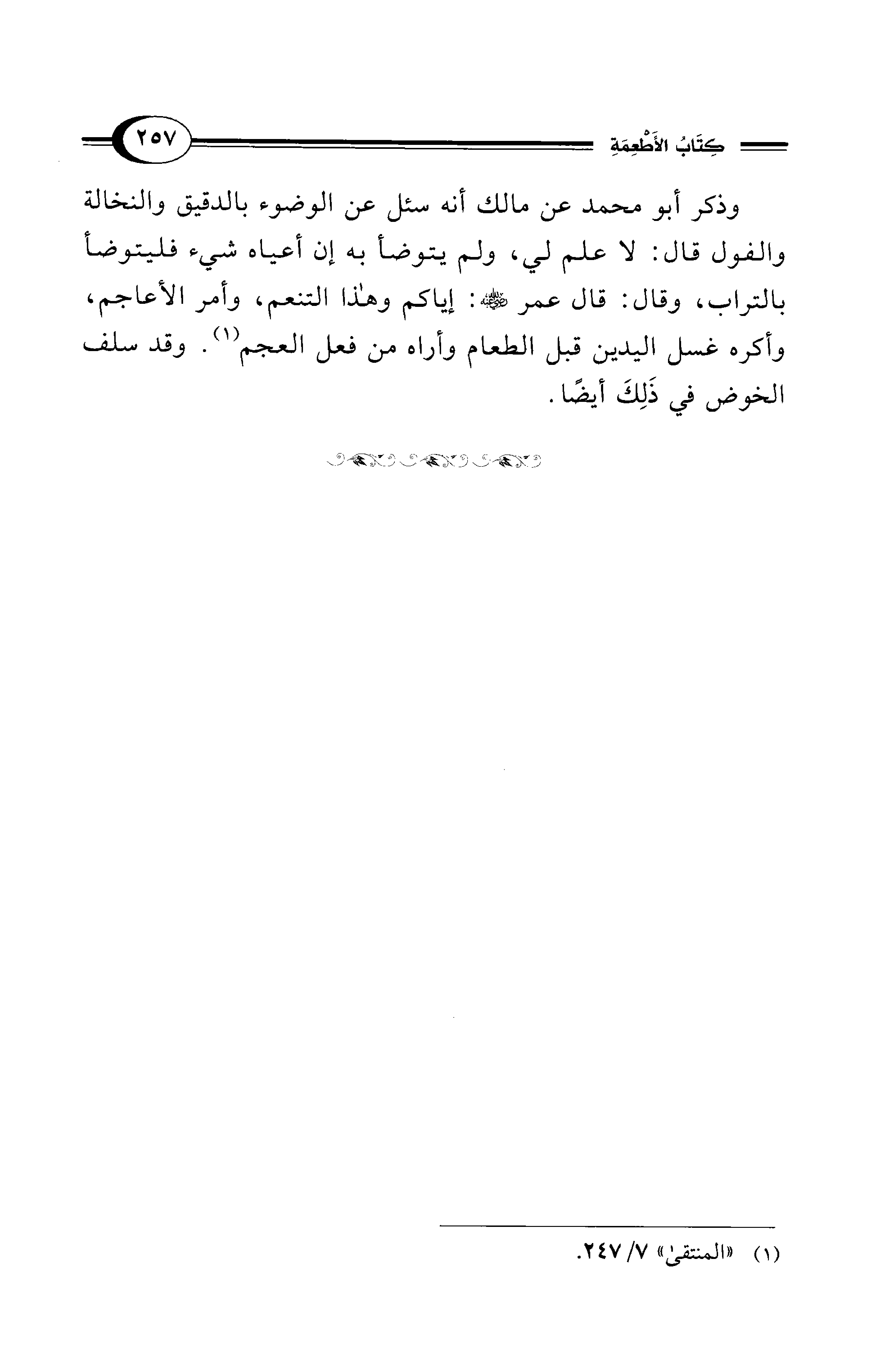 وذكر أبو محمد عن مالك أنه سئل عن الوضوء بالدقيق والنخالة والفول قال: لا علم لي، ولم يتوضأ به إن أعياه شيء فليتوضأ بالتراب، وقال: قال عمر - رضي الله عنه -: إياكم وهذا التنعم، وأمر الأعاجم، وأكره غسل اليدين قبل الطعام وأراه من فعل العجم (¬1). وقد سلف الخوض في ذَلِكَ أيضًا.