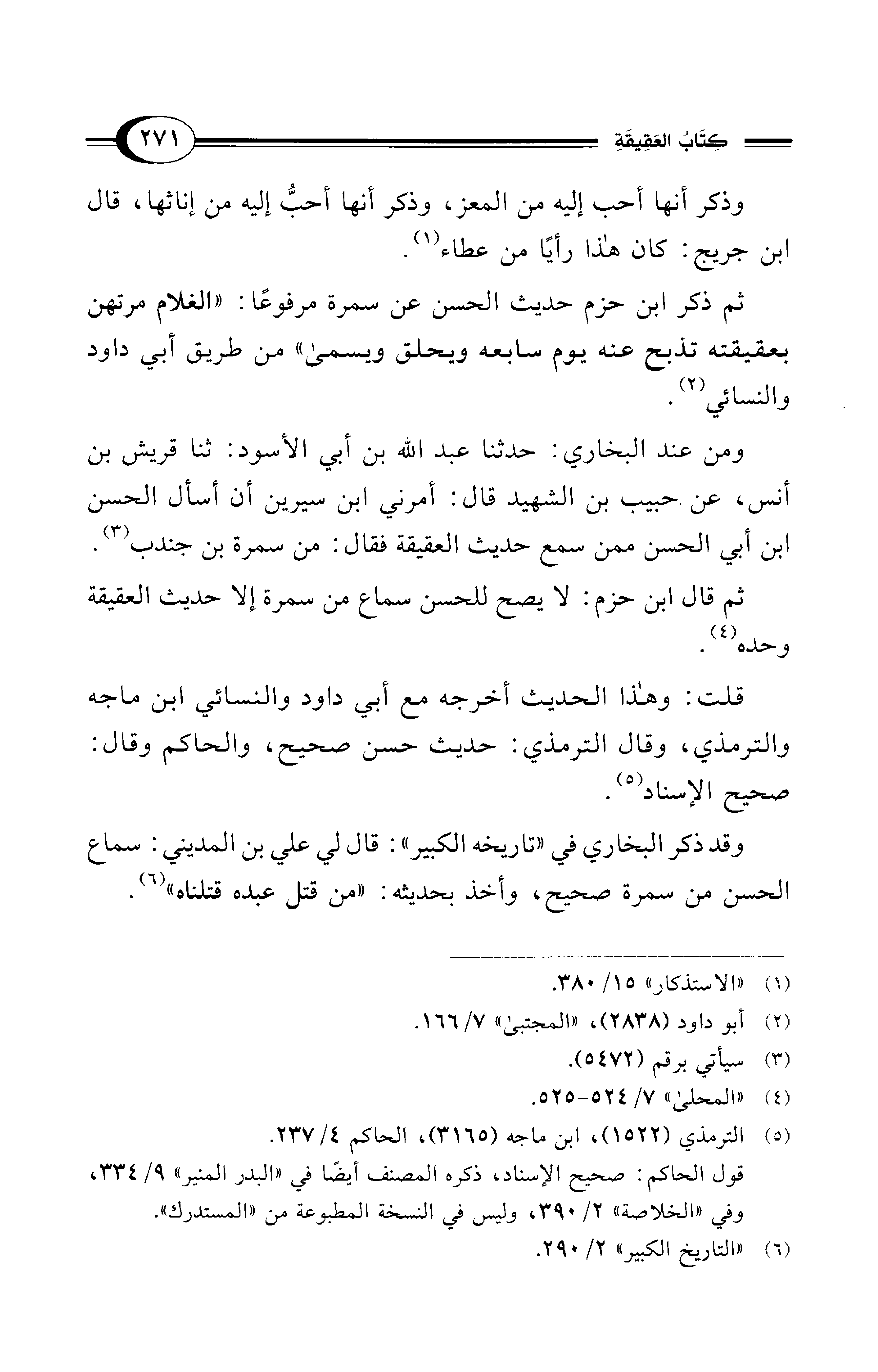 ثم ذكر ابن حزم حديث الحسن عن سمرة مرفوعًا: "الغلام مرتهن بعقيقته تذبح عنه يوم سابعه ويحلق ويسمى" من طريق أبي داود والنسائي (¬2).