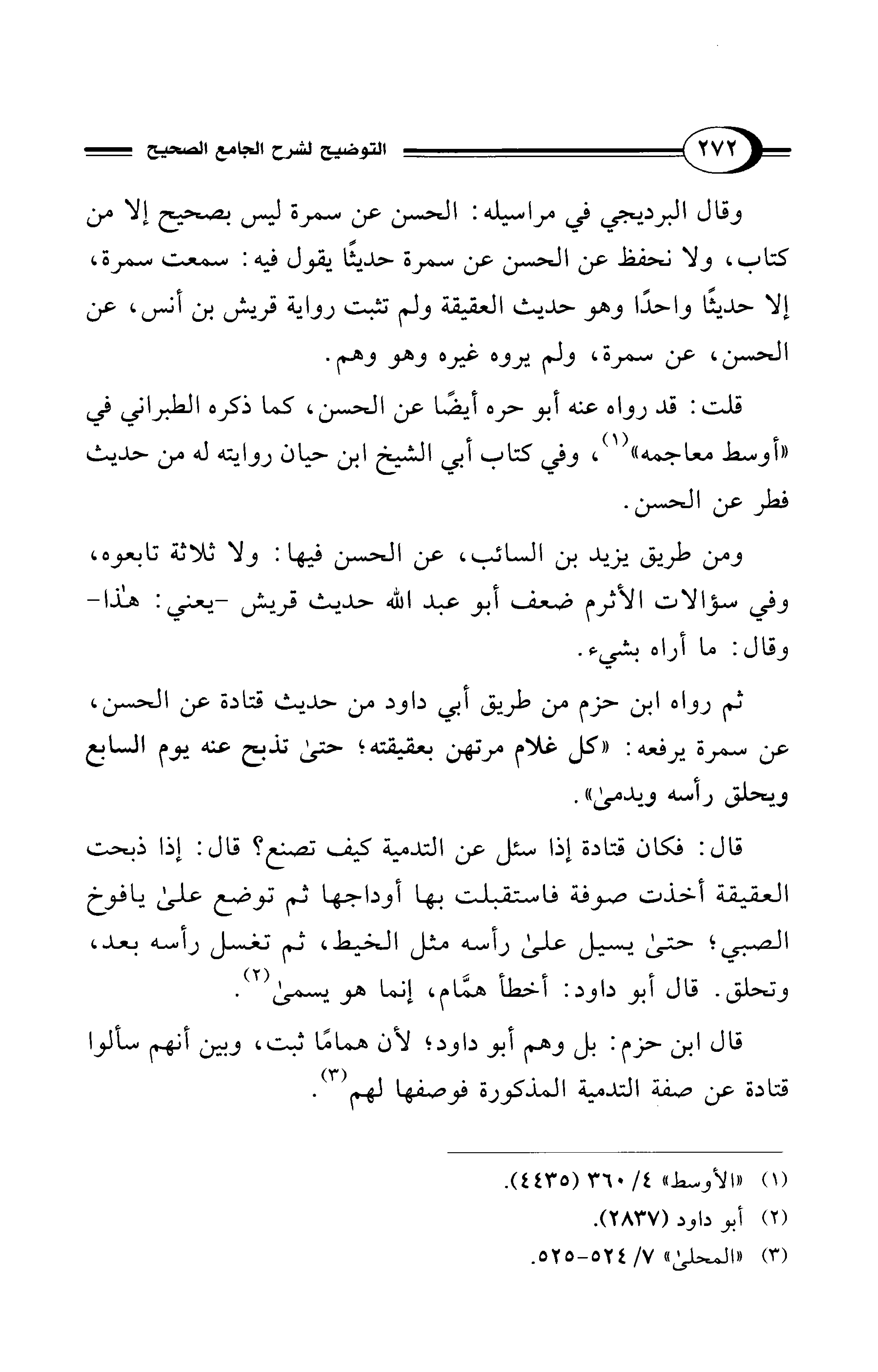 ثم رواه ابن حزم من طريق أبي داود من حديث قتادة عن الحسن، عن سمرة يرفعه: "كل غلام مرتهن بعقيقته؛ حتى تذبح عنه يوم السابع ويحلق رأسه ويدمى".