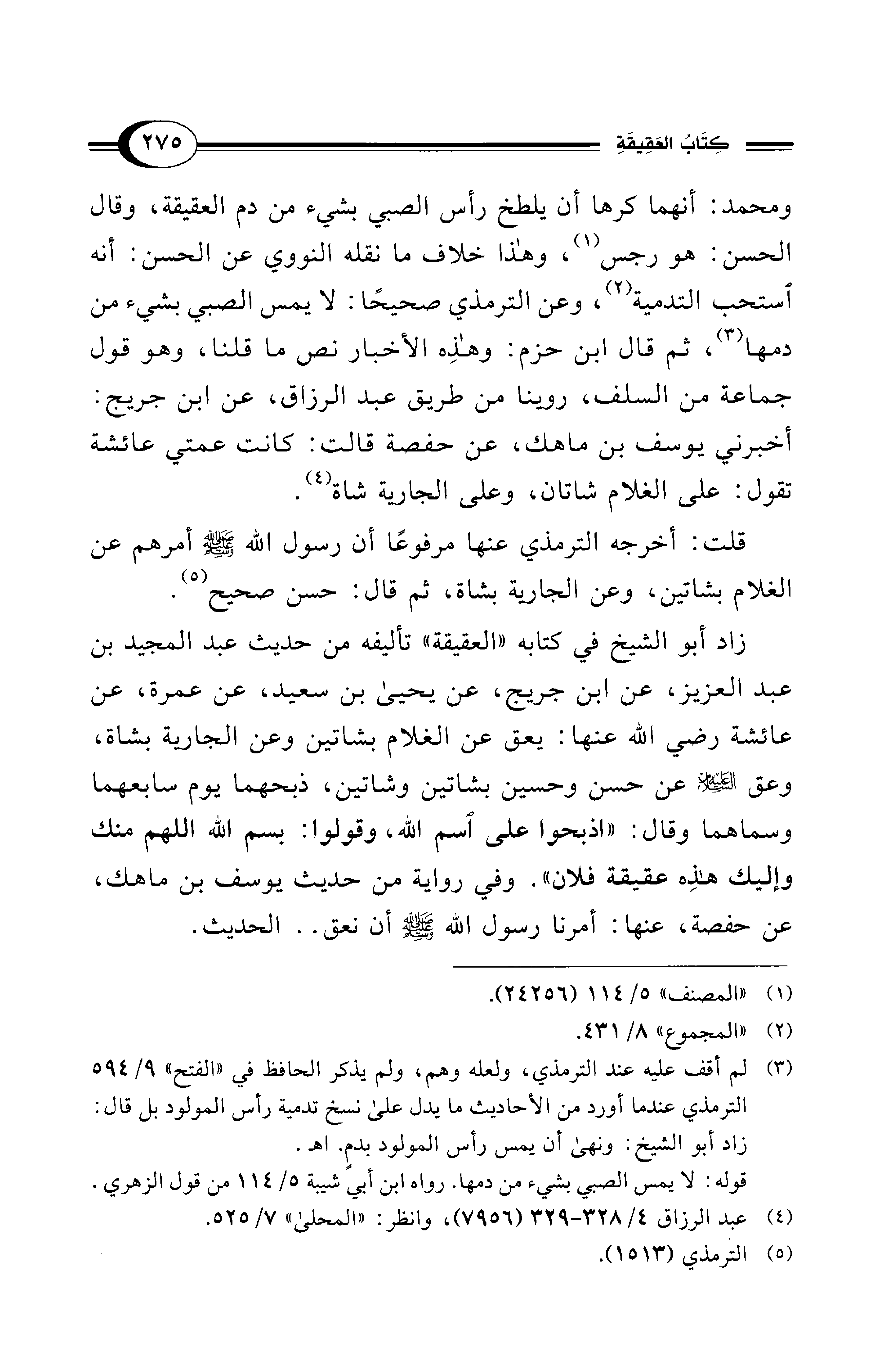 (¬3) لم أقف عليه عند الترمذي، ولعله وهم، ولم يذكر الحافظ في "الفتح" 9/ 594 الترمذي عندما أورد من الأحاديث ما يدل على نسخ تدمية رأس المولود بل قال: زاد أبو الشيخ: ونهى أن يمس رأس المولود بدمٍ. اهـ.