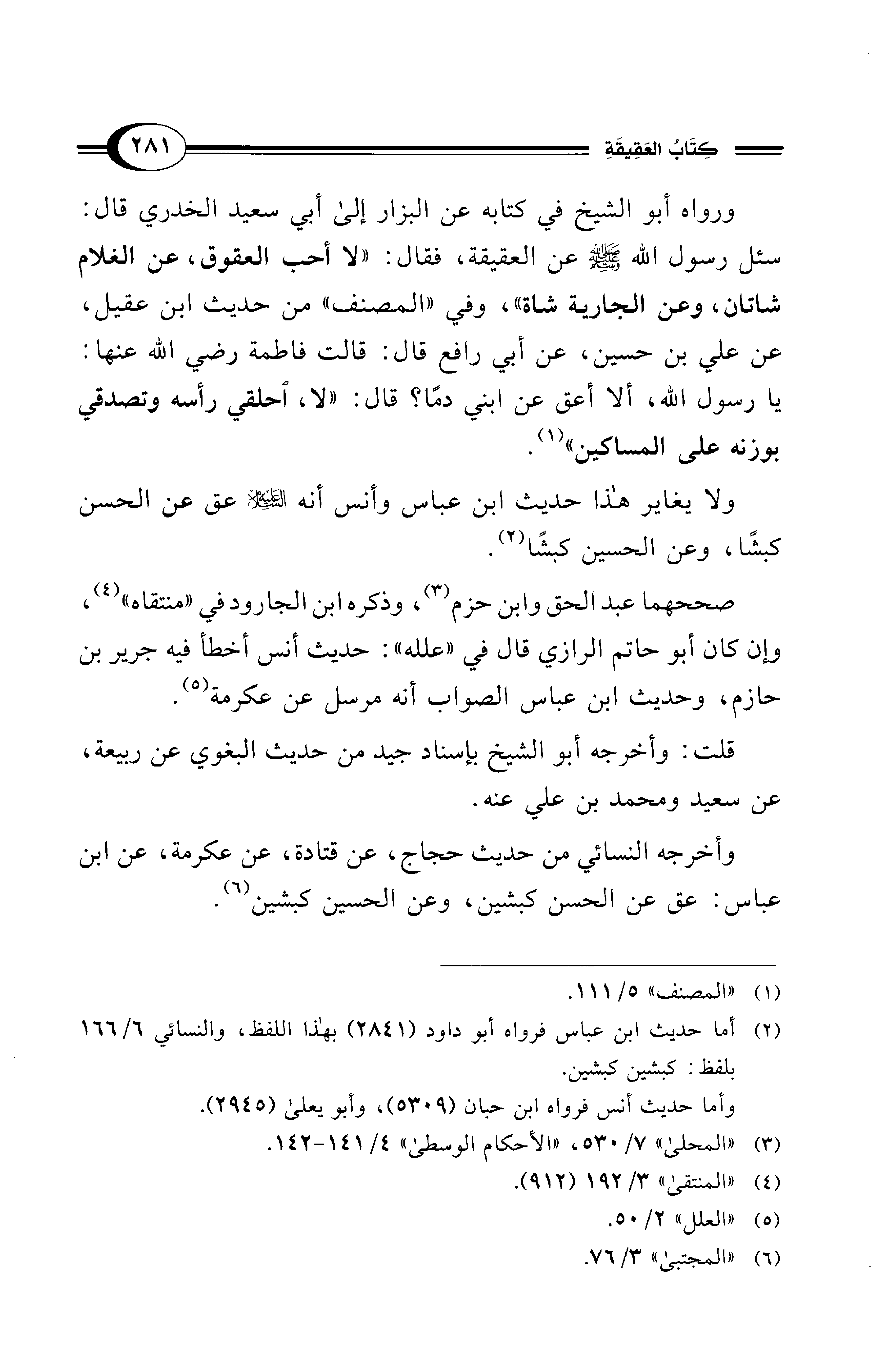 ورواه أبو الشيخ في كتابه عن البزار إلى أبي سعيد الخدري قال: سئل رسول الله - صلى الله عليه وسلم - عن العقيقة، فقال: "لا أحب العقوق، عن الغلام شاتان، وعن الجارية شاة"، وفي "المصنف" من حديث ابن عقيل، عن علي بن حسين، عن أبي رافع قال: قالت فاطمة - رضي الله عنها -: يا رسول الله، ألا أعق عن ابني دمًا؟ قال: "لا، آحلقي رأسه وتصدقي بوزنه على المساكين" (¬1).