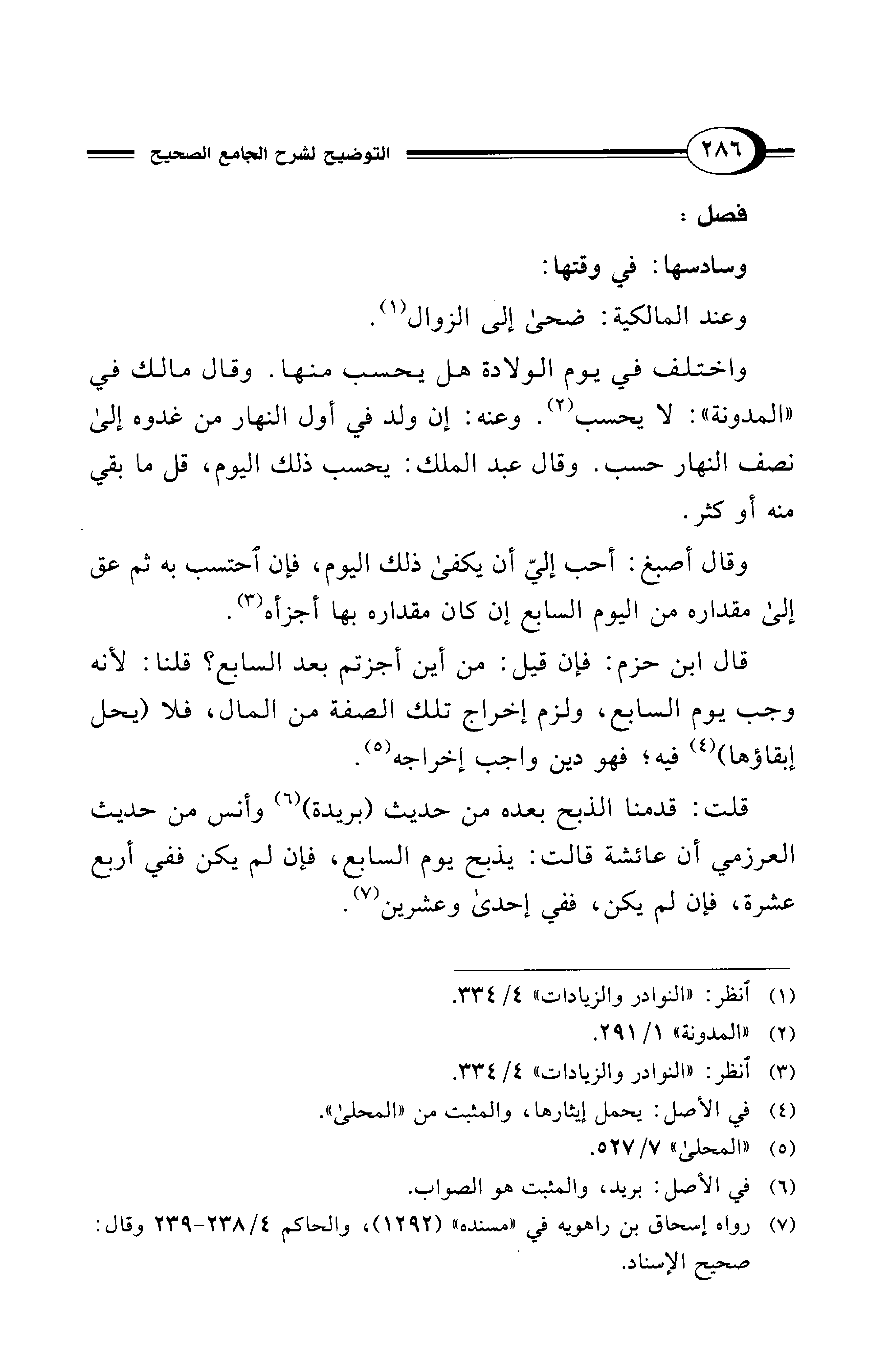 قال ابن حزم: فإن قيل: من أين أجزتم بعد السابع؟ قلنا: لأنه وجب يوم السابع، ولزم إخراج تلك الصفة من المال، فلا (يحل إبقاؤها) (¬4) فيه؛ فهو دين واجب إخراجه (¬5).