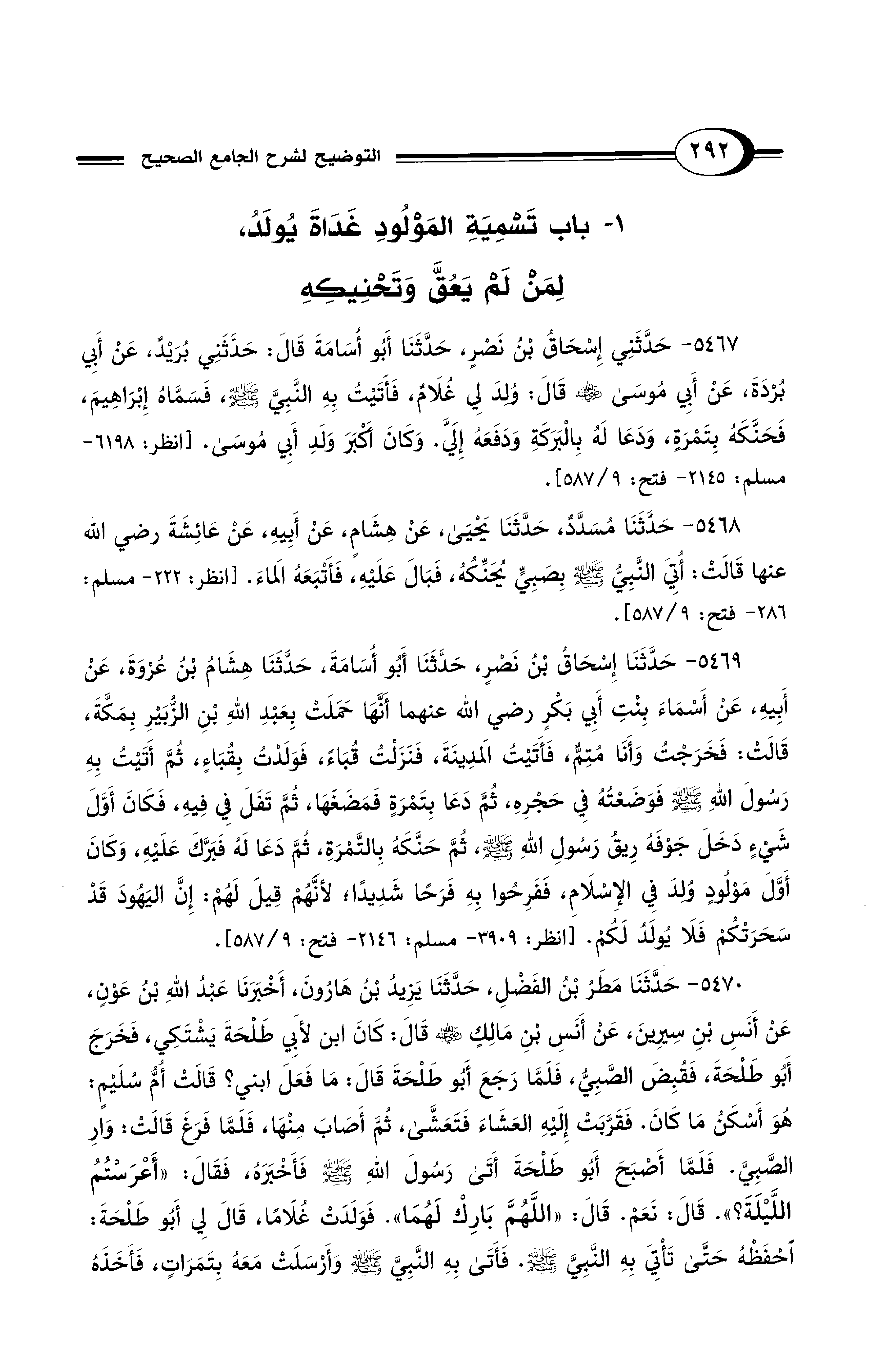 1 - باب تَسْمِيَةِ الْمَوْلُودِ غَدَاةَ يُولَدُ, لِمَنْ لَمْ يَعُقَّ وَتَحْنِيكِهِ
