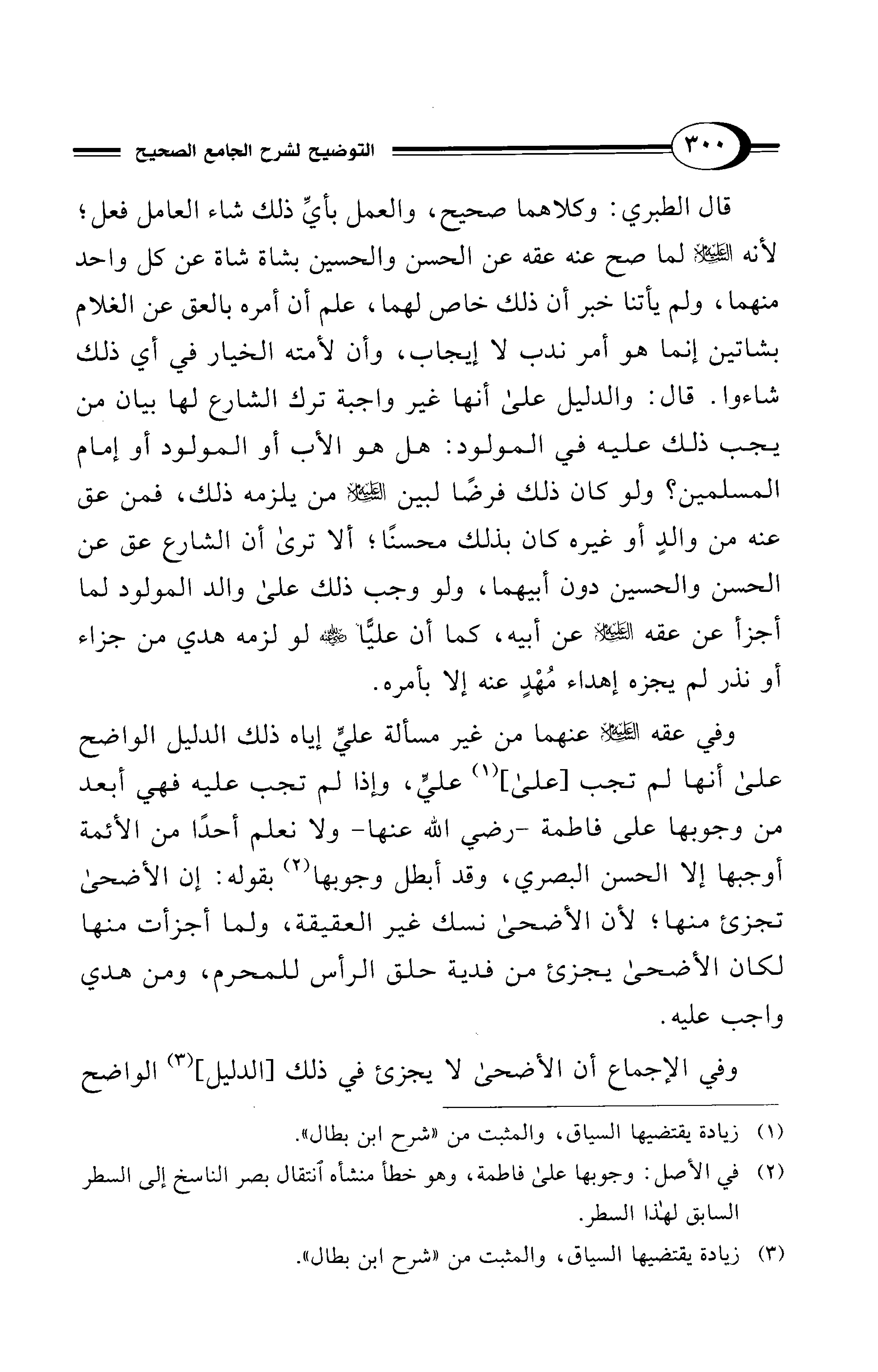 قال الطبري: وكلاهما صحيح، والعمل بأيِّ ذلك شاء العامل فعل؛ لأنه - عليه السلام - لما صح عنه عقه عن الحسن والحسين بشاة شاة عن كل واحد منهما، ولم يأتنا خبر أن ذلك خاص لهما، علم أن أمره بالعق عن الغلام بشاتين إنما هو أمر ندب لا إيجاب، وأن لأمته الخيار في أي ذلك شاءوا. قال: والدليل على أنها غير واجبة ترك الشارع لها بيان من يجب ذلك عليه في المولود: هل هو الأب أو المولود أو إمام المسلمين؟ ولو كان ذلك فرضًا لبين - عليه السلام - من يلزمه ذلك، فمن عق عنه من والدٍ أو غيره كان بذلك محسنًا؛ ألا ترى أن الشارع عق عن الحسن والحسين دون أبيهما، ولو وجب ذلك على والد المولود لما أجزأ عن عقه - عليه السلام - عن أبيه، كما أن عليًّا - رضي الله عنه - لو لزمه هدي من جزاء أو نذر لم يجزه إهداء مُهْدٍ عنه إلا بأمره.