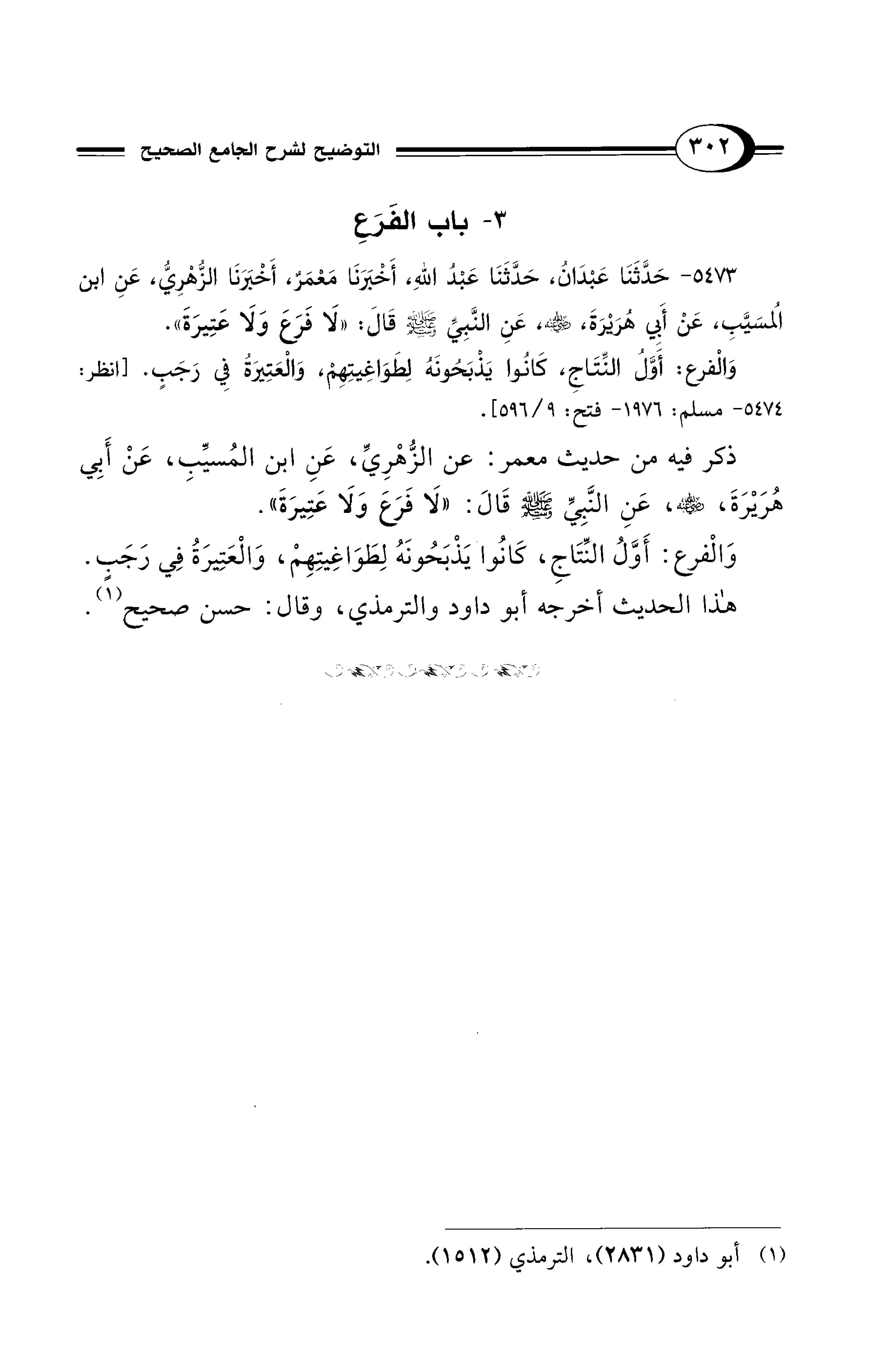 وَالْفرع: أَوَّلُ النِّتَاجِ، كَانُوا يَذْبَحُونَهُ لِطَوَاغِيتِهِمْ، وَالْعَتِيرَةُ فِي رَجَبٍ. هذا الحديث أخرجه أبو داود والترمذي، وقال: حسن صحيح (¬1).