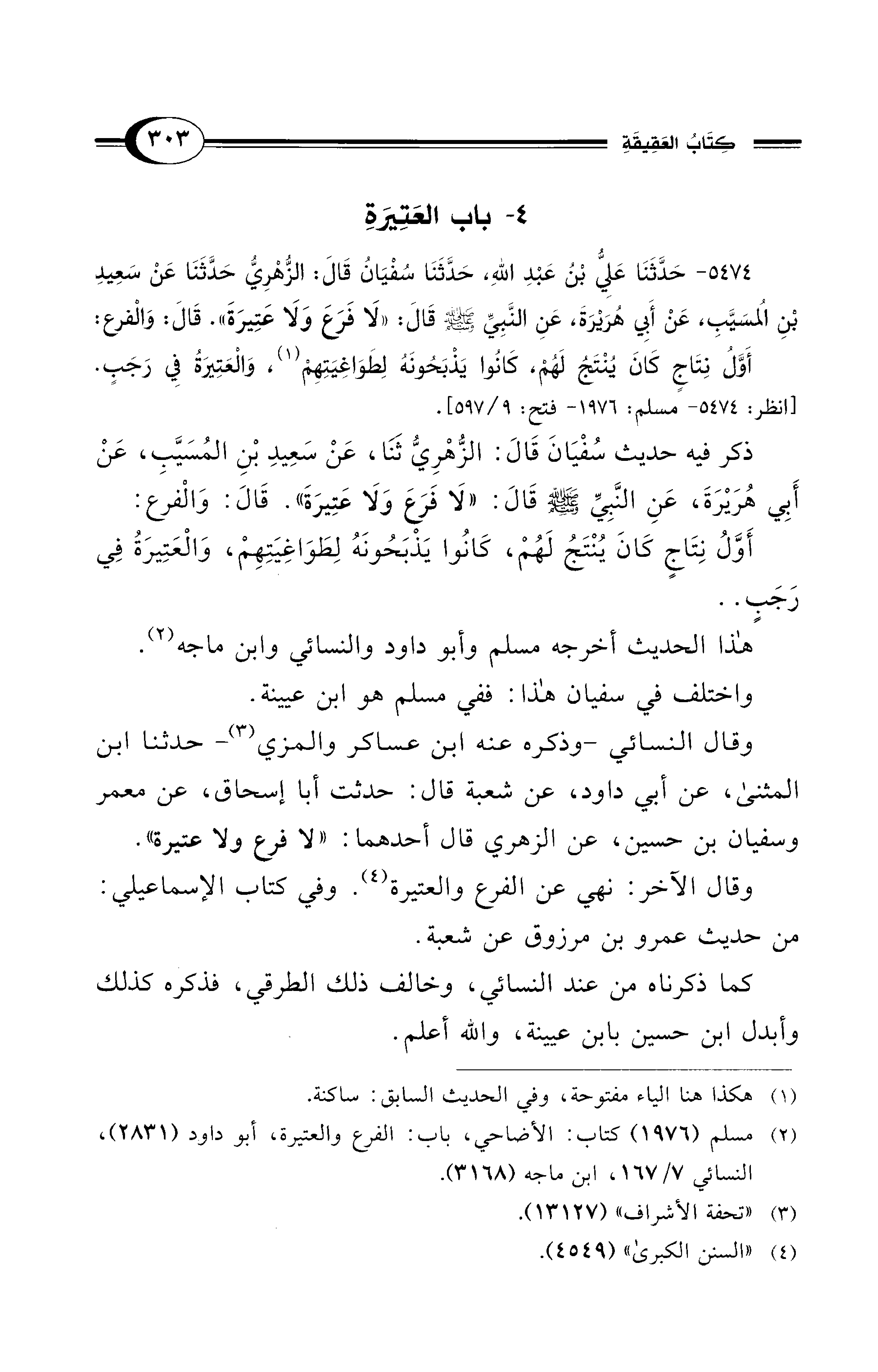 ذكر فيه حديث سُفْيَانَ قَالَ: الزُّهْرِيُّ ثَنَا، عَنْ سعِيدِ بْنِ المُسَيَّبِ، عَنْ أَبِي هُرَيْرَةَ، عَنِ النَّبِيِّ - صلى الله عليه وسلم - قَالَ: "لَا فَرَعَ وَلَا عَتِيرَةَ". قَالَ: وَالْفرع: أَوَّلُ نِتَاجٍ كَانَ يُنْتَجُ لَهُمْ، كَانُوا يَذْبَحُونَهُ لِطَوَاغِيَتِهِمْ، وَالْعَتِيرَةُ فِي رجب ..