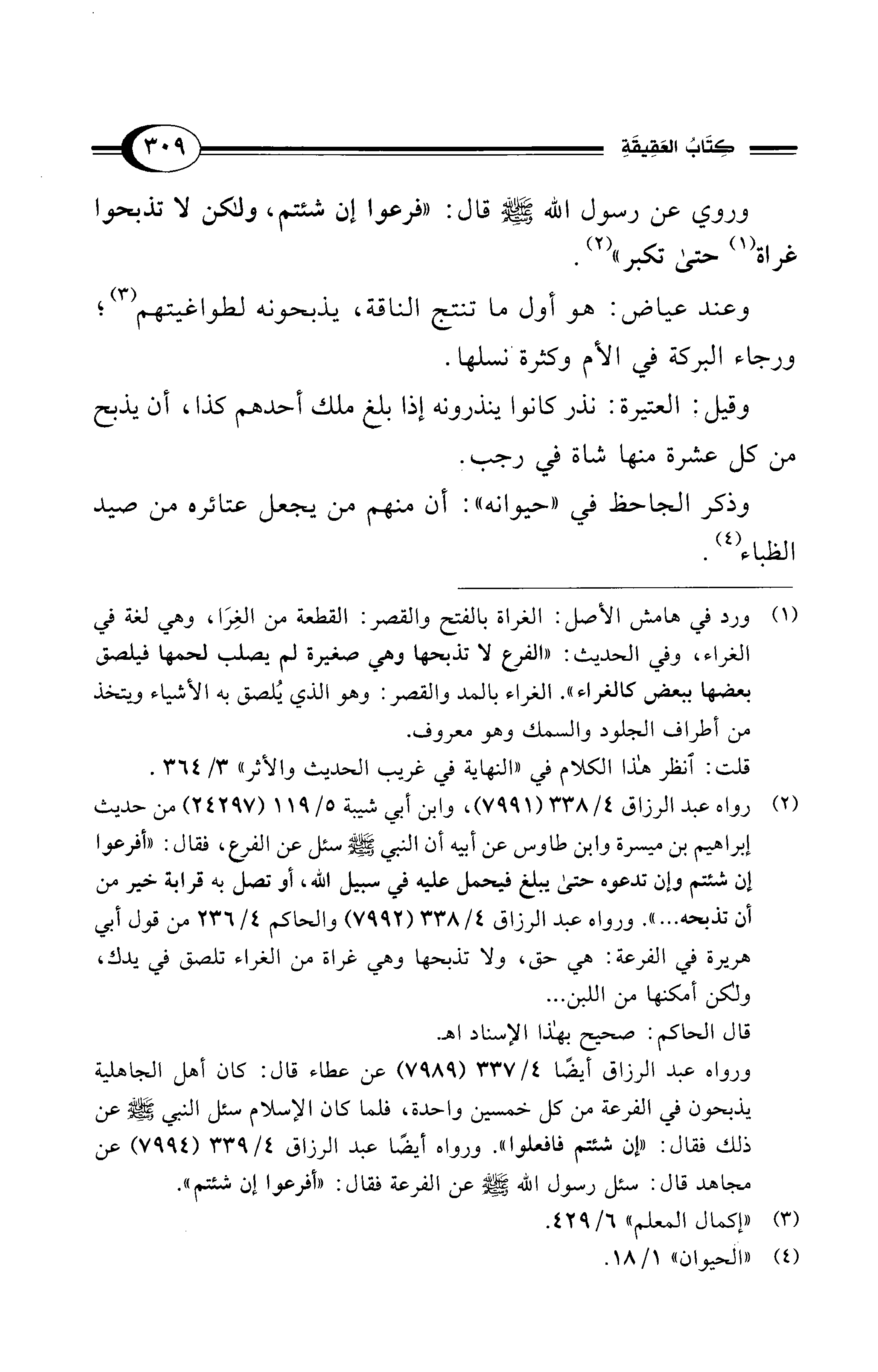 (¬2) رواه عبد الرزاق 4/ 338 (7991)، وابن أبي شيبة 5/ 119 (24297) من حديث إبراهيم بن ميسرة وابن طاوس عن أبيه أن النبي - صلى الله عليه وسلم - سئل عن الفرع، فقال: "أفرعوا إن شئتم وإن تدعوه حتى يبلغ فيحمل عليه في سبيل الله، أو تصل به قرابة خير من أن تذبحه ... ". ورواه عبد الرزاق 4/ 338 (7992) والحاكم 4/ 236 من قول أبي هريرة في الفرعة: هي حق، ولا تذبحها وهي غراة من الغراء تلصق في يدك، ولكن أمكنها من اللبن ...