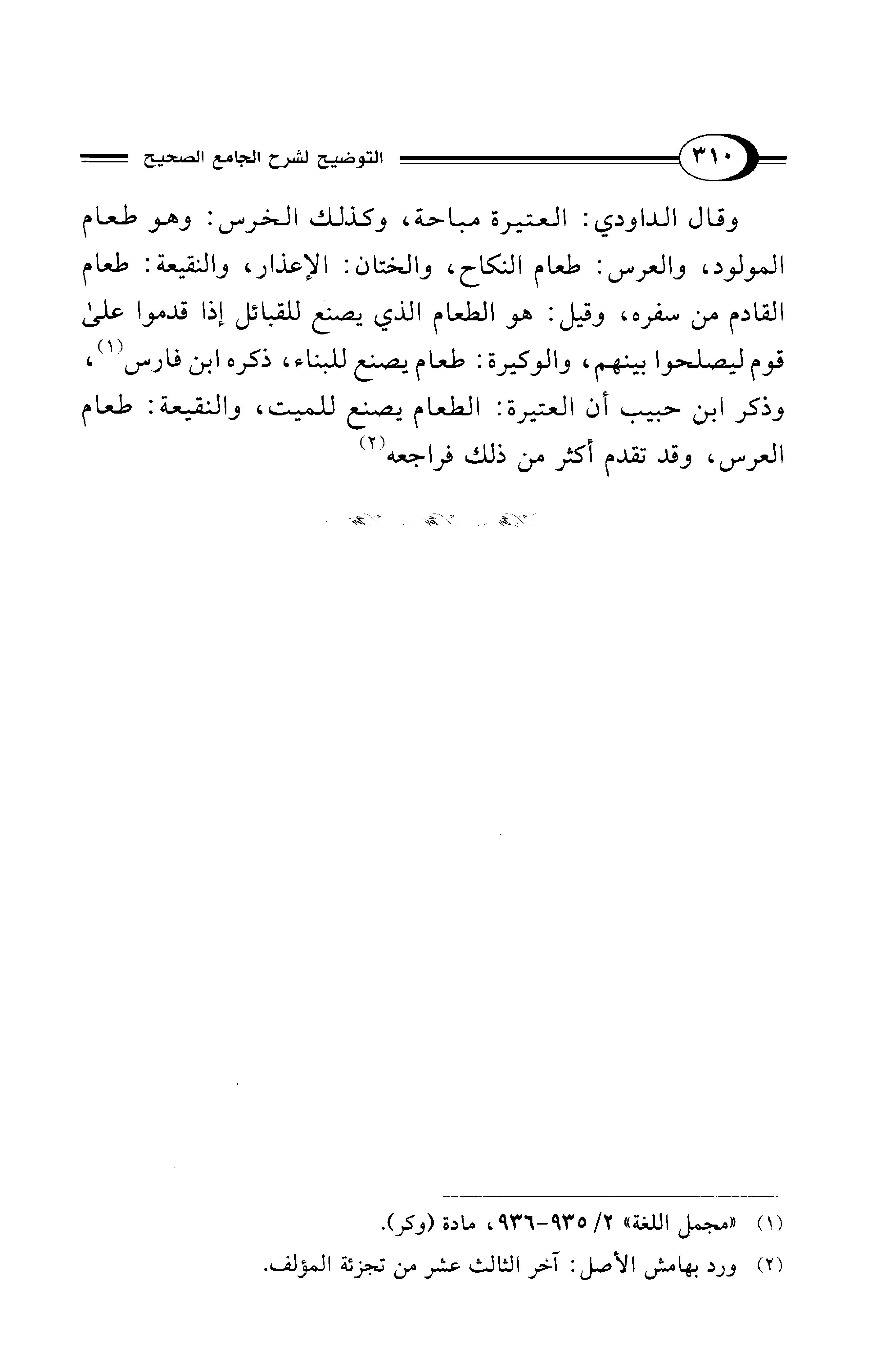 وقال الداودي: العتيرة مباحة، وكذلك الخرس: وهو طعام المولود، والعرس: طعام النكاح، والختان: الإعذار، والنقيعة: طعام القادم من سفره، وقيل: هو الطعام الذي يصنع للقبائل إذا قدموا على قوم ليصلحوا بينهم، والوكيرة: طعام يصنع للبناء، ذكره ابن فارس (¬1)، وذكر ابن حبيب أن العتيرة: الطعام يصنع للميت، والنقيعة: طعام العرس، وقد تقدم أكثر من ذلك فراجعه (¬2)