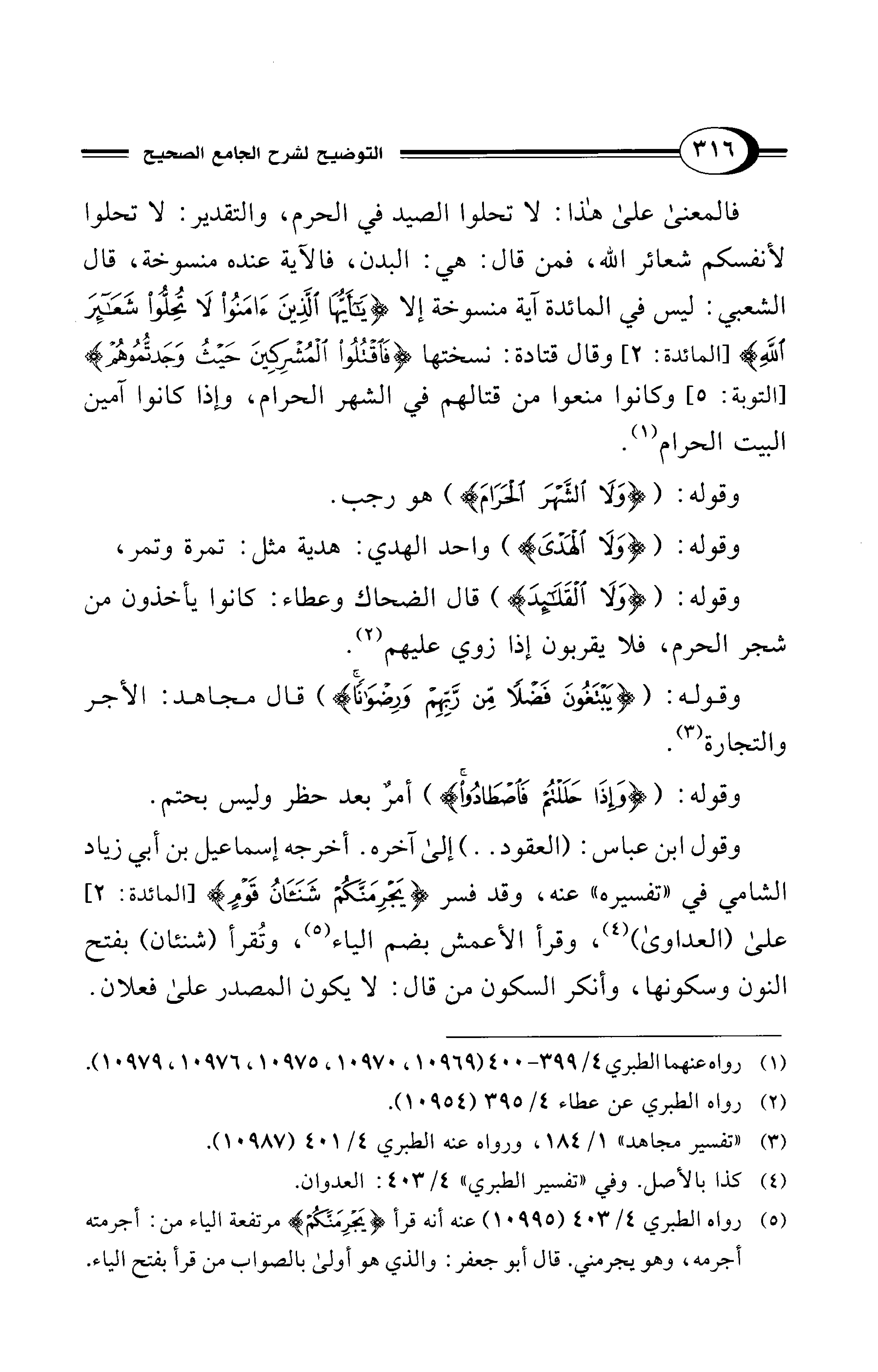 فالمعنى على هذا: لا تحلوا الصيد في الحرم، والتقدير: لا تحلوا لأنفسكم شعائر الله، فمن قال: هي: البدن، فالآية عنده منسوخة، قال الشعبي: ليس في المائدة آية منسوخة إلا {يَا أَيُّهَا الَّذِينَ آمَنُوا لَا تُحِلُّوا شَعَائِرَ اللهِ} [المائدة: 2] وقال قتادة: نسختها {فَاقْتُلُوا الْمُشْرِكِينَ حَيْثُ وَجَدْتُمُوهُمْ} [التوبة: 5] وكانوا منعوا من قتالهم في الشهر الحرام، وإذا كانوا آمين البيت الحرام (¬1).