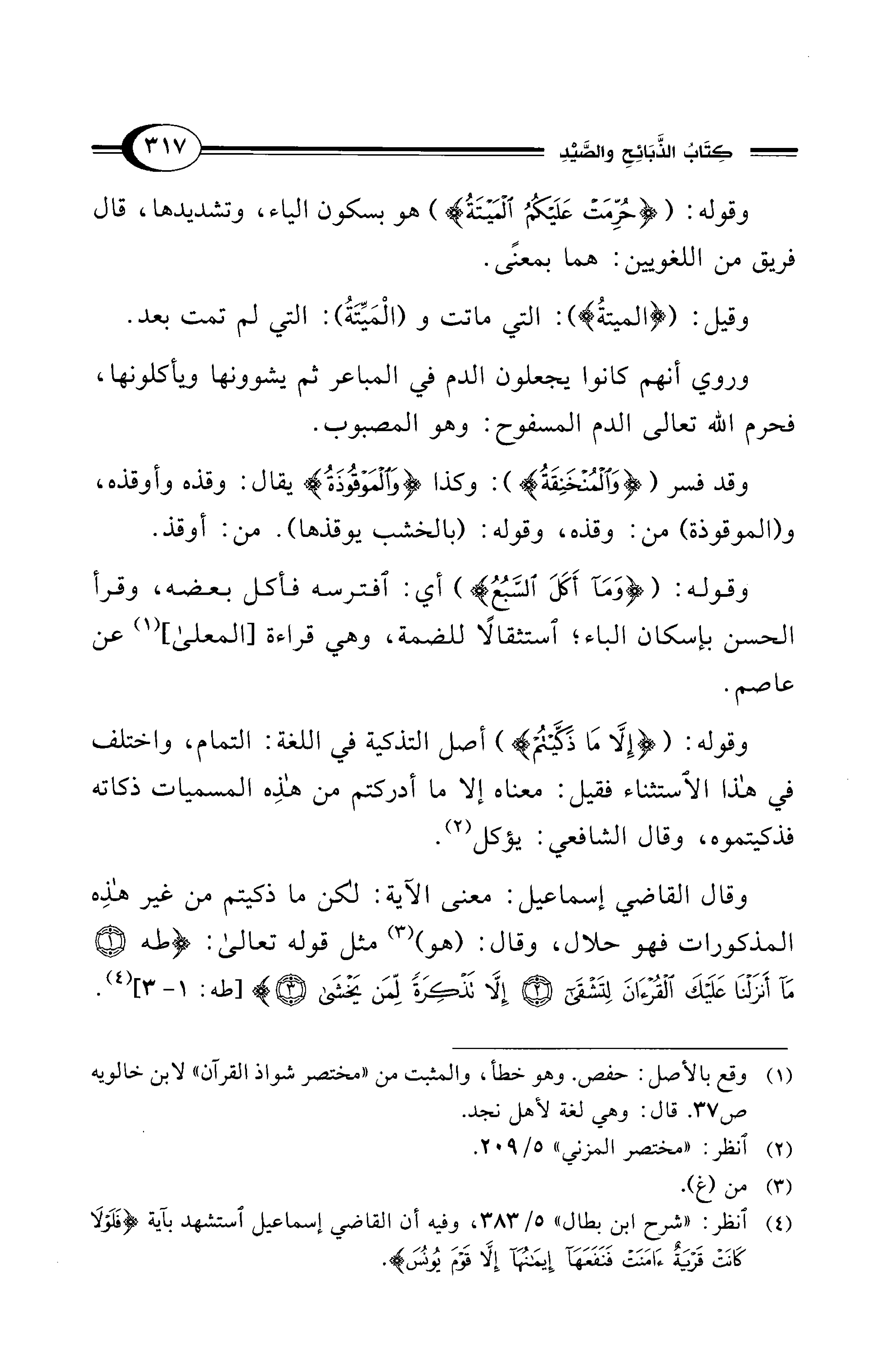 وقال القاضي إسماعيل: معنى الآية: لكن ما ذكيتم من غير هذِه المذكورات فهو حلال، وقال: (هو) (¬3) مثل قوله تعالى: {طه (1) مَا أَنْزَلْنَا عَلَيْكَ الْقُرْآنَ لِتَشْقَى (2) إِلَّا تَذْكِرَةً لِمَنْ يَخْشَى (3)} [طه: 1 - 3] (¬4).
