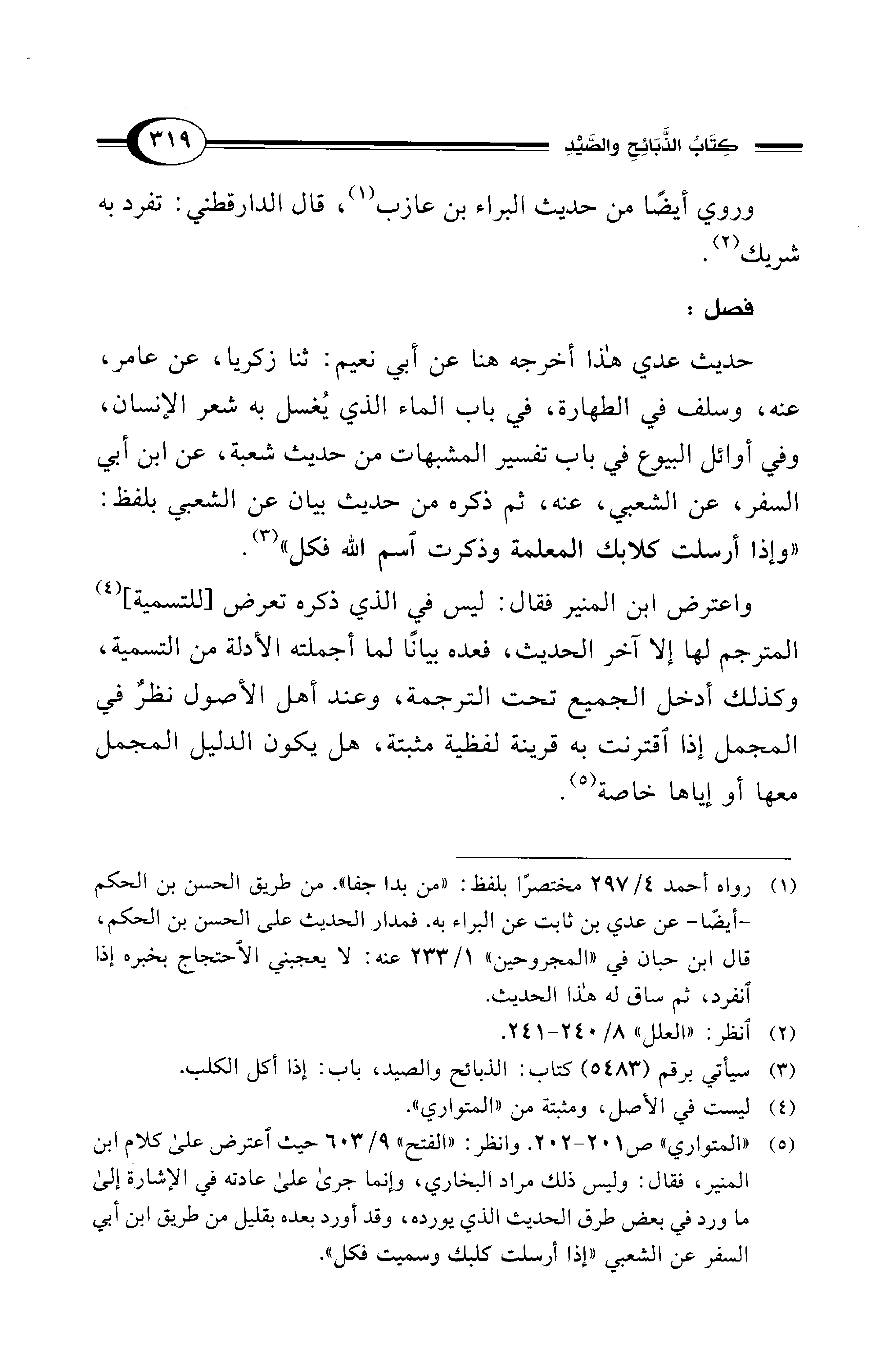 (¬5) "المتواري" ص 201 - 202. وانظر: "الفتح" 9/ 603 حيث اعترض على كلام ابن المنير، فقال: وليس ذلك مراد البخاري، وإنما جرى على عادته في الإشارة إلى ما ورد في بعض طرق الحديث الذي يورده، وقد أورد بعده بقليل من طريق ابن أبي السفر عن الشعبي "إذا أرسلت كلبك وسميت فكل".