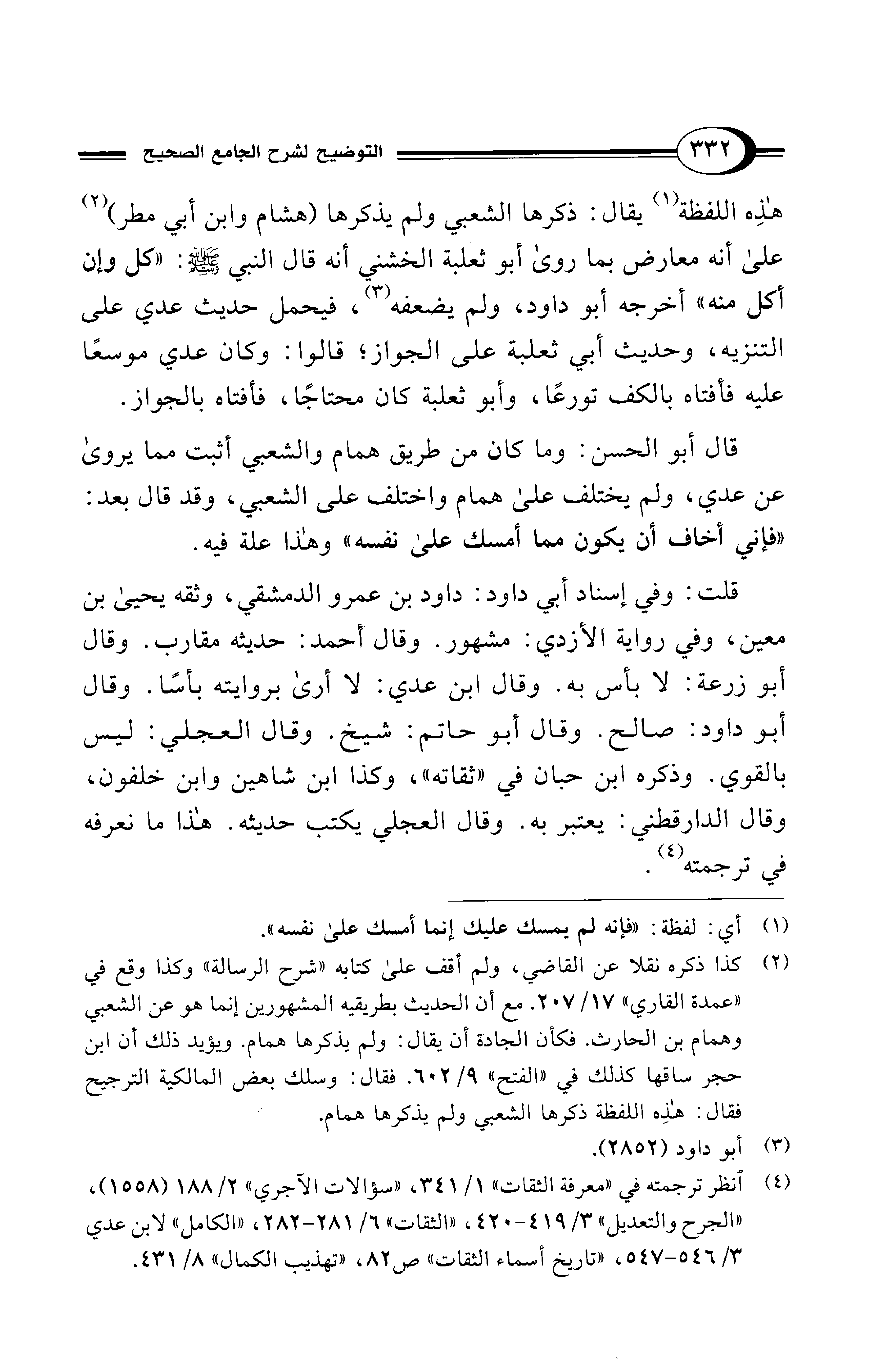 هذِه اللفظة (¬1) يقال: ذكرها الشعبي ولم يذكرها (هشام وابن أبي مطر) (¬2) على أنه معارض بما روى أبو ثعلبة الخشني أنه قال النبي - صلى الله عليه وسلم -: "كل وإن أكل منه" أخرجه أبو داود، ولم يضعفه (¬3)، فيحمل حديث عدي على التنزيه، وحديث أبي ثعلبة على الجواز؛ قالوا: وكان عدي موسعًا عليه فأفتاه بالكف تورعًا، وأبو ثعلبة كان محتاجًا، فأفتاه بالجواز.