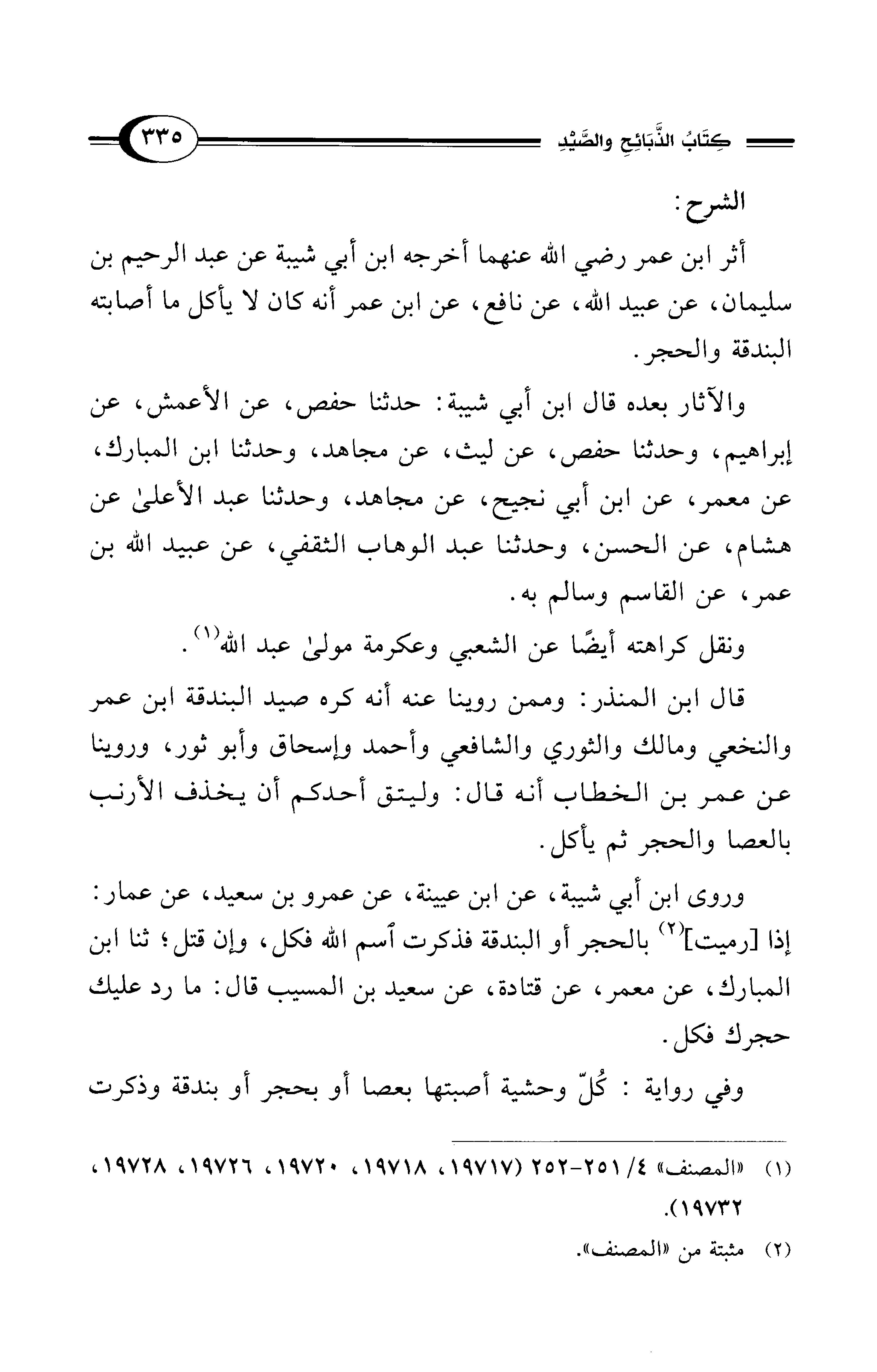 أثر ابن عمر - رضي الله عنهما - أخرجه ابن أبي شيبة عن عبد الرحيم بن سليمان، عن عبيد الله، عن نافع، عن ابن عمر أنه كان لا يأكل ما أصابته البندقة والحجر.