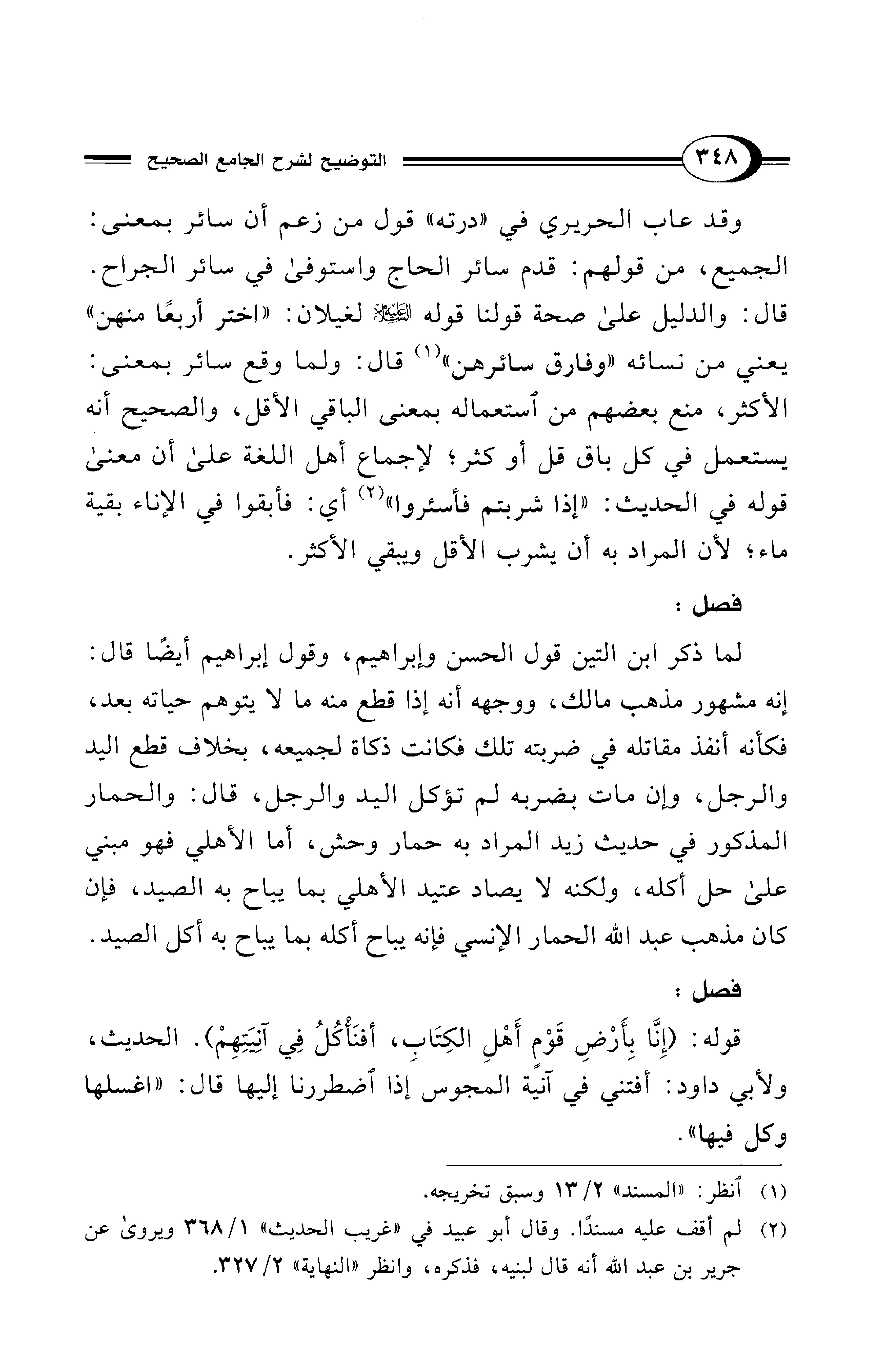وقد عاب الحريري في "درته" قول من زعم أن سائر بمعنى: الجميع، من قولهم: قدم سائر الحاج واستوفى في سائر الجراح. قال: والدليل على صحة قولنا قوله - عليه السلام - لغيلان: "اختر أربعًا منهن" يعني من نسائه "وفارق سائرهن" (¬1) قال: ولما وقع سائر بمعنى: الأكثر، منع بعضهم من استعماله بمعنى الباقي الأقل، والصحيح أنه يستعمل في كل باق قل أو كثر؛ لإجماع أهل اللغة على أن معنى قوله في الحديث: "إذا شربتم فأسئروا" (¬2) أي: فأبقوا في الإناء بقية ماء؛ لأن المراد به أن يشرب الأقل ويبقي الأكثر.