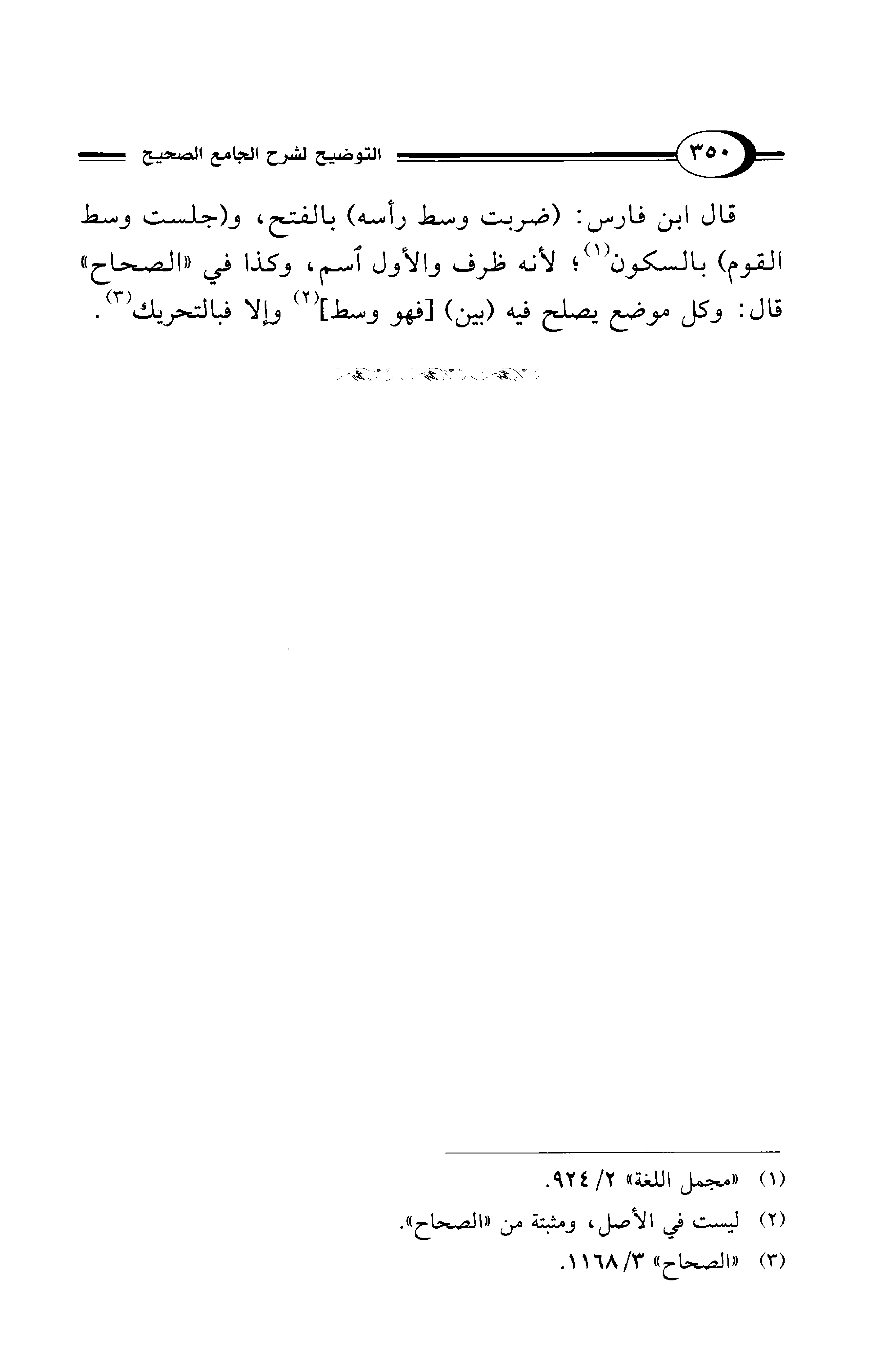 قال ابن فارس: (ضربت وسط رأسه) بالفتح، و (جلست وسط القوم) بالسكون (¬1)؛ لأنه ظرف والأول اسم، وكذا في "الصحاح" قال: وكل موضع يصلح فيه (بين) [فهو وسط] (¬2) وإلا فبالتحريك (¬3).