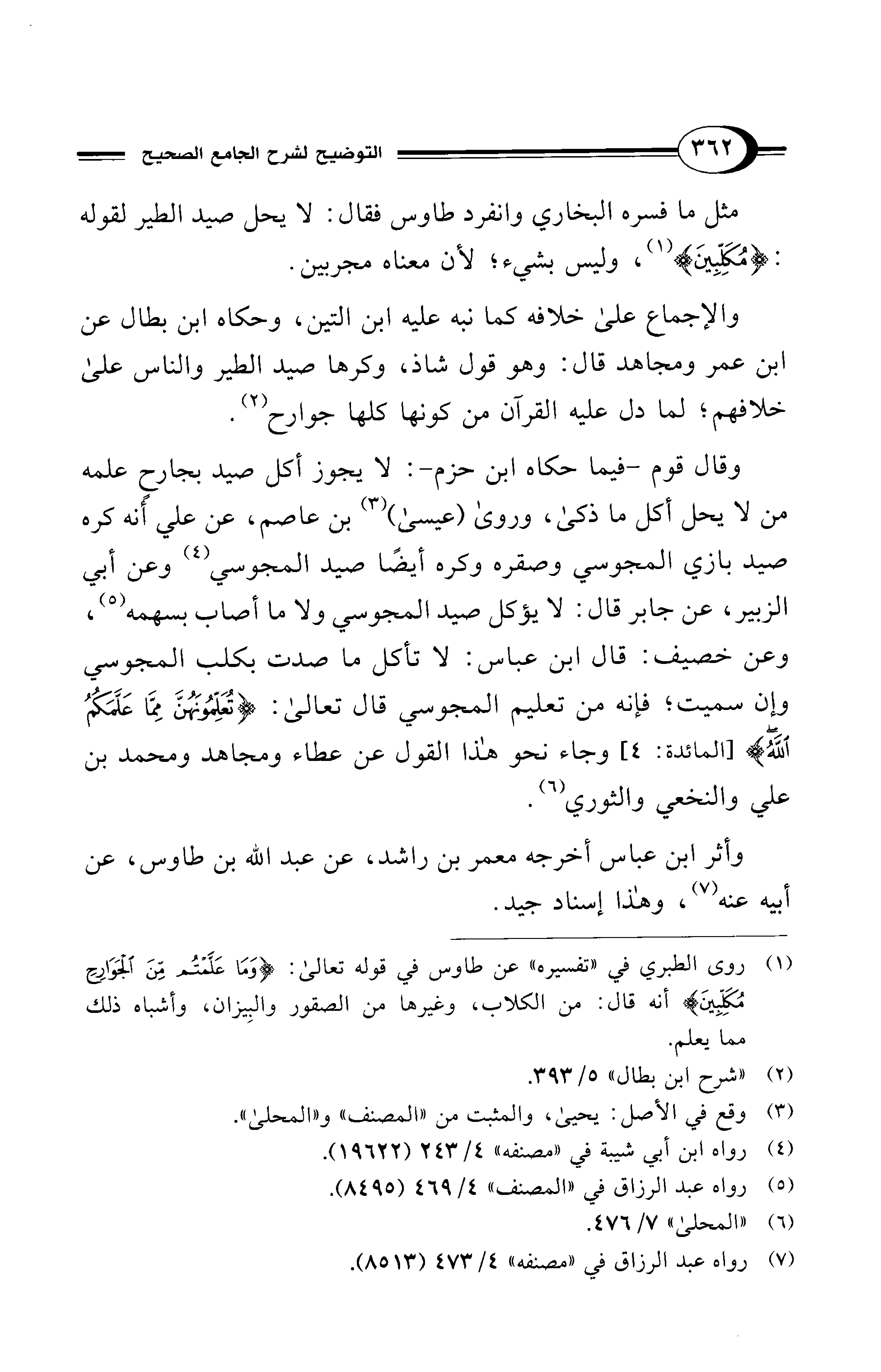 (¬1) روى الطبري في "تفسيره" عن طاوس في قوله تعالى: {وَمَا عَلَّمْتُمْ مِنَ الْجَوَارِحِ مُكَلِّبِينَ} أنه قال: من الكلاب، وغيرها من الصقور والبِيزان، وأشباه ذلك مما يعلم.