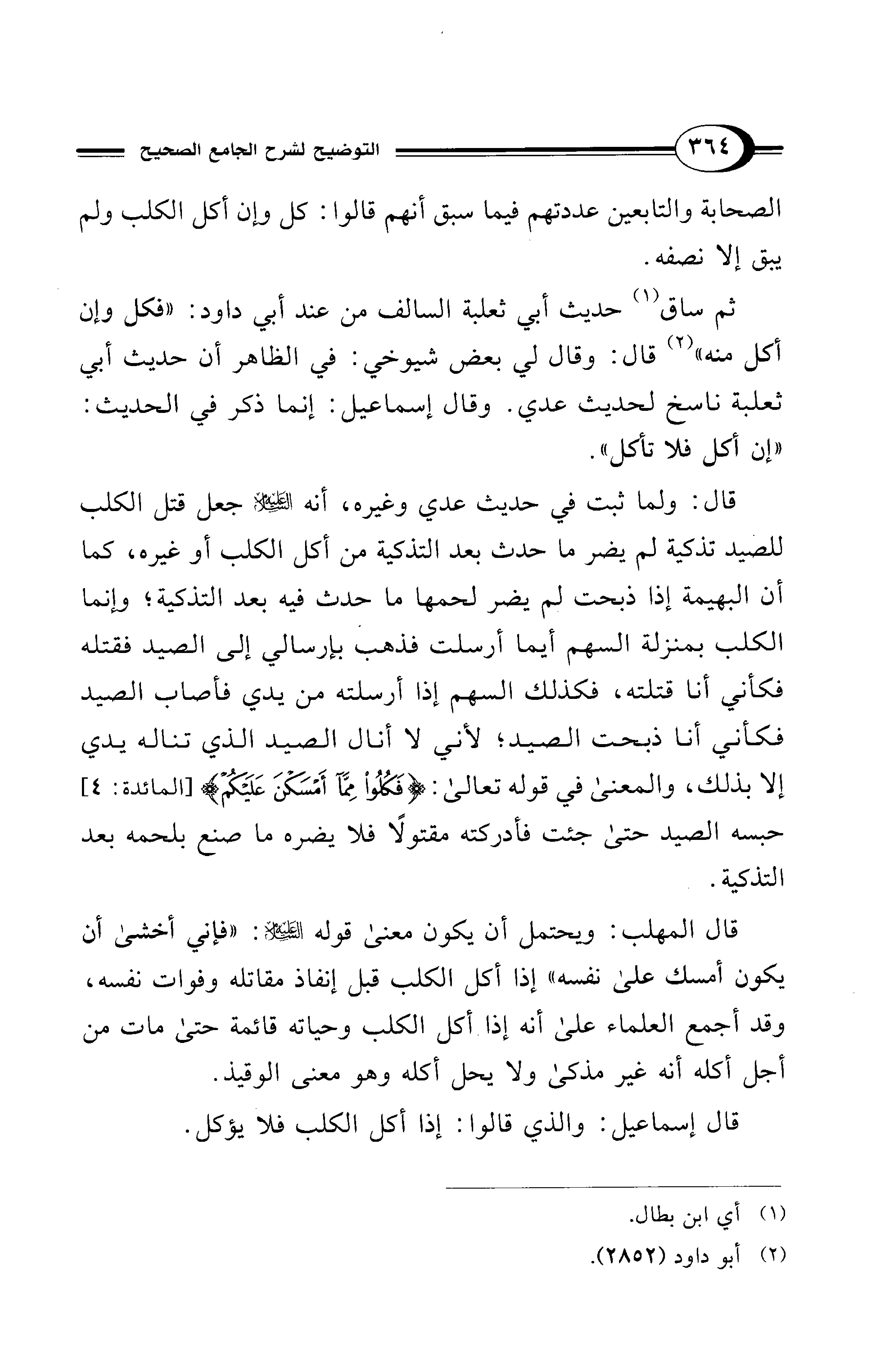 قال: ولما ثبت في حديث عدي وغيره، أنه - عليه السلام - جعل قتل الكلب للصيد تذكية لم يضر ما حدث بعد التذكية من أكل الكلب أو غيره، كما أن البهيمة إذا ذبحت لم يضر لحمها ما حدث فيه بعد التذكية؛ وإنما الكلب بمنزلة السهم أيما أرسلت فذهب بإرسالي إلى الصيد فقتله فكأني أنا قتلته، فكذلك السهم إذا أرسلته من يدي فأصاب الصيد فكأني أنا ذبحت الصيد؛ لأني لا أنال الصيد الذي تناله يدي إلا بذلك، والمعنى في قوله تعالى: {فَكُلُوا مِمَّا أَمْسَكْنَ عَلَيْكُمْ} [المائدة: 4] حبسه الصيد حتى جئت فأدركته مقتولًا فلا يضره ما صنع بلحمه بعد التذكية.