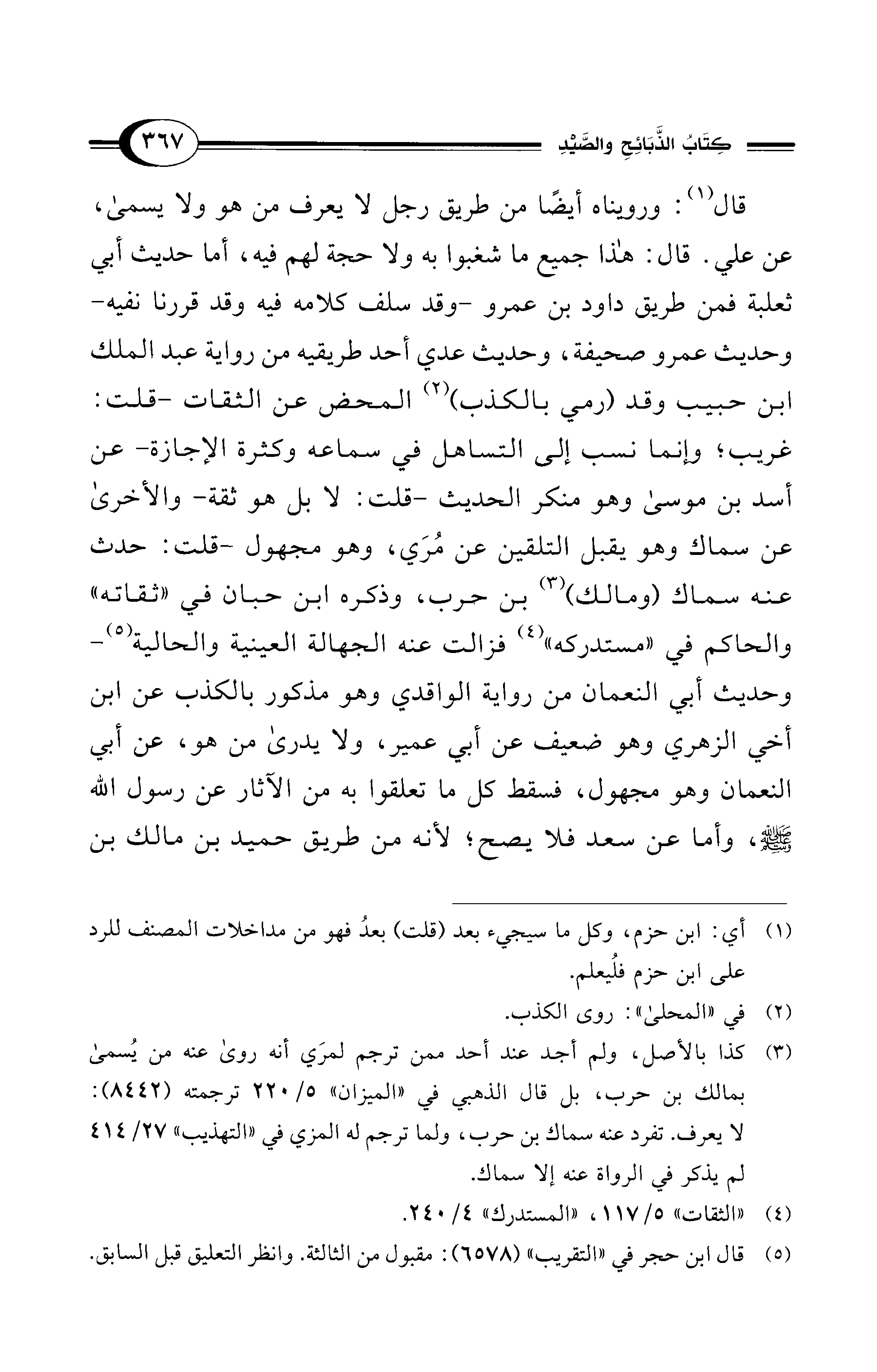 قال (¬1): ورويناه أيضًا من طريق رجل لا يعرف من هو ولا يسمى، عن علي. قال: هذا جميع ما شغبوا به ولا حجة لهم فيه، أما حديث أبي ثعلبة فمن طريق داود بن عمرو -وقد سلف كلامه فيه وقد قررنا نفيه- وحديث عمرو صحيفة، وحديث عدي أحد طريقيه من رواية عبد الملك ابن حبيب وقد (رمي بالكذب) (¬2) المحض عن الثقات -قلت: غريب؛ وإنما نسب إلى التساهل في سماعه وكثرة الإجازة- عن أسد بن موسى وهو منكر الحديث -قلت: لا بل هو ثقة- والأخرى عن سماك وهو يقبل التلقين عن مُرَي، وهو مجهول -قلت: حدث عنه سماك (ومالك) (¬3) بن حرب، وذكره ابن حبان في "ثقاته" والحاكم في "مستدركه" (¬4) فزالت عنه الجهالة العينية والحالية (¬5) - وحديث أبي النعمان من رواية الواقدي وهو مذكور بالكذب عن ابن أخي الزهري وهو ضعيف عن أبي عمير، ولا يدرى من هو، عن أبي النعمان وهو مجهول، فسقط كل ما تعلقوا به من الآثار عن رسول الله - صلى الله عليه وسلم -، وأما عن سعد فلا يصح؛ لأنه من طريق حميد بن مالك بن