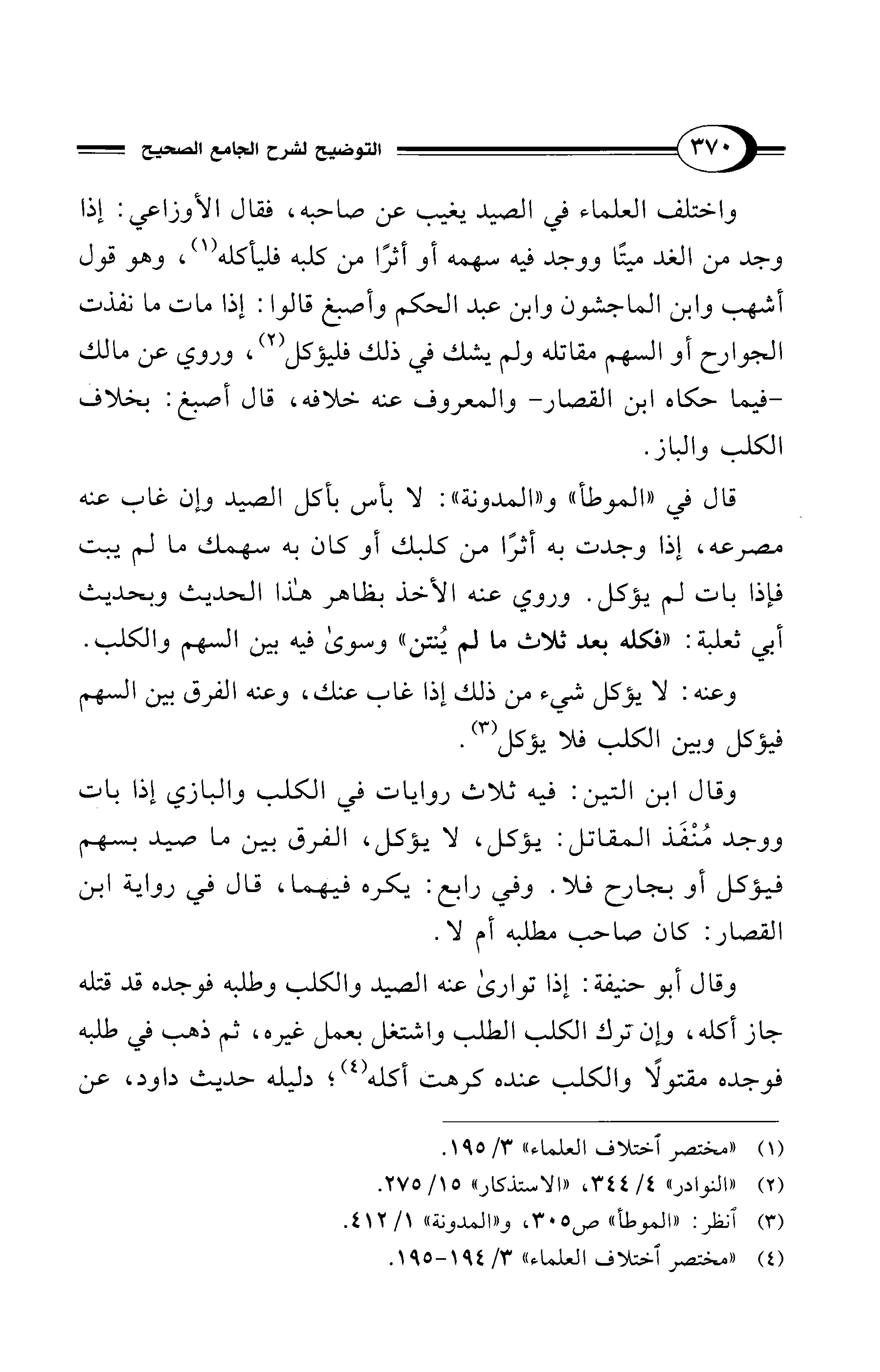 واختلف العلماء في الصيد يغيب عن صاحبه، فقال الأوزاعي: إذا وجد من الغد ميتًا ووجد فيه سهمه أو أثرًا من كلبه فليأكله (¬1)، وهو قول أشهب وابن الماجشون وابن عبد الحكم وأصبغ قالوا: إذا مات ما نفذت الجوارح أو السهم مقاتله ولم يشك في ذلك فليؤكل (¬2)، وروي عن مالك -فيما حكاه ابن القصار- والمعروف عنه خلافه، قال أصبغ: بخلاف الكلب والباز.