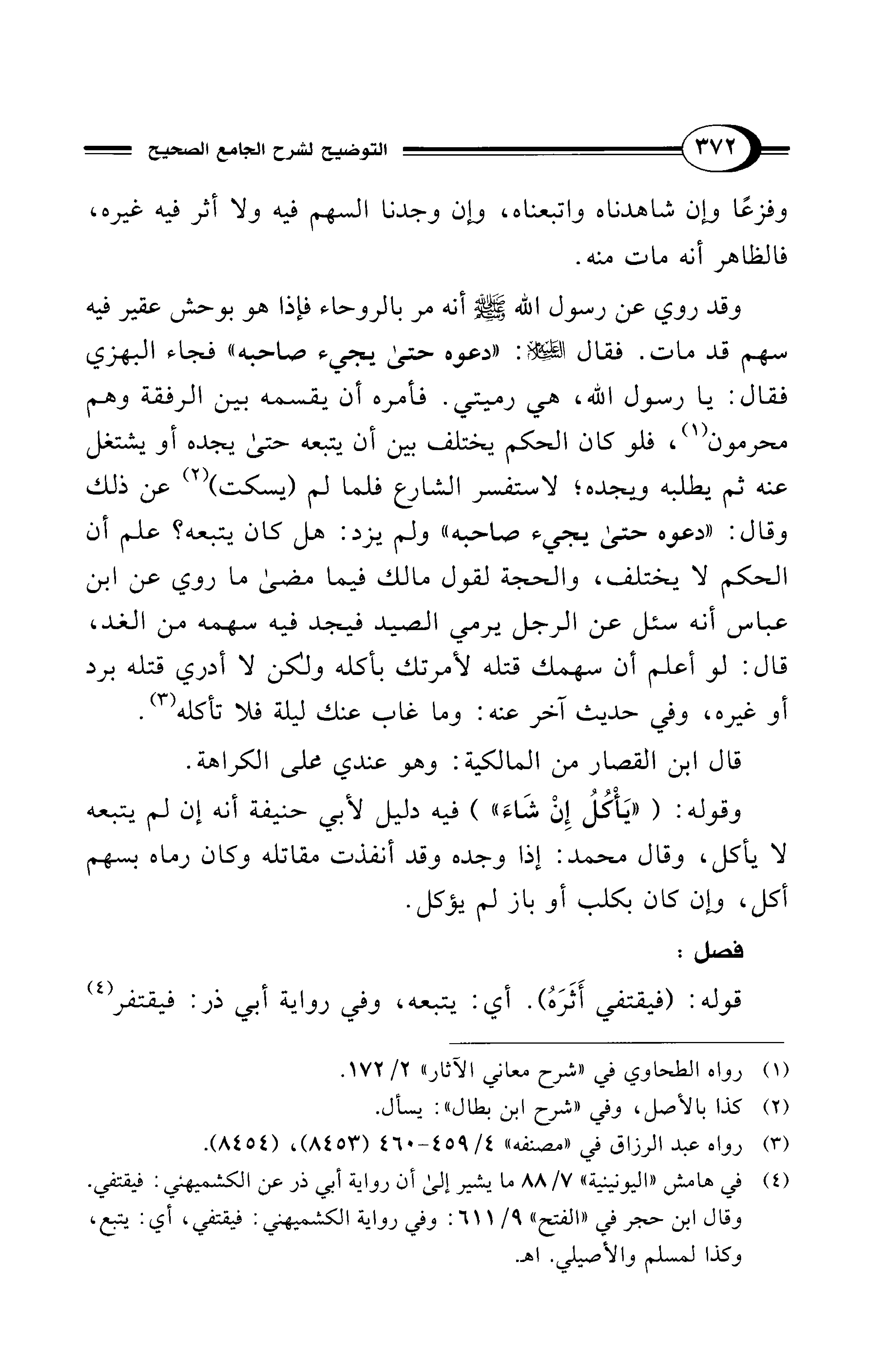 وقد روي عن رسول الله - صلى الله عليه وسلم - أنه مر بالروحاء فإذا هو بوحش عقير فيه سهم قد مات. فقال - عليه السلام -: "دعوه حتى يجيء صاحبه" فجاء البهزي فقال: يا رسول الله، هي رميتي. فأمره أن يقسمه بين الرفقة وهم محرمون (¬1)، فلو كان الحكم يختلف بين أن يتبعه حتى يجده أو يشتغل عنه ثم يطلبه ويجده؛ لاستفسر الشارع فلما لم (يسكت) (¬2) عن ذلك وقال: "دعوه حتى يجيء صاحبه" ولم يزد: هل كان يتبعه؟ علم أن الحكم لا يختلف، والحجة لقول مالك فيما مضى ما روي عن ابن عباس أنه سئل عن الرجل يرمي الصيد فيجد فيه سهمه من الغد، قال: لو أعلم أن سهمك قتله لأمرتك بأكله ولكن لا أدري قتله برد أو غيره، وفي حديث آخر عنه: وما غاب عنك ليلة فلا تأكله (¬3).