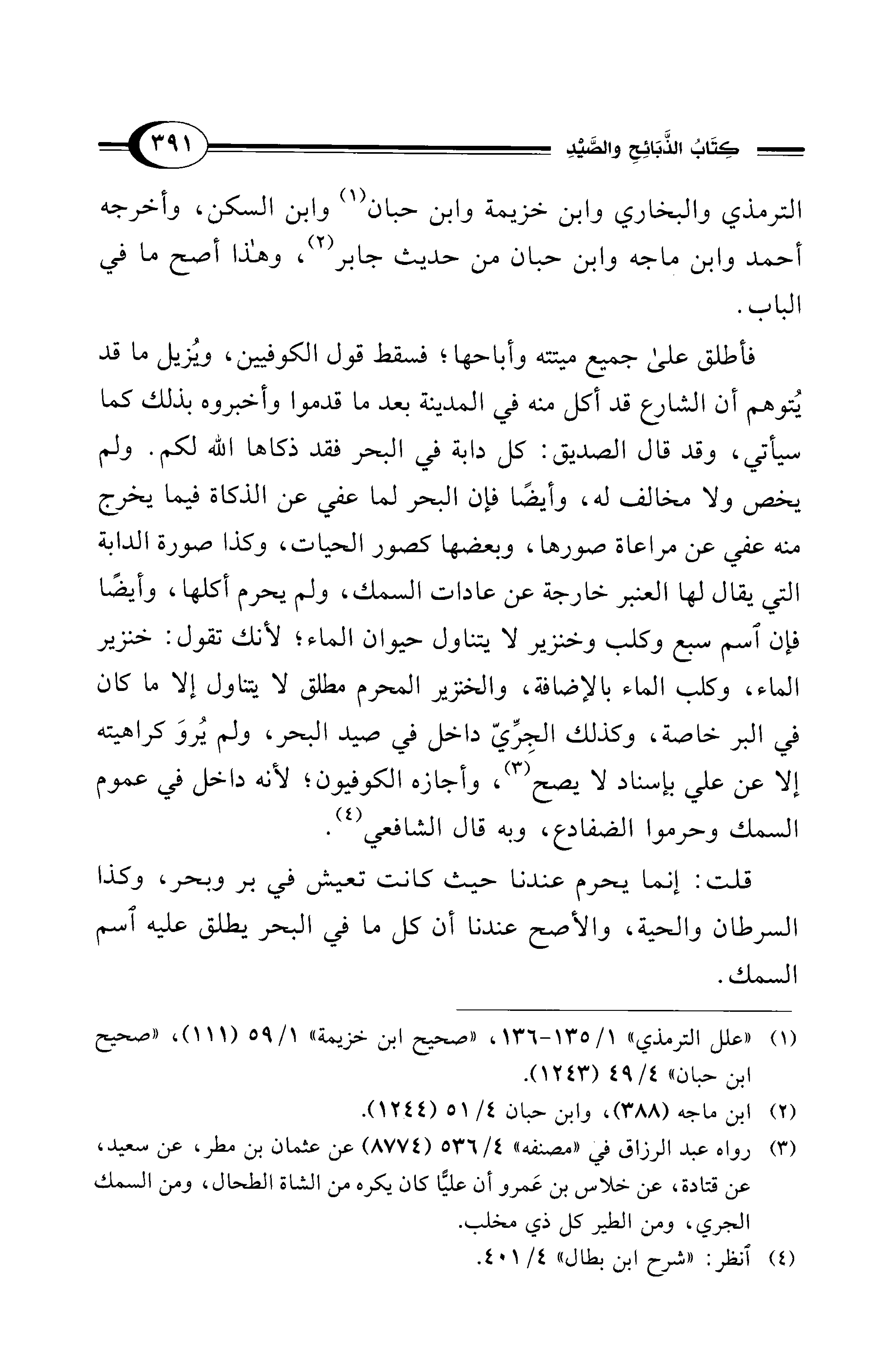 فأطلق على جميع ميتته وأباحها؛ فسقط قول الكوفيين، وُيزيل ما قد يُتوهم أن الشارع قد أكل منه في المدينة بعد ما قدموا وأخبروه بذلك كما سيأتي، وقد قال الصديق: كل دابة في البحر فقد ذكاها الله لكم. ولم يخص ولا مخالف له، وأيضًا فإن البحر لما عفي عن الذكاة فيما يخرج منه عفي عن مراعاة صورها، وبعضها كصور الحيات، وكذا صورة الدابة التي يقال لها العنبر خارجة عن عادات السمك، ولم يحرم أكلها، وأيضًا فإن اسم سبع وكلب وخنزير لا يتناول حيوان الماء؛ لأنك تقول: خنزير الماء، وكلب الماء بالإضافة، والخنزير المحرم مطلق لا يتناول إلا ما كان في البر خاصة، وكذلك الجِرِّيّ داخل في صيد البحر، ولم يُروَ كراهيته إلا عن علي بإسناد لا يصح (¬3)، وأجازه الكوفيون؛ لأنه داخل في عموم السمك وحرموا الضفادع، وبه قال الشافعي (¬4).