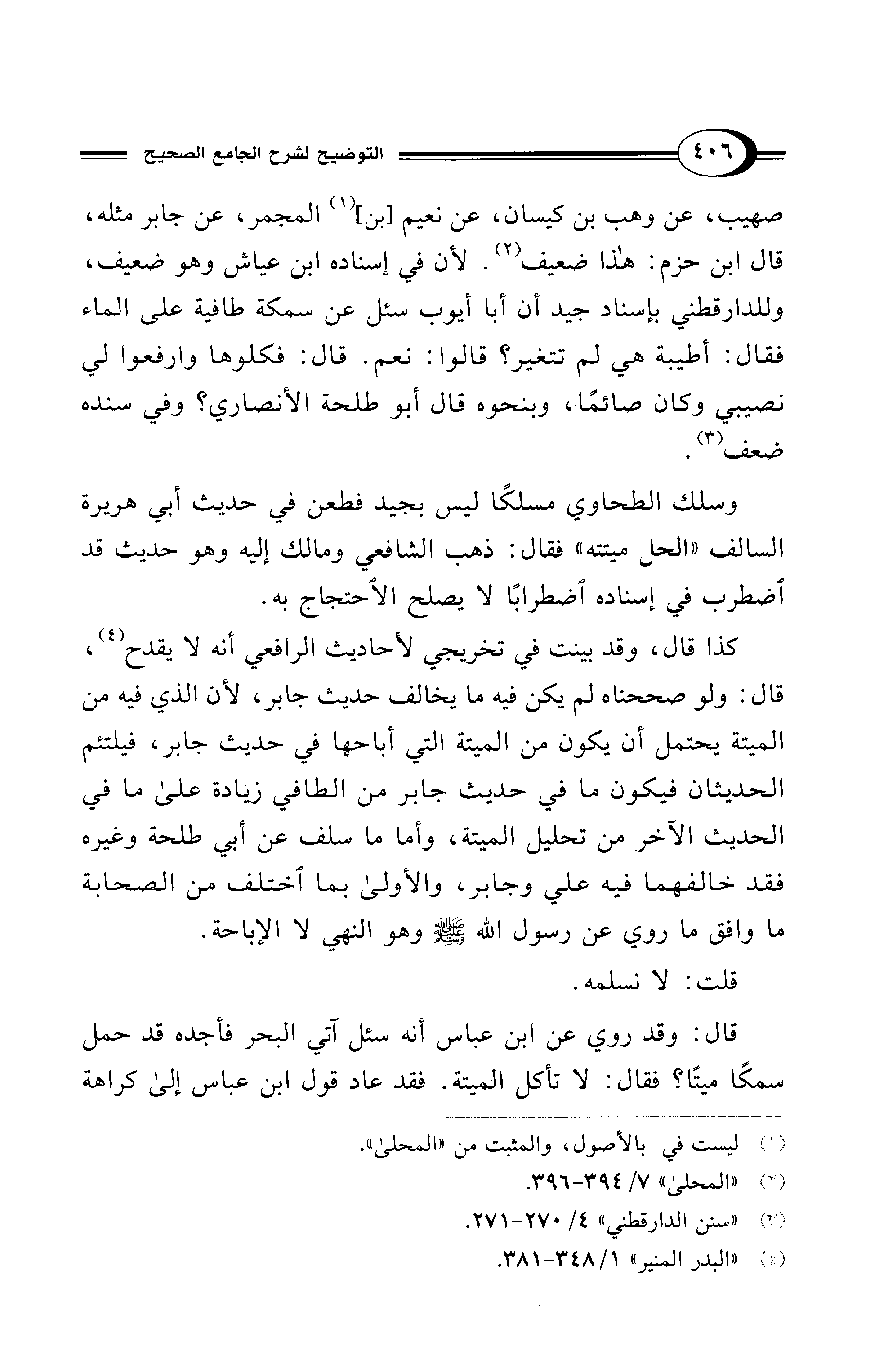 كذا قال، وقد بينت في تخريجي لأحاديث الرافعي أنه لا يقدح (¬4)، قال: ولو صححناه لم يكن فيه ما يخالف حديث جابر، لأن الذي فيه من الميتة يحتمل أن يكون من الميتة التي أباحها في حديث جابر، فيلتئم الحديثان فيكون ما في حديث جابر من الطافي زيادة على ما في الحديث الآخر من تحليل الميتة، وأما ما سلف عن أبي طلحة وغيره فقد خالفهما فيه علي وجابر، والأولى بما اختلف من الصحابة ما وافق ما روي عن رسول الله - صلى الله عليه وسلم - وهو النهي لا الإباحة.