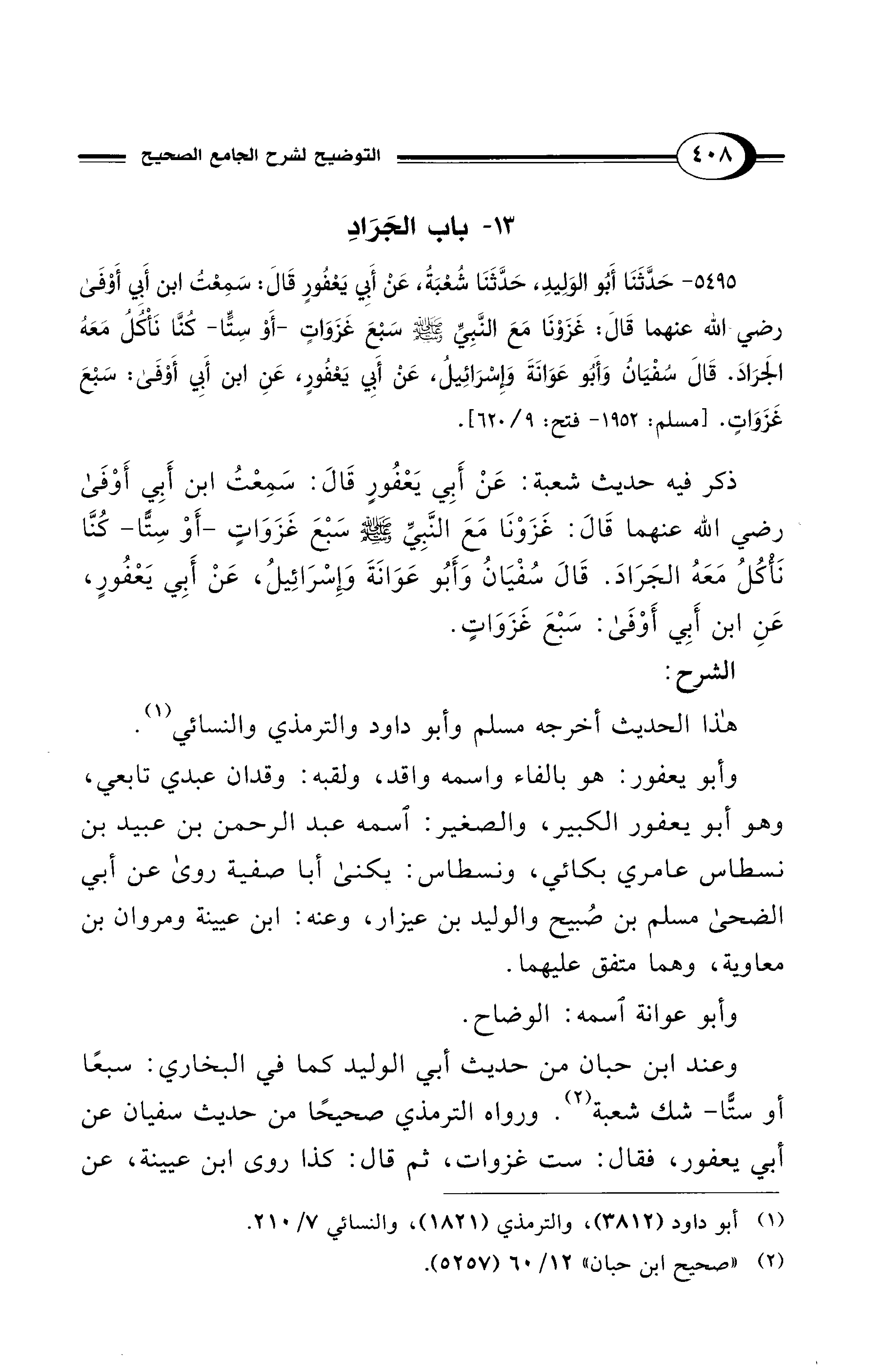 5495 - حَدَّثَنَا أَبُو الْوَلِيدِ، حَدَّثَنَا شُعْبَةُ، عَنْ أَبِي يَعْفُورٍ قَالَ: سَمِعْتُ ابْنَ أَبِي أَوْفَى - رضي الله عنهما - قَالَ: غَزَوْنَا مَعَ النَّبِيِّ - صلى الله عليه وسلم - سَبْعَ غَزَوَاتٍ -أَوْ سِتًّا- كُنَّا نَأْكُلُ مَعَهُ الْجَرَادَ. قَالَ سُفْيَانُ وَأَبُو عَوَانَةَ وَإِسْرَائِيلُ، عَنْ أَبِي يَعْفُورٍ، عَنِ ابْنِ أَبِي أَوْفَى: سَبْعَ غَزَوَاتٍ. [مسلم: 1952 - فتح: 9/ 620].