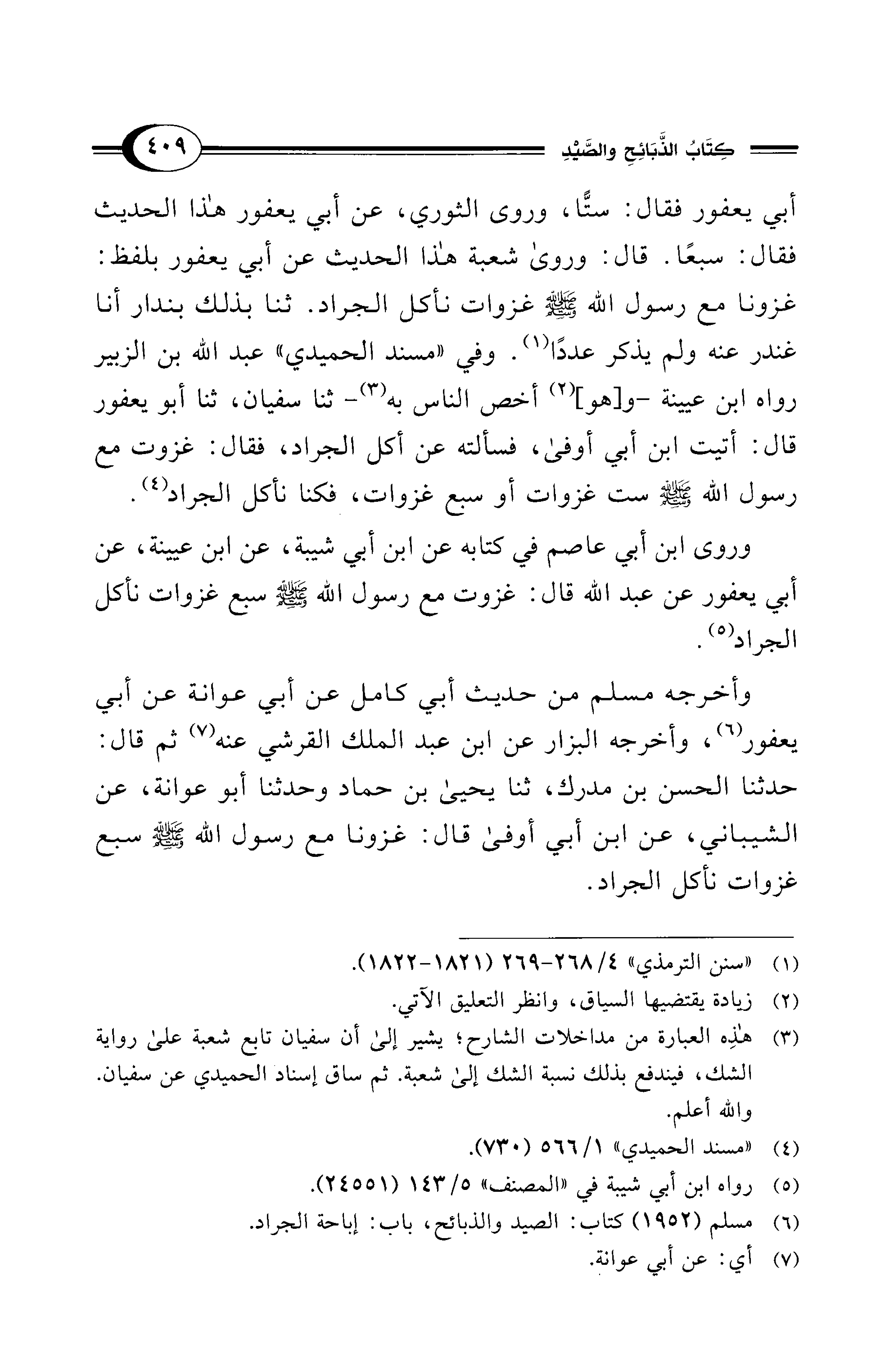 أبي يعفور فقال: ستًّا، وروى الثوري، عن أبي يعفور هذا الحديث فقال: سبعًا. قال: وروى شعبة هذا الحديث عن أبي يعفور بلفظ: غزونا مع رسول الله - صلى الله عليه وسلم - غزوات نأكل الجراد. ثنا بذلك بندار أنا غندر عنه ولم يذكر عددًا (¬1). وفي "مسند الحميدي" عبد الله بن الزبير رواه ابن عيينة -و [هو] (¬2) أخص الناس به (¬3) - ثنا سفيان، ثنا أبو يعفور قال: أتيت ابن أبي أوفى، فسألته عن أكل الجراد، فقال: غزوت مع رسول الله - صلى الله عليه وسلم - ست غزوات أو سبع غزوات، فكنا نأكل الجراد (¬4).