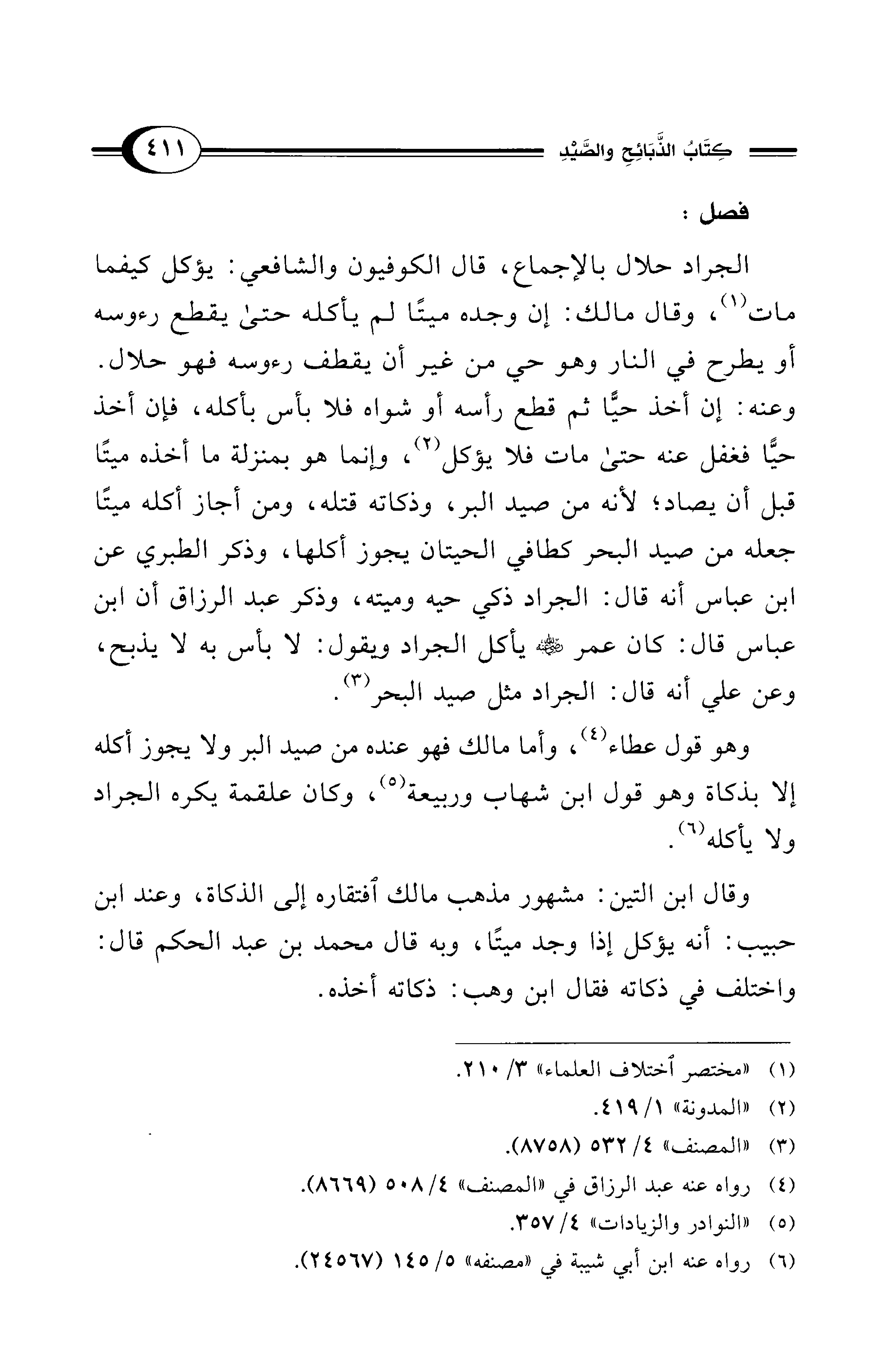 الجراد حلال بالإجماع، قال الكوفيون والشافعي: يؤكل كيفما مات (¬1)، وقال مالك: إن وجده ميتًا لم يأكله حتى يقطع رءوسه أو يطرح في النار وهو حي من غير أن يقطف رءوسه فهو حلال. وعنه: إن أخذ حيًّا ثم قطع رأسه أو شواه فلا بأس بأكله، فإن أخذ حيًّا فغفل عنه حتى مات فلا يؤكل (¬2)، وإنما هو بمنزلة ما أخذه ميتًا قبل أن يصاد؛ لأنه من صيد البر، وذكاته قتله، ومن أجاز أكله ميتًا جعله من صيد البحر كطافي الحيتان يجوز أكلها، وذكر الطبري عن ابن عباس أنه قال: الجراد ذكي حيه وميته، وذكر عبد الرزاق أن ابن عباس قال: كان عمر - رضي الله عنه - يأكل الجراد ويقول: لا بأس به لا يذبح، وعن علي أنه قال: الجراد مثل صيد البحر (¬3).