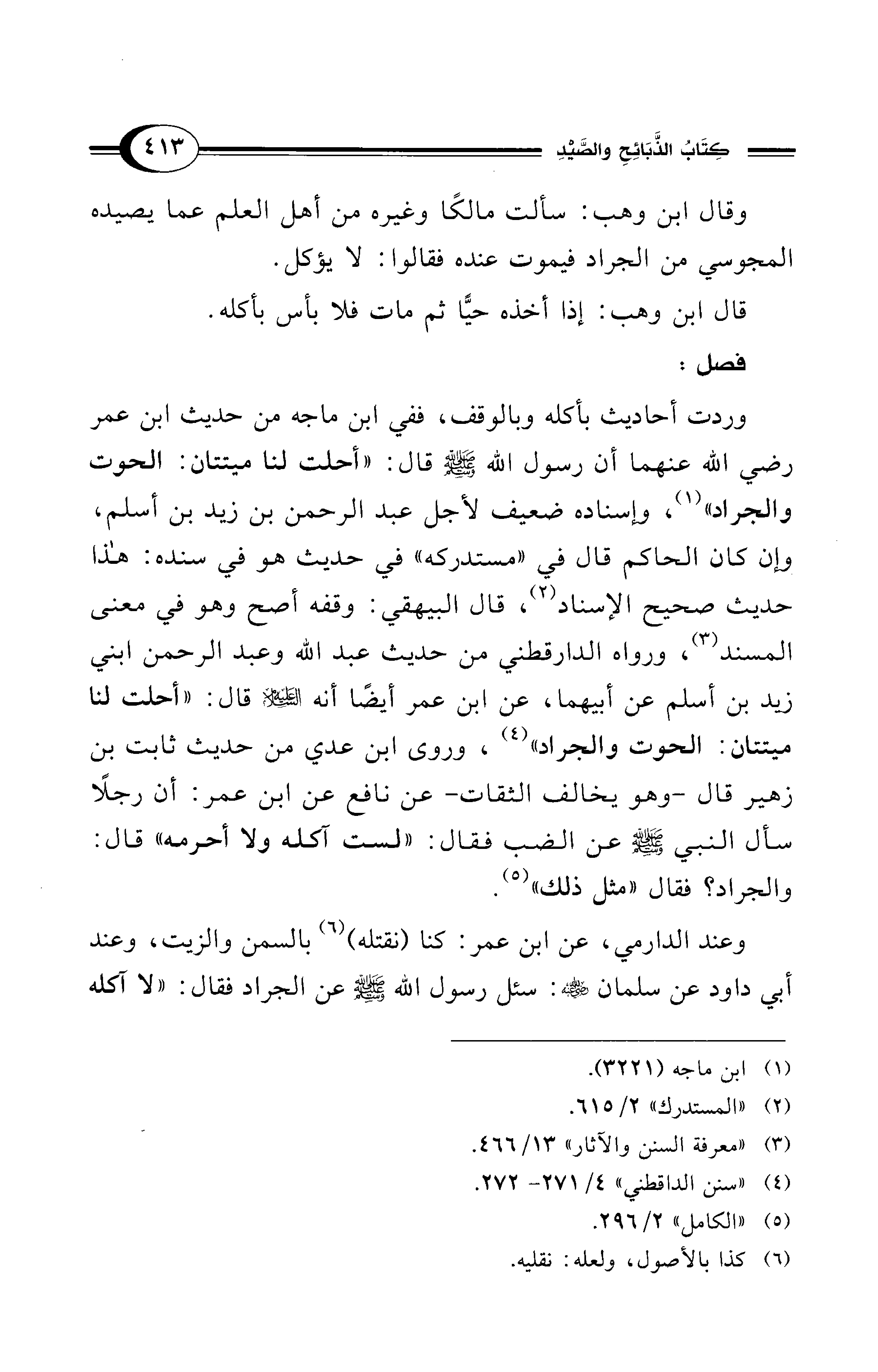 وردت أحاديث بأكله وبالوقف، ففي ابن ماجه من حديث ابن عمر - رضي الله عنهما - أن رسول الله - صلى الله عليه وسلم - قال: "أحلت لنا ميتتان: الحوت والجراد" (¬1)، وإسناده ضعيف لأجل عبد الرحمن بن زيد بن أسلم، وإن كان الحاكم قال في "مستدركه" في حديث هو في سنده: هذا حديث صحيح الإسناد (¬2)، قال البيهقي: وقفه أصح وهو في معنى المسند (¬3)، ورواه الدارقطني من حديث عبد الله وعبد الرحمن ابني زيد بن أسلم عن أبيهما، عن ابن عمر أيضًا أنه - عليه السلام - قال: "أحلت لنا ميتتان: الحوت والجراد" (¬4)، وروى ابن عدي من حديث ثابت بن زهير قال -وهو يخالف الثقات- عن نافع عن ابن عمر: أن رجلاً سأل النبي - صلى الله عليه وسلم - عن الضب فقال: "لست آكله ولا أحرمه" قال: والجراد؟ فقال "مثل ذلك" (¬5).