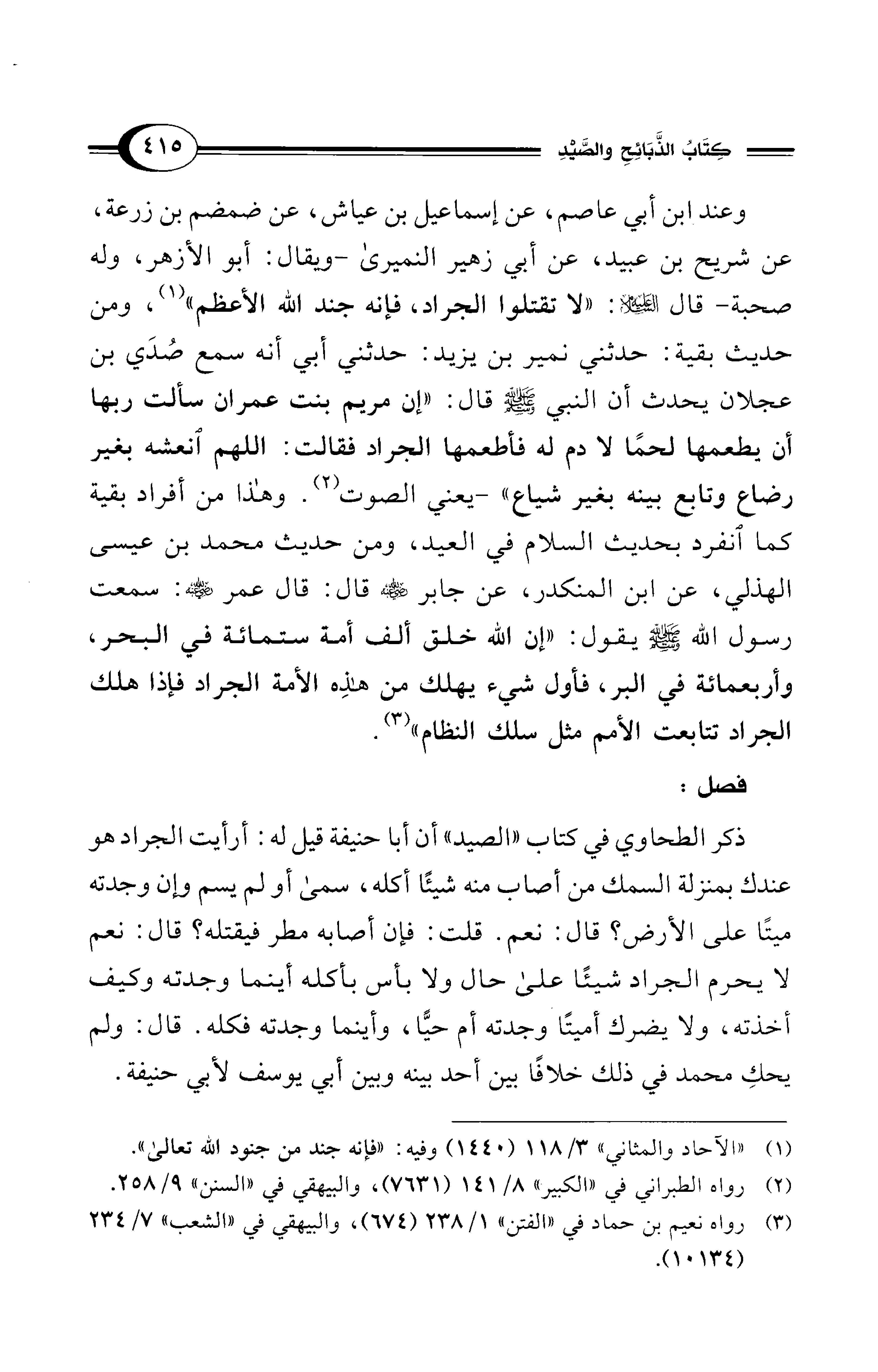 ذكر الطحاوي في كتاب "الصيد" أن أبا حنيفة قيل له: أرأيت الجراد هو عندك بمنزلة السمك من أصاب منه شيئًا أكله، سمى أو لم يسم وإن وجدته ميتًا على الأرض؟ قال: نعم. قلت: فإن أصابه مطر فيقتله؟ قال: نعم لا يحرم الجراد شيئًا على حال ولا بأس بأكله أينما وجدته وكيف أخذته، ولا يضرك أميتًا وجدته أم حيًّا، وأينما وجدته فكله. قال: ولم يحكِ محمد في ذلك خلافًا بين أحد بينه وبين أبي يوسف لأبي حنيفة.
